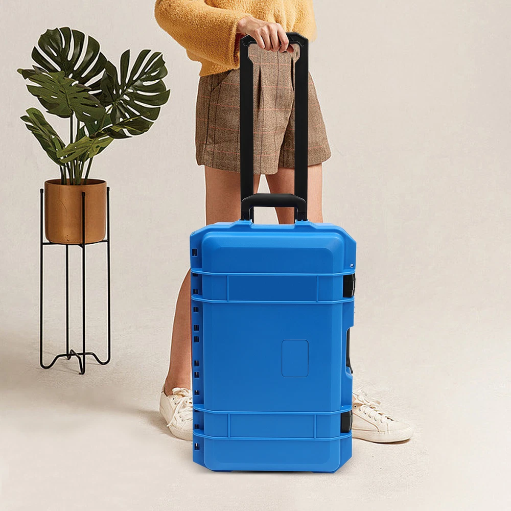 22" Camera Hard Case Protective Roller Camera Carrying Case Waterproof Dustproof Description If you are looking for an case to accommodate your valuable equipment, our protective case is exactly what you need. It will keep your watches, cameras, expensive digital equipment, and other valuables organized, safe, and gracefully displayed most charmingly . The soft sponge lining and arial-resistant PP&ABS housing will give your valuables great protection. Specifications Color: Blue Pattern: Solid Style: Modern Shape: Rectangular Waterproof Level: IP67 Type: Storage Box Closure Type: Press Lock Target Audience: Unisex Adults Process: Injection Molding Material: PP, ABS, 304 Stainless Steel Care Instructions: Wipe with a Wet Cloth Load-bearing Capacity: 50kg/110 lbs Applicable Temperature: -10-45℃/14-113℉ Pre-cut Size: 1.5*1.5cm/0.6*0.6inch Padlockable Hole Diameter: 7mm/0.27inch Pull Rod Length: 42cm/16.5inch Case Size: 35.5*23.5*56cm/14*9.3*22inch Package Size: 57*24.5*37cm/22.44*9.64*14.56inch Net Weight: 5.3kg/11.68 lbs Gross Weight: 6.5kg/14.33 lbs Package Included 1* Protective Camera Case 3* Checkered Foams 1* Flat-padded Foam 1* Top Egg Crate Layer Foam Key Features Strong and Reliable: The case adopts premium PP and ABS materials with the injection molding process, featuring outstanding arial resistance , water resistance , and high strength. The 304 stainless steel chains improve the linkage between the upper and lower housing . Both make the case support up to 110 lbs, so you can use it with confidence. Protect Your Valuables: The sturdy housing, soft and comfortable sponge lining, and top lid with wavy sponge liner can effectively reduce vibration during transportation, protect your valuables from scratching, and give them reliable protection. IP67 Waterproof & Dustproof : Its IP67 grade waterproof allows for indoor&outdoor uses and a long service life. T he sealing rubber ring can prevent water, dust, dirt, and other foreign matters from entering. So you can simply wipe the dirt from this product with a wet cloth. Innovative Design: The innovative pressure relief valve allows the case to quickly balance the internal and external air pressures, ensuring a smooth&safe opening of the case when traveling at different altitudes. Ideal Gift : Thanks to its generous appearance with a rectangular frame and arc design and excellent performance, this protective case is a great gift for family, friends, collectors, travelers, and yourself on various holidays. DIY Operation: The 3 layers of fully customizable cubed foam with each having 0.6*0.6 inches pre-cut size allow you to DIY shapes suitable for your valuables. Easy to Carry: With two directional pulleys, a pull rod (16.5" in length) with a snap horizontal lock buckle, and two soft handles on the top and side of the case, you can easily and comfortably move this case. Considerate Design: The PP wheel sleeves can 180° better protect the wheels. The ABS backboard can avoid scratching your case when being placed on the ground. And you can add connector inside the case to install hardware panels for your specific usage. Independent Package: It is packaged in a plastic bag to avoid getting dirty during transportation. Buy with Confidence: We have been working hard to provide better service and quality for our customers, which is our goal. If there is any problem with our products, please contact us in time. Details Humanized Latches: The locks adopt a pressure-based physical principle to enhance their service life, ensure convenient pressing, and firmly secure the case so that it cannot be opened without human intervention. Two Padlockable Holes: The two pad-lockable holes of 0.27" in diameter allow you to add combination locks(not included) to improve its safety and prevent theft. Round Corners: The round corners can better care for your skin without hurting your hands and allow for easy cleaning. Application It is suitable for storing your camera equipment, lenses, computers, watches, digital communication products, electronics, tools, and other valuables. Operation Method of Checkerd Sponge Draw a shape with a pen(not included) or directly press out the shape. Tear out small squares. Tear out the desired shape. Modify the shape properly. Notes Computers/watches/laptops are not included. This product is a carry case with sponges only. Please allow the slight color difference caused by the shooting light and 1-3cm error due to manual measurement, and make sure you do not mind before you order. Payment Delivery details Terms of sales About us Contact us Payment We accept ebay payment 。 Fees such as import duties, taxes are not included in the item price or shipping costs. These charges are the buyer's responsibility. Delivery details Shipping: 2-9 working days to: USA Terms of sales We maintain high standards of excellence and strive for hundred percent customer satisfaction. Feedback is very important to us. We hope that you contact us immediately before you give neutral or negative feedback, so that we can address your concerns. It is impossible to address issues if we do not know about them! About us Your satis faction is our ultimate goal. We work hard to earn your trust and future business. Our certified technicians have tested each item before shipping. The unit comes with 1 year limited warranty on all manufacturing defects. a) If you receive a defective item, you may return it or ask for a discount. Please contact us within 14 days after you receive the package. b) What you returned must be intact and in its original packaging as re? u. Customer is responsible for shipping costs of the returned item. c) We will cover the cost of shipping back t with the shipping rate indicated in the registration page. We will send you a new unit or refund the full payment you paid. Thank you. Contact us Business Hour Business Hour: Monday To Friday: 8:30 AM to 5:00 PM (Beijing China time) Due to time zones, our reply to your questions may not 