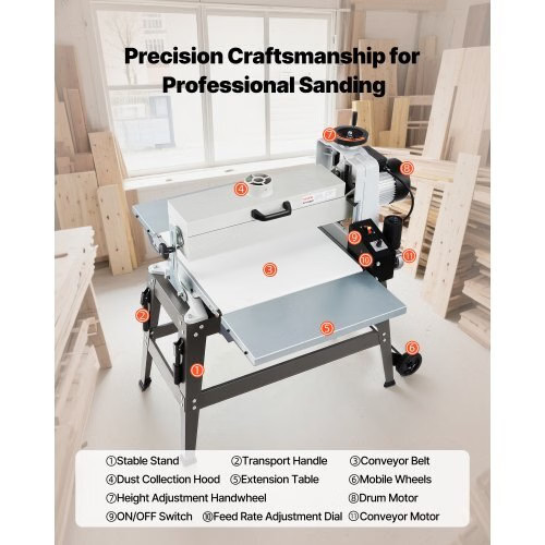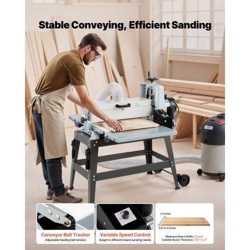 VEVOR 22" Drum Sander with Stand & Extension Tables, 1.75HP 1440RPMDual Motor Drum Sander for Woodworking - Variable Speed ConveyorBelt, 4" Dust Collection Port for Cabinet & Furniture Finishing Uniform Sanding, Less Rework Convenient & Easy to Use Easy Installation Wide Applications Aluminum Drum 4-inch Dust Collection Port Max Workpiece Width: 22-inch / 560 mm,Conveyor Speed: 0 - 3.5 m/min,Drum Size: 22 inch,Drum Material: Aluminum,Suitable WorkpieceThickness: 1/32" - 4" ,Overall Dimensions: 48.8" x 41.9" x 45.7" /1240 x 1065 x 1160 mm,Voltage/Frequency: AC 110V, 60Hz,High Speed:1440 RPM,Item Model Number: MS3156,Motor Power: 1.75 HP,FrameDimensions: 38.2" x 20" x 23.8" / 970 x 510 x 605 mm,Dust PortSize: 4-inch / 100 mm,Net Weight: 230.2 lbs / 104.4 kg