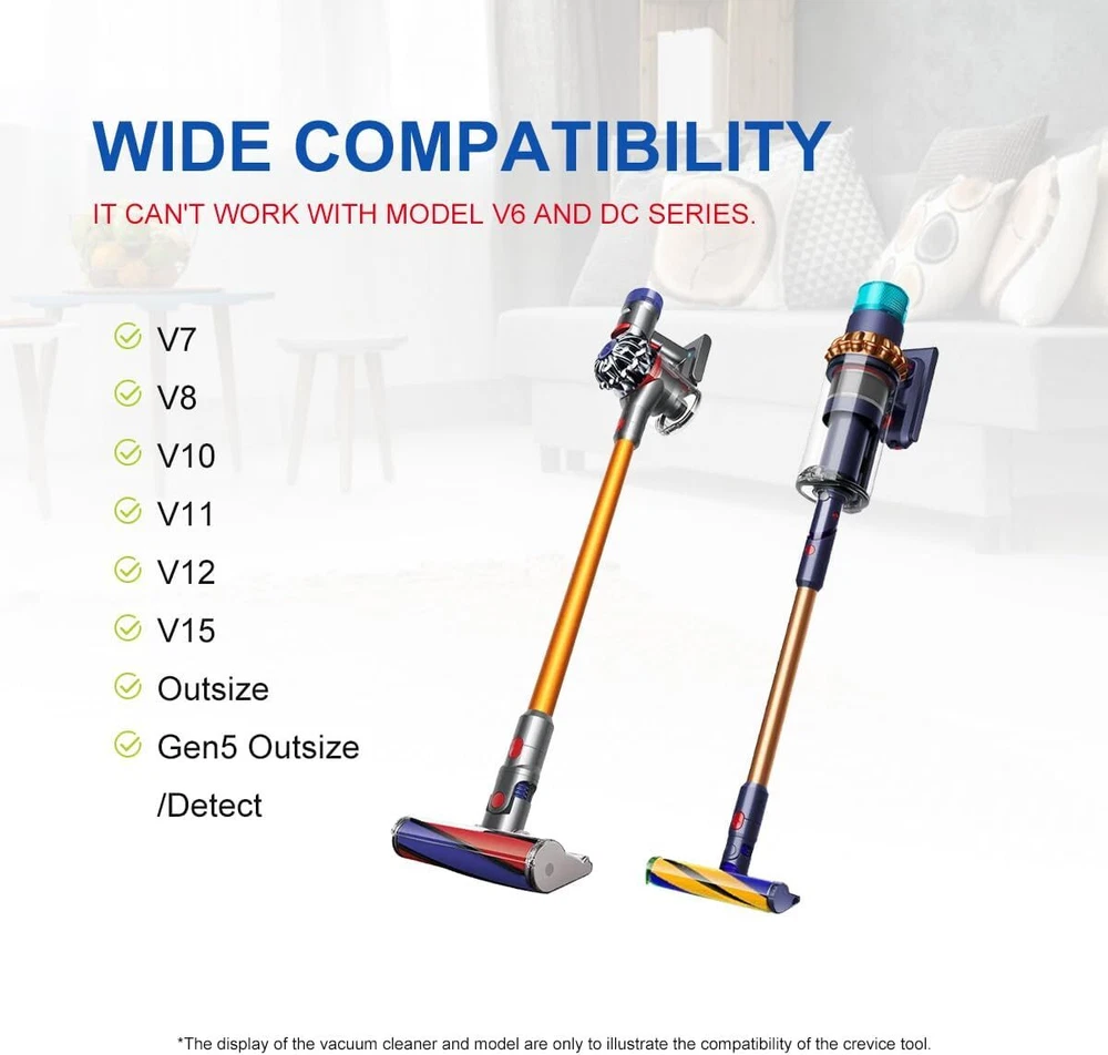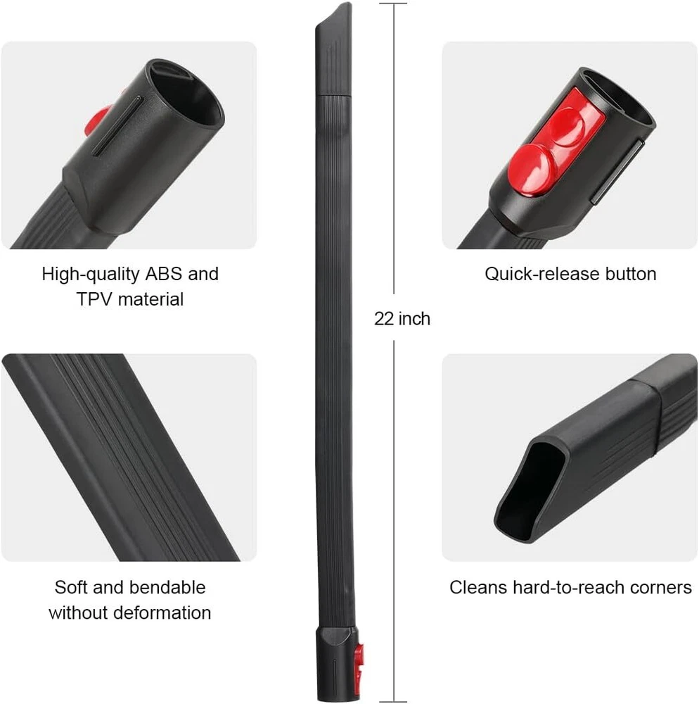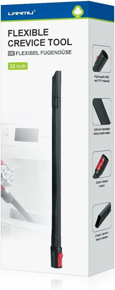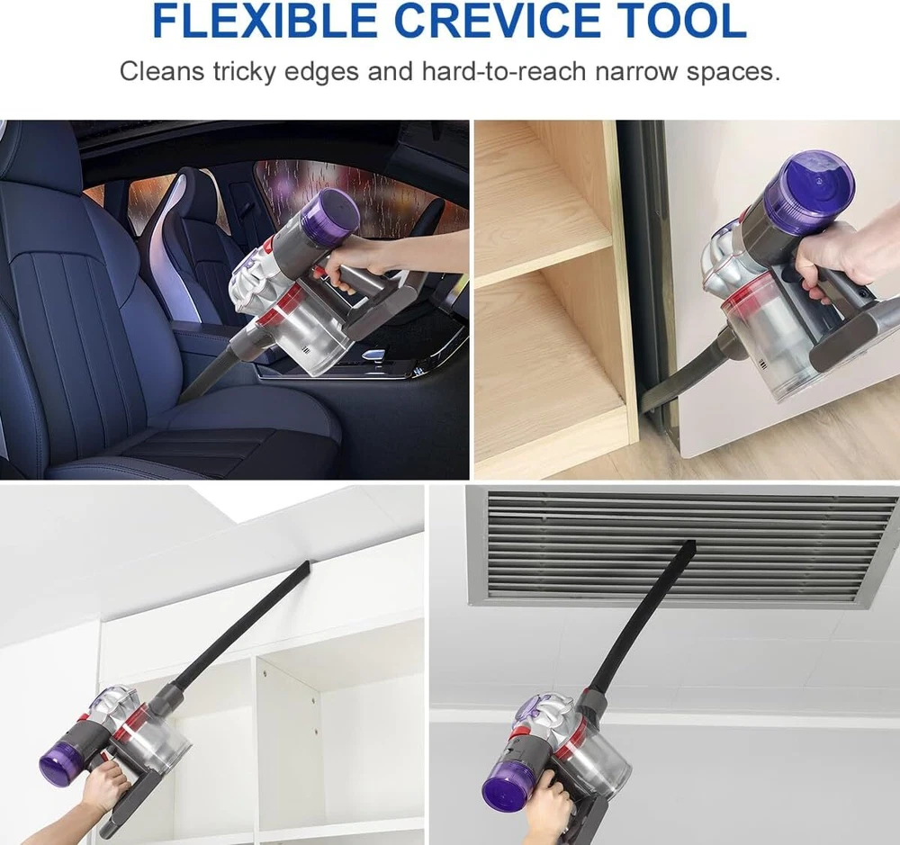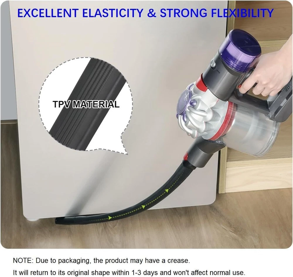 About this item Quality Upgrade: The crevice tool is made of high-quality ABS and TPV rubber material, soft and not easily deformed when bent. Unlike other crevice brushes on the market, ours can still straighten out even after bending. Wide Compatibility: This flexi crevice tool attachment perfectly compatible with Dyson V7 V8 V10 V11 V12 V15 Outsize and Gen5 series cordless vacuum cleaner. (NOTE: IT CAN'T WORK WITH V6 AND DC SERIES.) Premium Design: Design of small suction nozzle, perfectly for cleaning dryer vents, it's also great for cleaning under refrigerators, under furniture, under washing machines and other hard-to-reach corners. Efficient Cleaning: Its slim, elongated design provides easy access to narrow spaces and tight crevices, ensuring thorough cleaning in hard-to-reach areas of your home or car. Effectively removes dust, debris, and pet hair for a spotless surface. In the Box: The package includes 1 x 22 in extra-long flexi crevice tool. Due to packaging, the product may have a crease, which will resolve within 1-3 days and won't affect normal use.