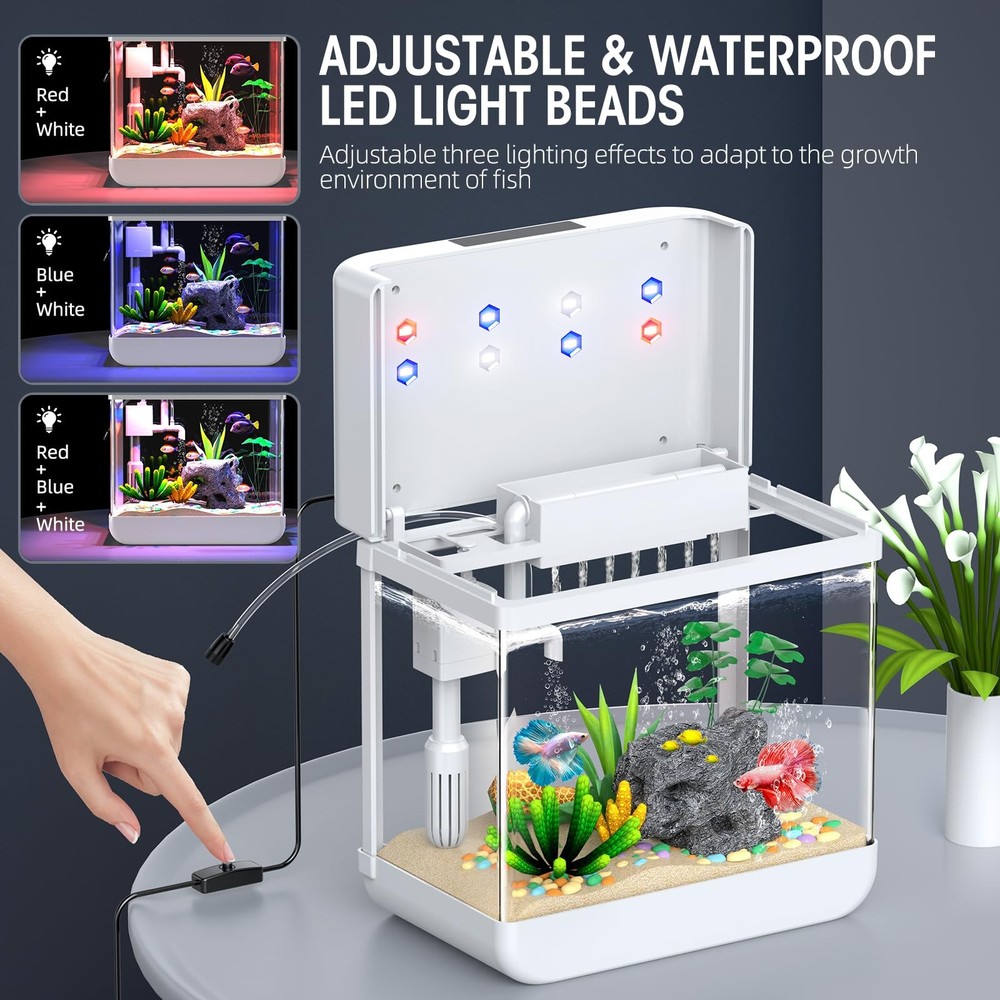 Fish Tank 2.2 Gallon Fish Bowl with Adjustable 3 Color Lighting 3 in 1 Quiet Pump with Filteration, Oxygenation, Water Circulation Triple Function, HD Float Glass, Leak-Proof Thickened Base 【3 Colors Adjustable Lighting System】Featuring waterproof 8 light beads on the cover's top, it offers three light color options: white, blue, and red (the red color is not that obvious). Easily adjust the colors with the on/off button, but here's the hidden gem: a gentle press toggles the colors while a firm press switches the system on or off. So please remember to use a light touch that is just press the button one-third of the way down.when adjusting colors of the light. 【Triple Self-circulating Filteration System】Self-cleaning Fish tank with a 3-in-1 silent water pump which combines filtering, oxygenation, and water circulation, it also features a reusable filter sponge for 4-pronged filtration, ensuring crystal-clear water and a stable environment for your fish. Designed with an extended rain pipe for a soothing ambiance and visual waterfall experience. 【Enhanced Durability and Clarity】Well-built fish tank crafted from automotive-grade float glass with more than 3mm thickness, experience a 360° HD viewing immersion while the heightened protective features and thickened anti-slip base ensure enduring durability and minimizing maintenance costs. 【Effortless Assembly & Maintenance】Enjoy aquarium ownership with our intuitive design and clear instructions. Easily adjust lighting modes and humidifier spray modes, while water changes are a breeze. Each aspect is designed for effortless operation, ensuring a seamless experience for all 【What You Get】This fish tank kit includes three decorative plants (random type), a removable blue board to prevent fish from jumping out, A resuable filter sponge, 3-in-1 water pump,Clear user instructions and providing a complete entry-level set-up perfect for keeping bettas, guppies, and other saltwater or freshwater fish