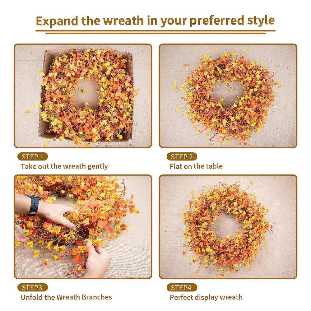 About the front door fall wreath: The circular shape of the wreath for front door represents wholeness and unity. The outdoor fall wreath is also said to represent the wheel of the year, in recognition of the fact that the darkness and cold of winter will eventually fade away,When looking at the fall outdoor wreath, the fall wreath means no beginning or no end Hung this autumn door wreaths on the door or a window, the front door wreath has been viewed as an invitation to the spirit of harvest to enter the home and bring luck, suggesting as well that the harvest spirit wells within [Autumn wreath Size] The outer diameter of these fall wreaths for front door are about 22 inch, Because the package box is relatively small,so some arrangement is needed to achieve its original size [Widely Used] These fall wreaths for front door has a wide range of application scenarios, as long as this autumn wreath avoids strong light and water contact, fall flower wreath can be hung indoors and outdoors [Style design] In order to create an authentic country style autumn wreath, these fall wreaths for front door are based on natural grapevine wreath to add a pastoral touch [Design language] Autumn wreath represent abundance and the harvest, at the same time, these fall wreaths for front door adopt the circular design to convey the changing of time and the cycle of life [Note] When properly stored and cared for, avoid contact with water and harsh light, preserved fall wreaths for front door will provide your home with enduring beauty for many autumns to come.If you have any problem with these fall wreaths, please contact with us
