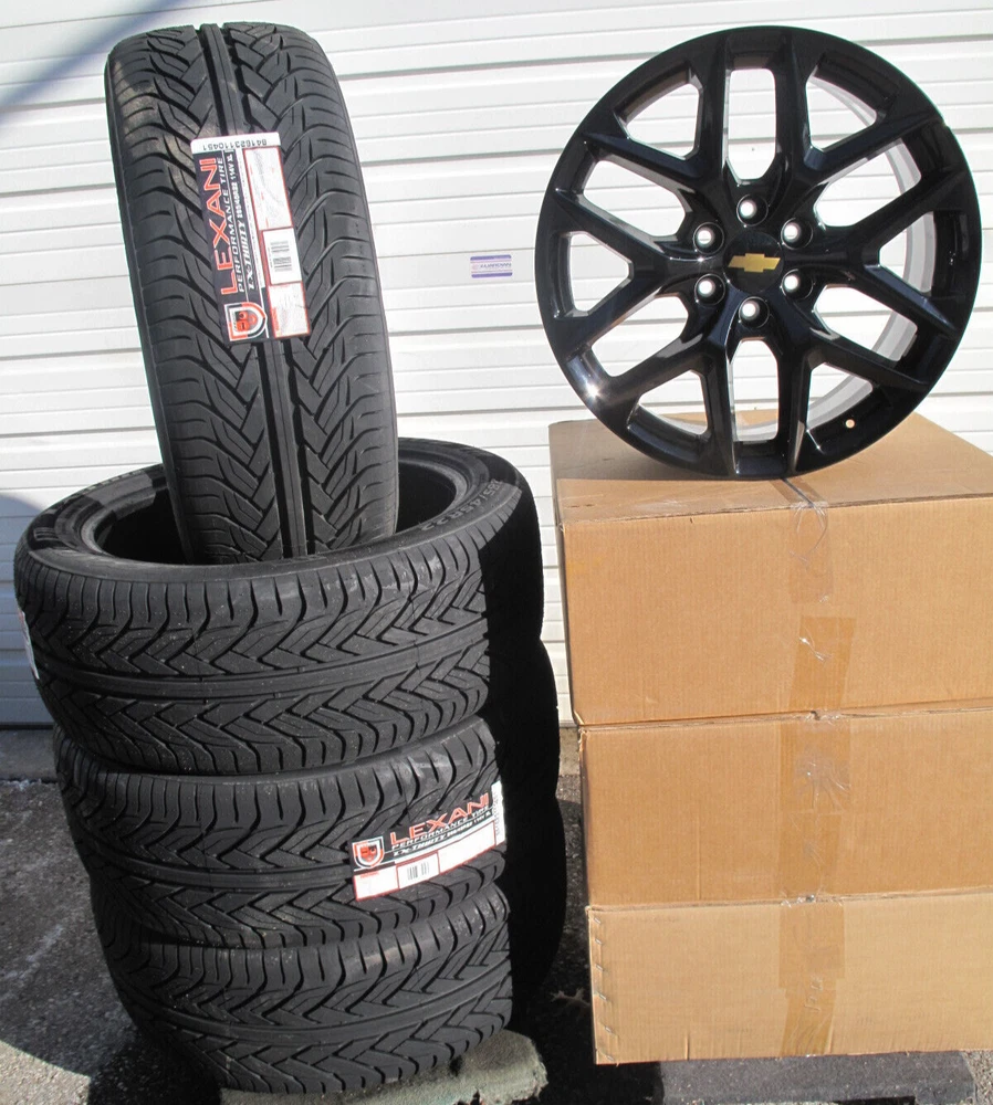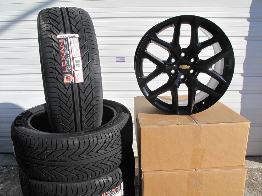 Shipping cost to some of the destinations in the USA may be different due to extra charges by shipping companies, for example city of NY, West coast like California, Washington State and others in that area, some rural delivery areas like the Mountains, Islands, Gated communities. If Extra charges are required, we will contact buyers after we receive orders or Buyers can sent us request for estimated shipping cost. EZBuy Wholesale Customer service available to answer all your questions. Per Ebay Policy our phone number will be available only to buyers after placing order. For any questions please use Ask a question link on the bottom of this page in Questions and answers about this item section. Compatibility provided by Ebay is not properly working and may provide wrong information. See our description for fitment or contact us You are bidding on BRAND NEW set of 4 Brand New Chevrolet Factory Style 22x9, 6 lug Gloss Black Chevrolet Suburban, Silverado, Tahoe, Avalanche wheels rims. Brand New Factory Reproduction. Will also fit GMC Sierra, Yukon, Escalade. Brand New tires 285-45-22 114V Lexani or different brand same specs All Season. All mounted and balanced. Chevy bow tie center caps are included. Tire Pressure Sensors are not included. Original sensors can be reinstalled from buyer's original wheels or for additional $40 ea, per buyer request, we can install new TPMS sensors. Black lug nuts available for $55 per 24 lug nuts. Chrome Lug nuts $55 per 24. These wheels will fit most Chevy and GMC truck models from 1992 to 2025 years. You can check with us for fitment. STK#22".CV62 TO ALL OUR CUSTOMERS: Please check our payment, shipping and return policy and place a bid if you accept it. Send your payment or contact us regarding your payment with in 24 hrs after winning the bid. If payment or information regarding your payment is not received, this item will be relisted or offered to another bidder. All international shipping quote including shipping and insurance. International recipients are responsible for any duty, tax, brokerage fee or any extra charge(s), regarding receiving the item in the recipient's country. We will be glad to assist you with any questions, please contact us on ebay site. For fitment questions and technical support customer service contact via ebay messages EZBUY247 is working for You 7 days a week. Our over 20 years of experience in wheel and tire business will help to meet Your satisfaction, we stand behind our products. BID WITH CONFIDENCE Customer service Problems with an order? If something is wrong with an order, we certainly do want to help you. Please read the following for more information on how to proceed. Shipping Problems: Please inspect your package immediately prior to accepting delivery. Damages and evidence of tampering on the outer packaging must be noted on the delivery receipt of the driver. Shipping Damage: Damages must be reported and filed with carrier immediately. Orders lost in transit must be reported to us immediately. We are not liable for carrier damages. A claim must be filed with Carrier Company to facilitate an exchange. If you received a damaged product, please report it to us within 48 hours from date of receipt. No exceptions. Wrong Items: If you received a wrong item, this should be reported within 2 business days from date of receipt. We shall provide you with a mailing label to ship back the wrong part. The replacement will only be sent once the wrong item has been received and confirmed by us. On Jul-31-06 at 05:16:37 PDT, seller added the following information: After purchasing, pay instantly with your credit card through PayPal! On Sep-13-06 at 09:58:28 PDT, seller added the following information: Use the FREE Counters 1 million sellers do - Andale! Shipping Instructions Large items like wheels/tires sets shipped via Freight, lift gate service is not included to a shipping cost. Items can be unloaded from the truck individually or lift gate service can be ordered per customer expense.