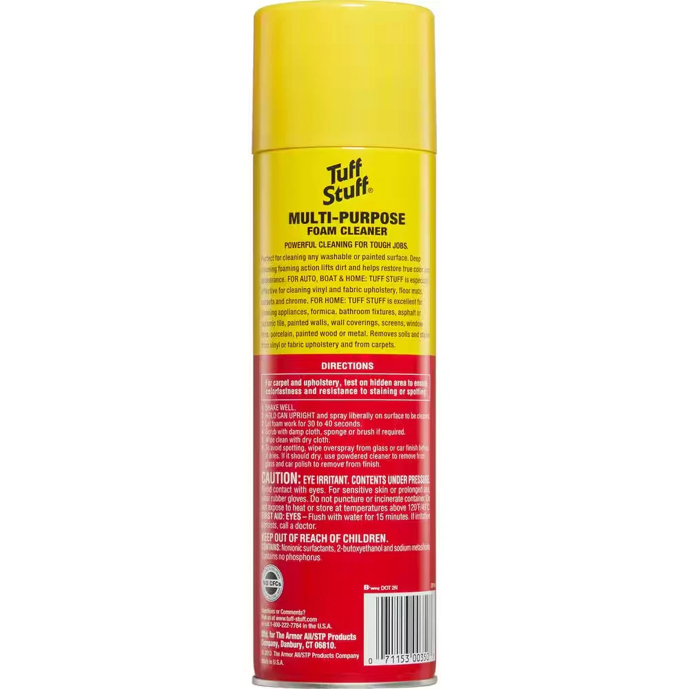 Powerful multi-purpose foam cleaner for auto, boat and home Industrial-strength stain removing power lifts dirt Deep cleaning foaming action for fabric, carpet, vinyl and more Tuff Stuff Multi Purpose Foam Cleaner offers powerful cleaning for tough jobs on a variety of surfaces. Thick foaming action helps to lift dirt off almost any surface for a versatile interior car cleaner. Use this multi purpose cleaner as a carpet cleaning foam, fabric cleaner, vinyl cleaner, or car upholstery cleaner. Simply spray the car interior cleaner on dirty or stained surfaces and let it work for 30 to 40 seconds. Scrub the area if needed, and wipe away the carpet wash and car seat cleaner with a clean cloth. It also works in your garage or home on painted walls, tile and floors. One 22 oz can of Tuff Stuff Multi Purpose Foam Cleaner Multi purpose cleaner works on a variety of surfaces for tough cleaning Car interior cleaner deep cleans fabric, carpet, vinyl and other surfaces Thick foaming action makes this car upholstery cleaner and carpet cleaning foam effective Works as a car seat cleaner, carpet wash, vinyl cleaner and fabric cleaner Cover area with interior car cleaner, let it sit, scrub and wipe the cleaner away Works on painted surfaces, tile and floors inside your home