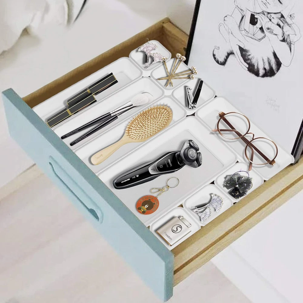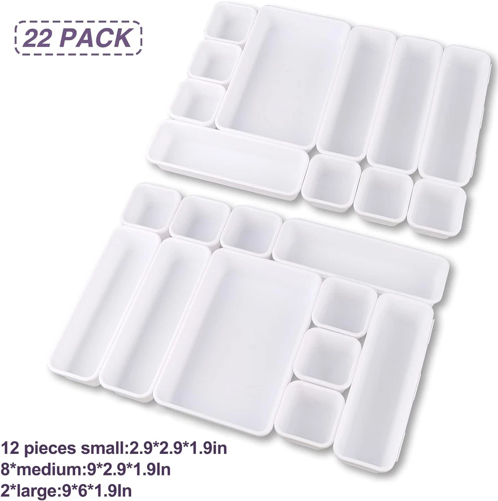 Separate and Stackable - These sturdy desk drawer organizer set can be stacked together, or each one works alone. The interlocking feature of the junk drawer organizer help you create your own mix.Keep everything organized, No more trouble finding things. Durable Material - These shallow drawer organizers are made of high-quality and solid durable plastic material.Drawer organizer bins are break-resistant and could accommodate different items and match organizational system to fit in any drawer. Multi-purpose drawer organizer tray - Designed for multipurpose solutions, perfect for dresser, bathroom drawer, kitchen drawer, office desk etc.Cosmetics, brushes, daily necessities, tableware, fruits, jewelry, tools, pencils can be easily stored. Easy to Care - Rounded corners plastic drawer organizer allow for easy use and cleaning.You could wipe clean with soap and sponge when it is dirty.The drawers can be stored permanently. Customize Combination - 22 pack flexible small drawer organizer with 3 various sizes allow for a good variety of layout. Items are organized according to size and use. contains 12pcs Small:(2.9×2.9×1.9 inch) - 7.5×7.5×4.8 cm,8pcs Medium:(9×2.9×1.9 inch)- 23.5×7.5×4.8cm,2pcs Large:(9×6×1.9 inch)-23.5×15.5×4.8cm. Product Description This desk drawer organizer set is perfect for dresser, bathroom drawer, kitchen drawer, office desk etc.Keep everything organized, No more trouble finding things.