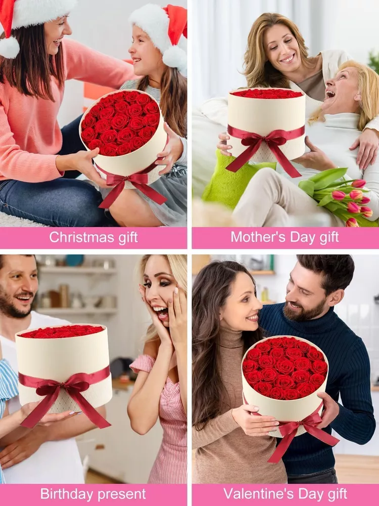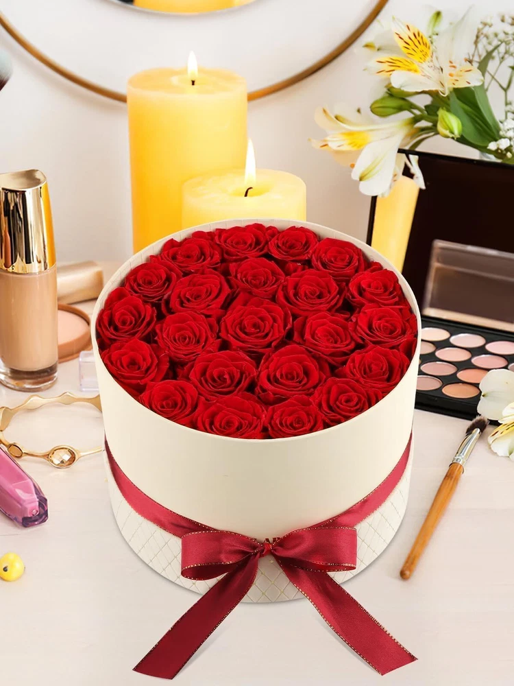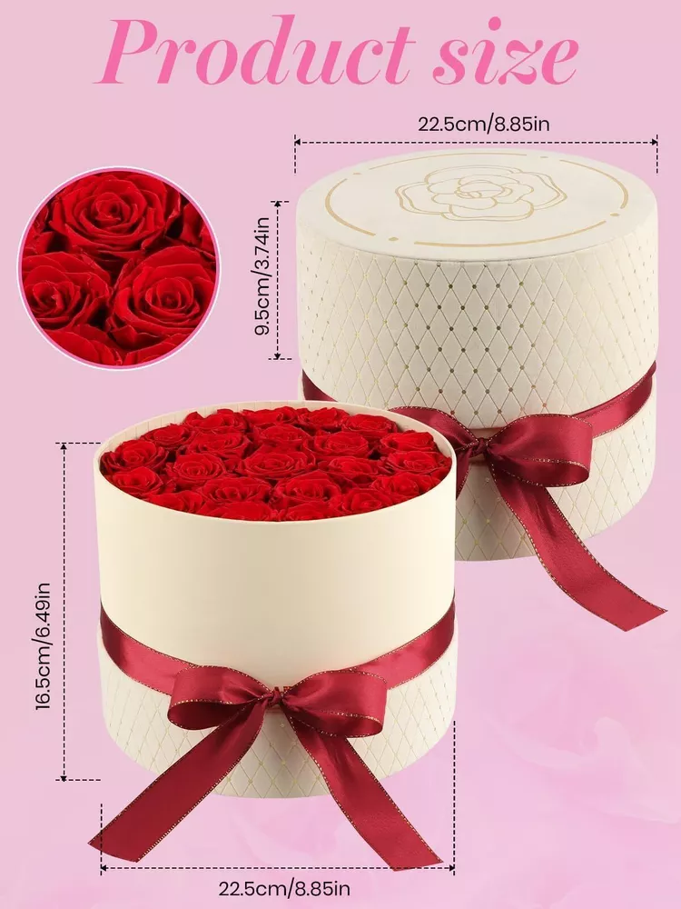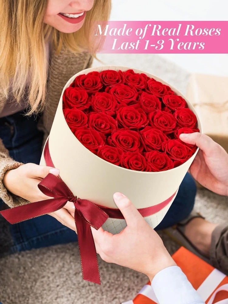 Features: 1. Roses elegantly arranged in a chic box. 2. Eternal flowers can also decorate your room, dining table, coffee table, makeup table and other places; Whether you're celebrating a special occasion or simply want to show someone how much they mean to you, these roses are the perfect choice! 3.No girl/woman would say no to this unique and special romantic gift, perfect for your mother, girlfriend, daughter, female friend, etc. 4.The flowers have a clear film that encompass them - keep that in place and don’t take it off as it will help to preserve the flowers on the edge of the box as you open and close the box. Specifications: 1.Package List: 22 pcs red preserved roses 2.Color: red 3.Sizes: 9*6.8 inches (DxH) 4.Material: 100% premium natural rose 5.Care Tips: (1))Do not water or refrigerate. (2)Remove dust with a soft brush. (3)Use indoors and keep away from direct sunlight. (4)Keep out of high temperatures& humid environmenta. 【Forever Flowers】The Perfectione preserved fresh flowers make for the most thoughtful and romantic gifts. The vibrant red color symbolizes love and passion, expressing your feelings without saying a word. 's attention to detail is impeccable, and the quality is outstanding. (Tip: This product does not include greeting card.) 【Lasting Beauty】 The package contains 22 red roses, each made from 100% premium real natural rose. Fresh roses will wilt in a week or less, but our roses will continue to bloom and brighten your space for years to come(lasts up to 1-3 years). It's like having a garden in the box! 【Exquisite Package】Eternity roses come professionally packaged in a nice box with a ribbon tied around it for that extra touch. The vibrant colors and delicate petals make them a visual delight, effortlessly enhances the ambiance of any room they decorate. Portable design, with adjustable small belt, can be selected according to demand. 【Unique Gifts】Forever roses fresh cut uses delicate packaging, portable design, very convenient in Valentine's Day, Mother's Day, Birthday, Wedding, Anniversary, Housewarming and other holidays as a gift to the loved one to express your love. 【 Odorless&Maintenance-Free】does not add any artificial fragrance to our roses during the process of making preserved roses, the natural fragrance of roses will be lost, so these preserved roses are odorless. If you want fragrance, you can add your own essential oil or fragrance. No watering, no need for sunlight, easy care for years of enjoyment. Not easy to tear, the roses are fixed in the box, will not fall out.