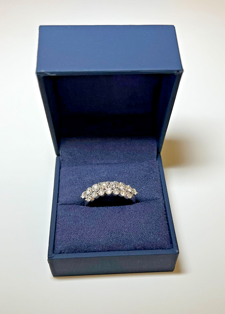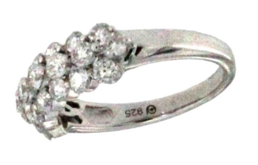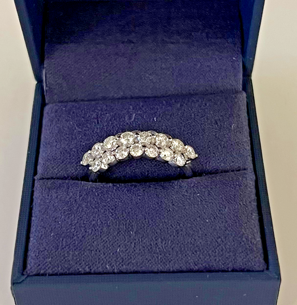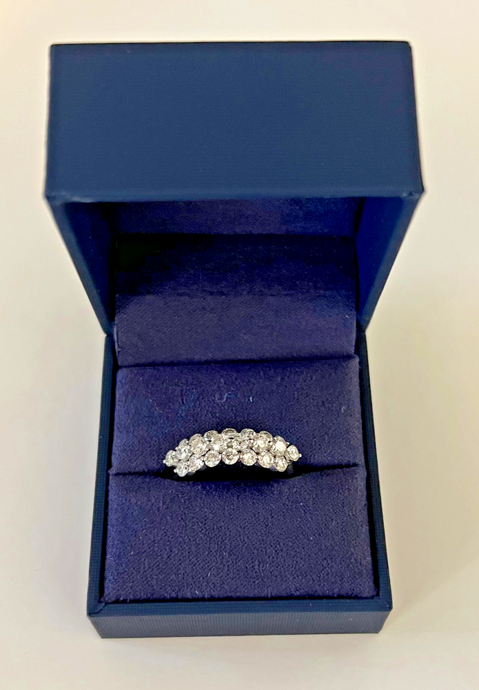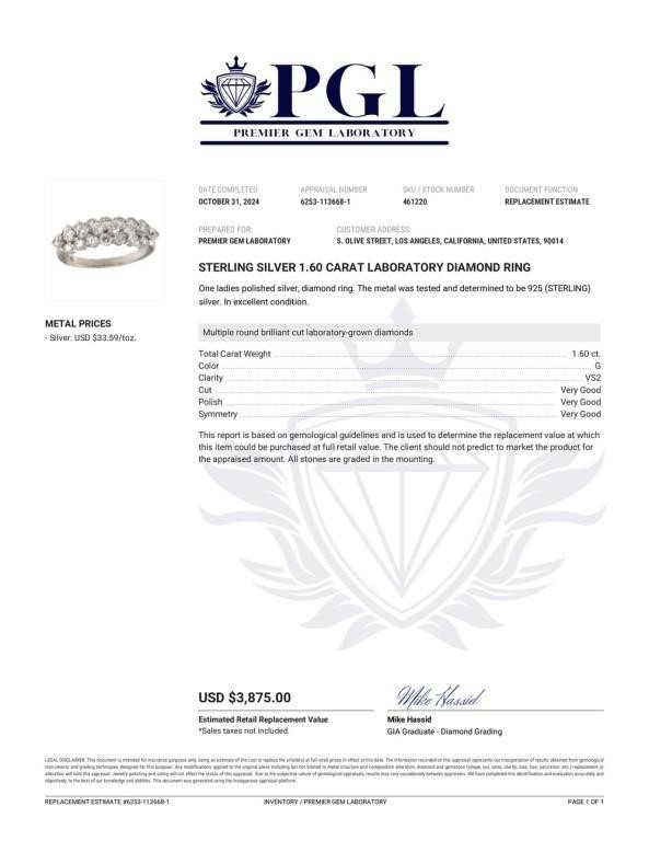 Made up of 22 round Brilliant 1.60CTTW VS2 Lab Grown Diamonds, this ring is a stunning piece of fine jewelry. The ring features three rows of diamonds with the middle row elevated creating a crown-effect. This Sterling Silver 925 ring is a size 7. An elegant choice for any jewelry lover or special anniversary. With a certification from IGI, this ring is guaranteed to have high quality and clarity. PGL Digital Appraisal Retail Replacement Value is $3,875.
