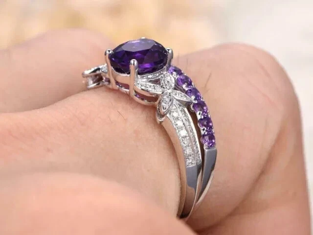 Style: Band Cut Grade: Excellent Occasion: Anniversary, Birthday, Christmas, Engagement, Graduation, Mother's Day, Valentine's Day, Wedding Main Stone Depth: As per picture Customized: Yes Material: Gemstone, Stone, Metal Main Stone Shape: Oval Color: White Main Stone Creation: Simulated Theme: Beauty Gemstone Clarity Grade: Slightly Included Number of Gemstones: As per picture Country/Region of Manufacture: India Seller Warranty: Yes Shape: Oval Brand: karunas-76 Secondary Stone: Diamond Features: Engraved, Nickel-Free Metal: Sterling Silver Base Metal: Sterling Silver Wholesale: Yes Main Stone Length: As per picture Ring Size: All ring size available Setting Style: Prong Handmade: Yes Main Stone Color: Purple Type: Ring Antique: No Metal Purity: 925 Main Stone: Amethyst Sizable: Yes Main Stone Width: As per picture Era: Undated Country of Origin: India Personalize: Yes Signed: No Band Width: As per picture Vintage: No