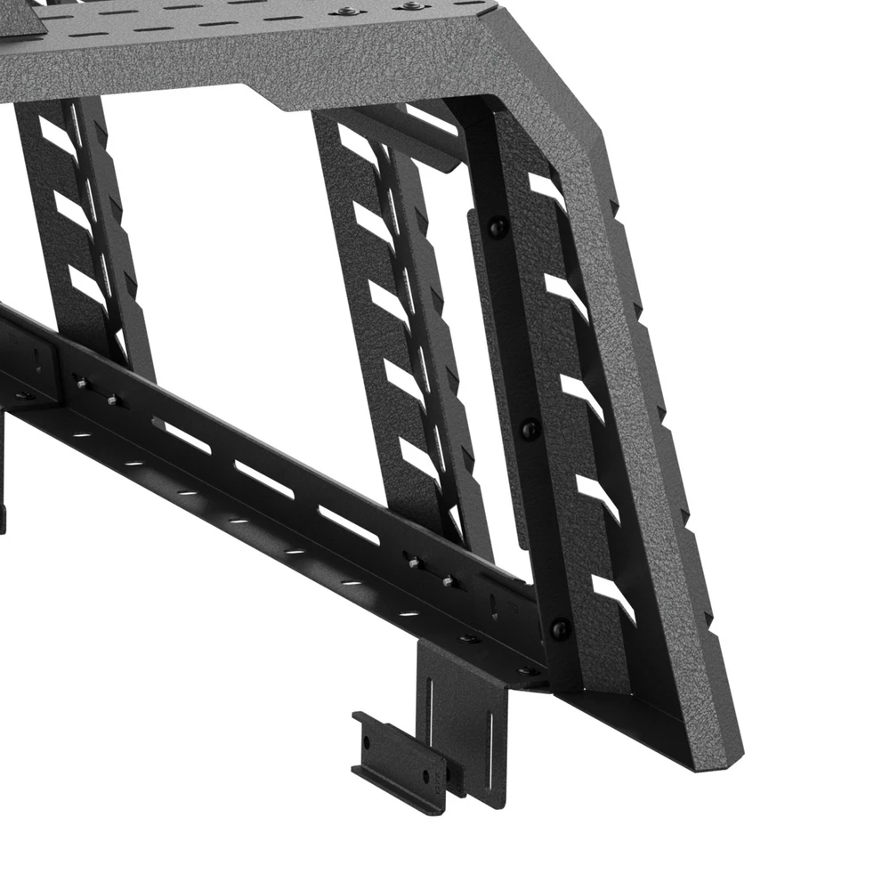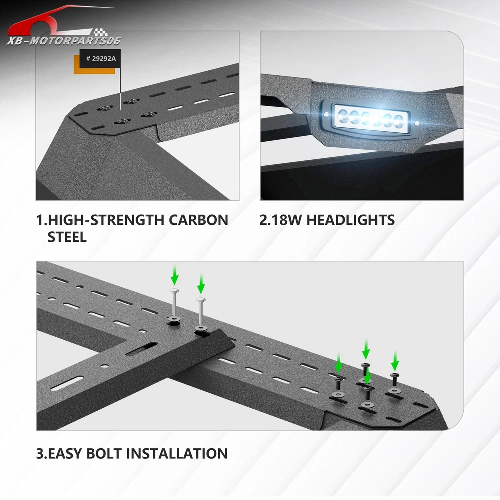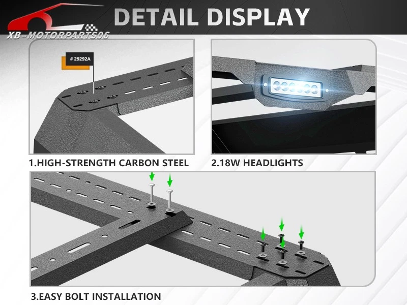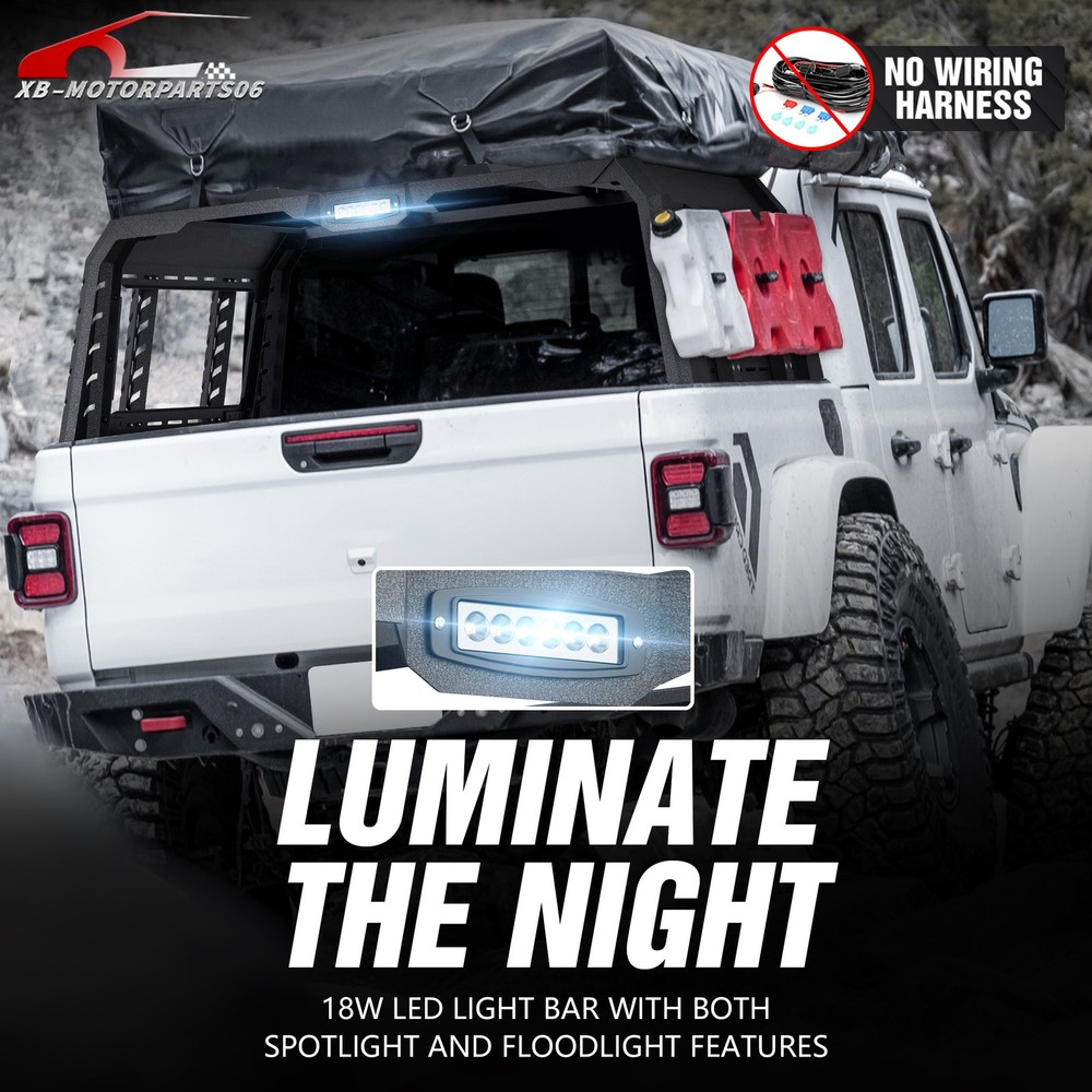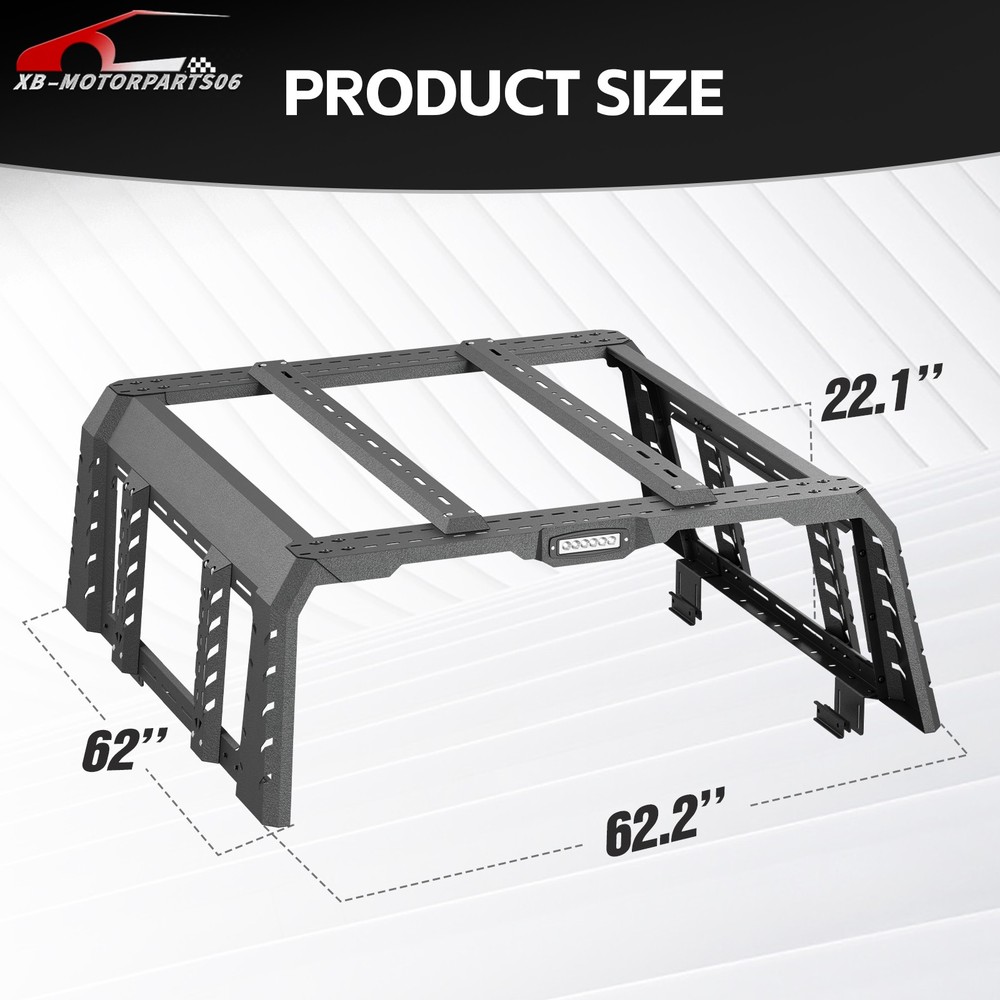 22.1" High Full-Size Overland Bed Racks For 2020-2025 Gladiator JT With Bed Rail Regularly check the rack's hardware for any loosening and ensure that the cargo is securely fastened before driving. Suitable Models : Com patible for 2020-2025 Jeep Gladiator JT with Bed Rails. ( Not Compatible with Trucks with Tonneau Cover & Bed Cover ) Package Includes : One set of bed rack, 1 LED light bar, installation instructions, and mounting hardware. Product Information : Package Dimensions : 53.94 x 25.98 x 9.84 inches Installation mode : Bolt-On Load Capacity: stationary:1000 Pounds;in motion:500 Pounds Placement on Vehicle: Rear Item Weight: 118.14 pounds Material: Carbon Steel Color: Black (hand measurements may have an error of 2-3 mm/0.078-0.118 in) Feature : ① Crafted from premium heavy-duty steel plate, this rack is exceptionally sturdy, capable of supporting 1000 pounds of weight when statically distributed and 500 pounds when in motion. It features a textured black powder coating for corrosion resistance and long-lasting durability; ② Enhance your pickup truck with this practical and thoughtfully designed bed rack, providing additional storage space. Equipped with LED Light Bar, it offers extra illumination for nighttime driving. With a perfect height of 22.1 inches, it doesn't obstruct bed storage space and can match the cab perfectly, catering to various hauling needs; ③ The bed rack features numerous slim slots for accessory installation and cargo tie-down. Ideal for transporting kayaks, surfboards, canoes, luggage, skis, and more. Both sides come with side panels and plenty of elongated slots for adding accessories. Install lights, high-lift jacks, fire extinguishers, roof tents, bike racks, and anything else you need; Warranty Period : 2 year Standard Shipping (FedEx Ground or FedEx Home Delivery) Will usually ship within 3 business days of receiving cleared payment Regularly check the rack's hardware for any loosening and ensure that the cargo is securely fastened before driving. Suitable Models : Com patible for 2020-2025 Jeep Gladiator JT with Bed Rails. ( Not Compatible with Trucks with Tonneau Cover & Bed Cover ) Package Includes : One set of bed rack, 1 LED light bar, installation instructions, and mounting hardware. Product Information : Package Dimensions : 53.94 x 25.98 x 9.84 inches Installation mode : Bolt-On Load Capacity: stationary:1000 Pounds;in motion:500 Pounds Placement on Vehicle: Rear Item Weight: 118.14 pounds Material: Carbon Steel Color: Black (hand measurements may have an error of 2-3 mm/0.078-0.118 in) Feature : ① Crafted from premium heavy-duty steel plate, this rack is exceptionally sturdy, capable of supporting 1000 pounds of weight when statically distributed and 500 pounds when in motion. It features a textured black powder coating for corrosion resistance and long-lasting durability; ② Enhance your pickup truck with this practical and thoughtfully designed bed rack, providing additional storage space. Equipped with LED Light Bar, it offers extra illumination for nighttime driving. With a perfect height of 22.1 inches, it doesn't obstruct bed storage space and can match the cab perfectly, catering to various hauling needs; ③ The bed rack features numerous slim slots for accessory installation and cargo tie-down. Ideal for transporting kayaks, surfboards, canoes, luggage, skis, and more. Both sides come with side panels and plenty of elongated slots for adding accessories. Install lights, high-lift jacks, fire extinguishers, roof tents, bike racks, and anything else you need; Warranty Period : 2 year
