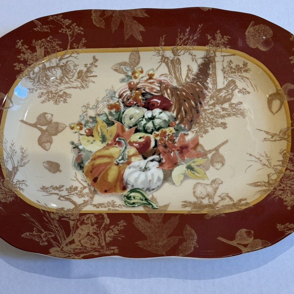 Title: 222 Fifth “Harvest” Fine China Serving Plate - Rectangular - Autumn Cornucopia Design Description: Enhance your table setting this season with this stunning 222 Fifth “Harvest” fine china serving plate. Featuring a beautifully detailed cornucopia of autumn fruits and vegetables against a warm golden background with rich red borders and intricate botanical patterns, this plate is a true statement piece. Perfect for Thanksgiving, fall gatherings, or simply adding a touch of elegance to your home. • Brand: 222 Fifth (PTS International) • Pattern: Harvest • Material: Fine China • Features: Dishwasher & Microwave Safe • Dimensions: Approx. 12” x 9” (as shown in photos) • Origin: Made in Indonesia This serving plate is both functional and decorative, making it a versatile addition to your collection. It’s in excellent condition, ready to be shipped to your home to complete your holiday decor. Keywords: 222 Fifth Harvest Plate, Fall Dinnerware, Thanksgiving China, Cornucopia Plate, Autumn Serving Dish, Fine China Platter, Holiday Entertaining, Microwave Safe Plate, Vintage Harvest Plate Shipping & Shop Policies: • I try to ship all items within 24 hours of purchase (excluding weekends and holidays). • Combine shipping when you purchase two or more items from my shop. • Visit my shop, VintageWowzers, to discover more curated treasures! New items are added daily, so be sure to follow and check back often. Thank you for shopping with me. Have a wonderful day! See you again soon! XOXO