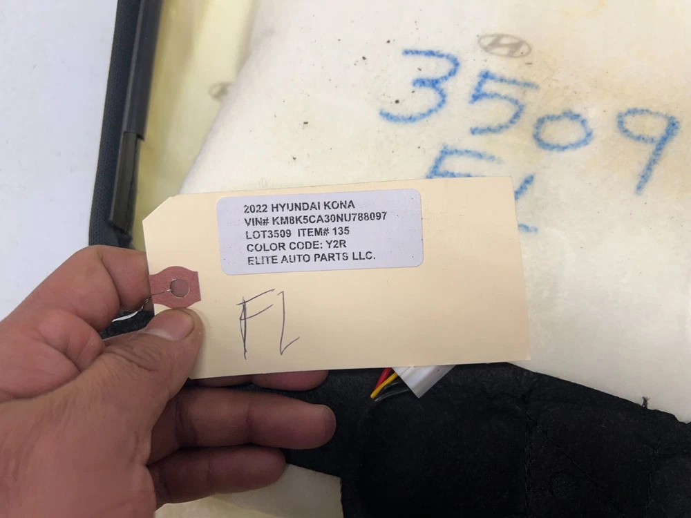 ELITE AUTO PART 2022-2023 HYUNDAI KONA FRONT LEFT DRIVER SIDE LOWER SEAT CUSHION BLACK , IT HAS A LIGHT DENT PICTURE# 3,4 . LOT3509 # 135 part #OEM Look through pictures caref ully and make sure this is exactly the part you are looking for. What yo u see is what you will receive. DONOR CAR:--------- 2022 HYUNDAI KONA VIN#----------------------------- KM8K5CA30NU788097 ENGINE:------------------------- 1.6L 4 COLOR:-------------------------- RED Y2R TRANSMISSION:------------ AUTOMATIC AWD MILES:------------------14K MILES