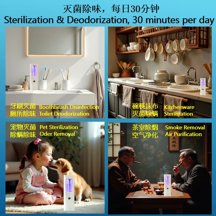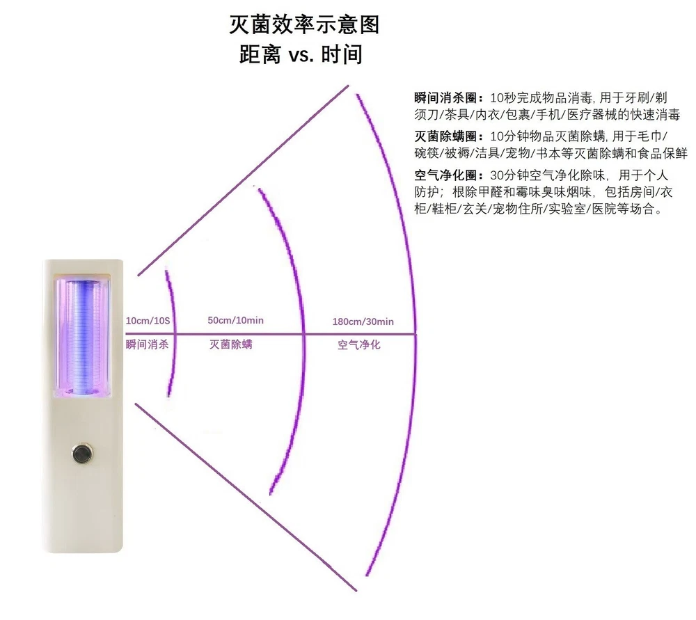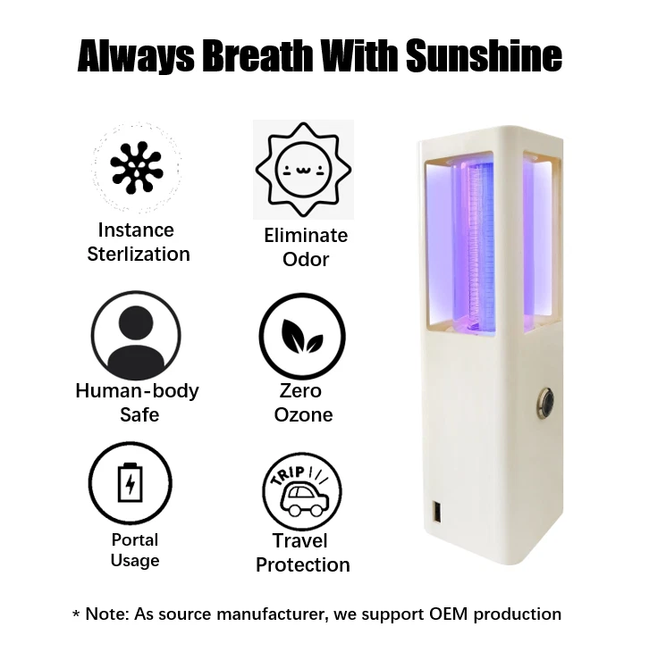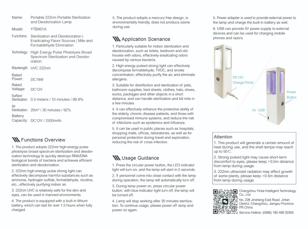 Product Features: - 222nm Far UVC is safe wavelength band for human body, which has been widely proven by multiple institutions worldwide. - Using high-energy pulse instantaneous killing technology, sterilization and mite removal can be completed within seconds. - High energy photolysis can quickly decompose odors, eliminate formaldehyde, and take effect in just few minutes. - Sterilization and deodorization results are more than 10 times of similar products like 254nm products, validated by test reports. - USB port provides 5V power supply, which can be used to charge mobile phone. - Battery inside support around 1.5-hour lamp-running with fully charged conditon. Product Value: - Recommend to use for disinfection and sterilization kitchen dishes and chopsticks. - Sterilization and deodorization in bathroom; sterilization and disinfection of toothbrushes and towels only in few seconds. - Quickly eliminate odors caused by pets and control the growth of mites. - Highly effiective for vehicle sterilization and deodorization, plus health protection in hospital, lab, office to avoid cross infection. Key Parameter: - Product Name: Portable 222nm Portable Sterilization and Deodorization Lamp - Model: YTBX01A - Input Voltage: DC12V - Rated Power: 18W - Luminescence Principle: High-energy Pulse Photolysis Sterilization and Deodorization Technology - Battery Capacity: Functions Overview DC12V / 2500m Sterlization Effectiveness: - 10 seconds for surface sterilization of objects with distance within 10cm (sterlization rate: 99.9%) - 10 minutes to Surface sterilization of objects with distance within 50cm (sterlization rate: 99.9%) - 30 minutes required for 16 squre meter for air sterlization and deodorization (sterlization rate: >92%) Usage Guidance 1. Press the circular power button, LED indicator light will turn on, and the lamp will start in 5 seconds. 2. During lamp power on, press circular power button, with blue indicator light turn off, the lamp will be turned off. 3. Lamp will stop working after 30 minutes sterilization. To continue usage, please power off lamp and power on again. 4. Power adapter is used to provide external power to the lamp and charge the built-in battery as well. 5. USB can provide 5V power supply to external devices and can be used for charging mobile phones and razors.