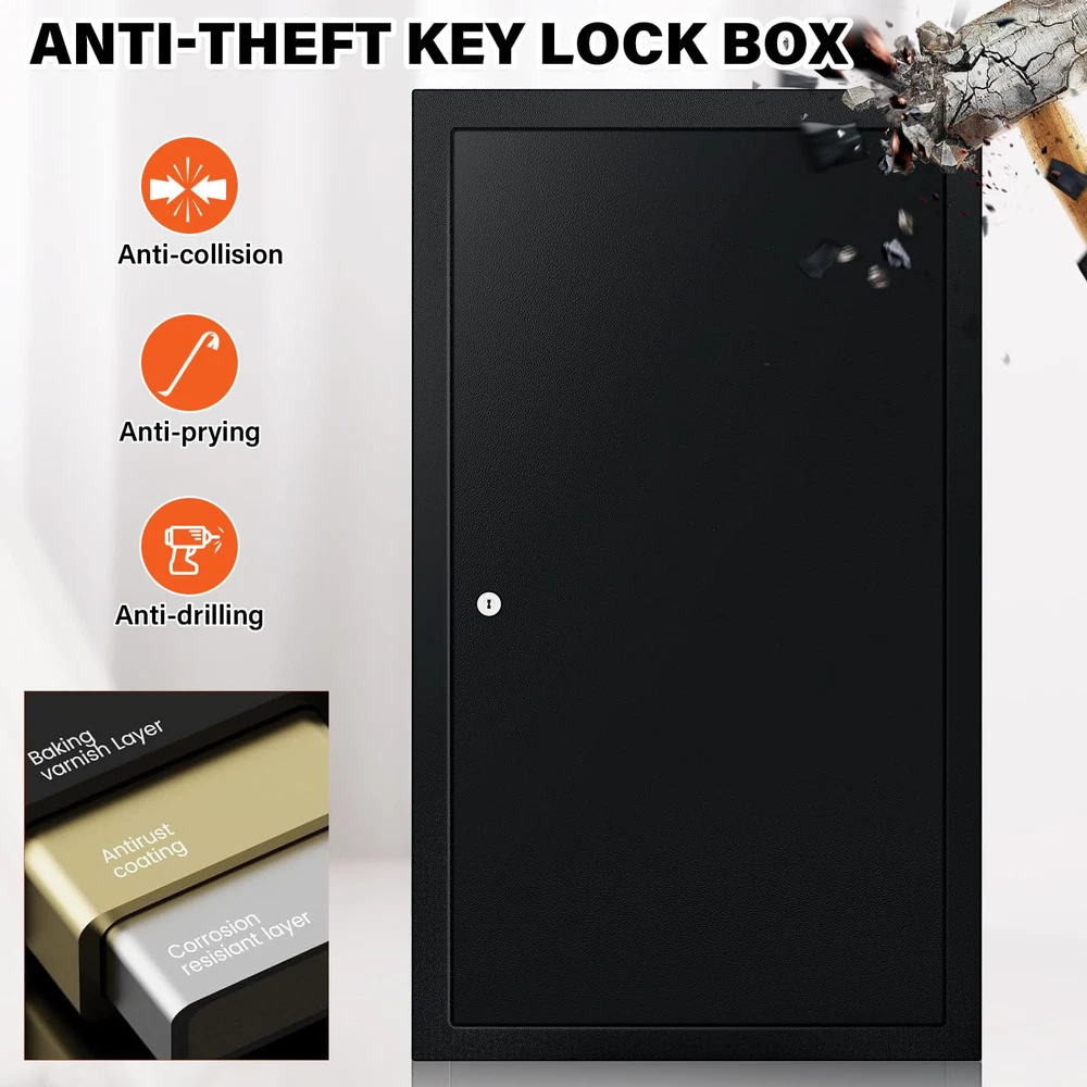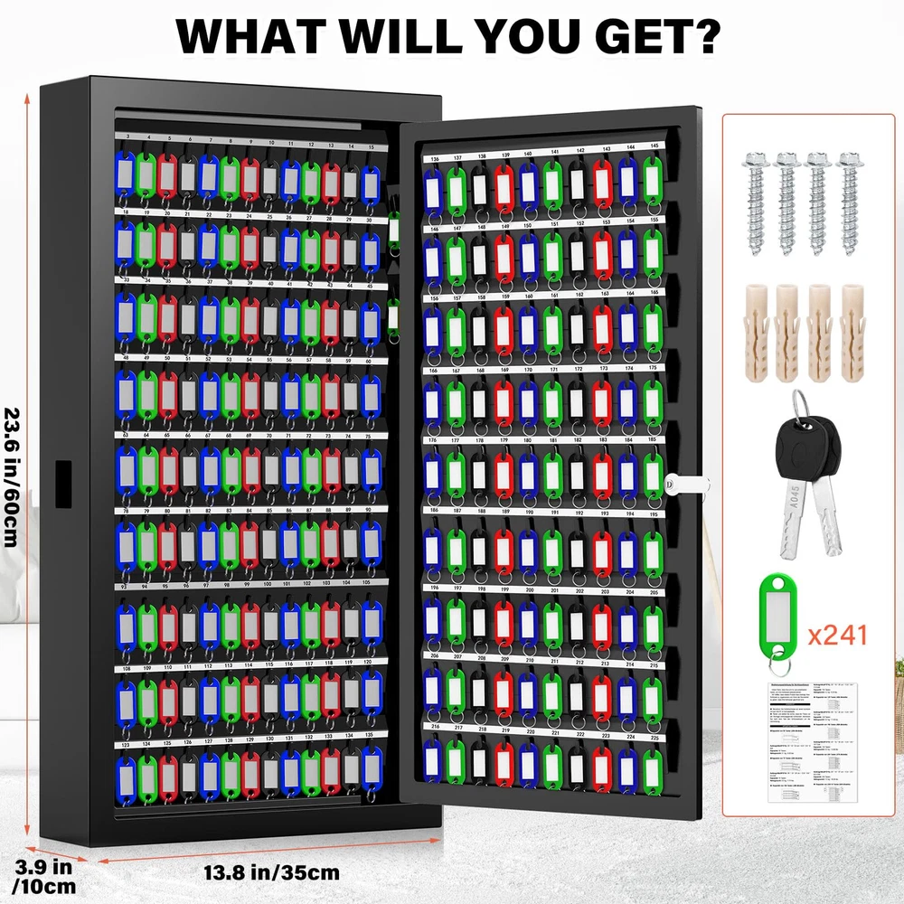 Key Lock Box With Side Opening: Key box is made of heavy gauge steel and finished with a black scratch-resistant powder coat to protect it from rust and damage, extending the life of key box. The 0.8 mm steel plate thickness can withstand certain impact and pressure. Key box can store your keys and prevent others from accessing. You can take the small opening on the side of the key box as a "drop box". If you lend the key to someone else, they can drop it off from this place when they're done Key Safe With Additional 16 Side Hooks And Key Tags: The key organizer that holds 225 keys also has 16 hooks on the side. The key lockbox is suitable for storing various car keys, door keys and some small valuables. The key safe has numbered key hooks and 241 colored key tags, and you can mark the key tags separately according to the purpose of the keys. After classifying and managing the keys, you can easily find the key you are looking for and save your time Key Box With Two Emergency Keys: The key lock box comes with 2 emergency keys, which makes it easy to open and close the door. Attention: Don't put the emergency key in the key box. There is a unique number on the key hole of the key box. If the emergency key is lost, you can contact us in time. You can put some desiccant in the key safe to avoid moisture, which can perfectly protect your keys or some small valuables Install Key Cabinet To The Wall: Key cabinet comes with 4 pre-drilled holes on the back, you can easily bolt it to the wall with mounting bolts to prevent tipping and add safety. External dimensions(W×D×H): 13.8×3.9×23.6 inch / 35×10×60 cm. This key lock box is compact and perfect for homes, hotels, offices, valet parking stations, apartment buildings, parking lots, car dealerships, car repair shops, etc What You Will Get: A 225 keys key lock box with additional 16 side hooks, two emergency keys, a set of key tags, a set of mounting bolts and a user manual. If you have any questions, you can contact us and our professional customer service team will solve your problems within 24 hours. Your satisfaction is very important to us