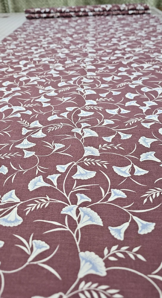 This vintage Cranston Print Works fabric is a beautiful floral print in burgundy, white, and periwinkle colors. The fabric is made of 100% cotton and measures a couple inches over 2.25 yards in length with a width of less than 45 inches. It was manufactured in the United States by Crantex Fabrics, and the brand is Cranston. The theme of the fabric is Flowers & Plants, making it perfect for crafts and sewing projects. Please see ALL PHOTOS for item details. Shipping USPS. *Smoke free home*