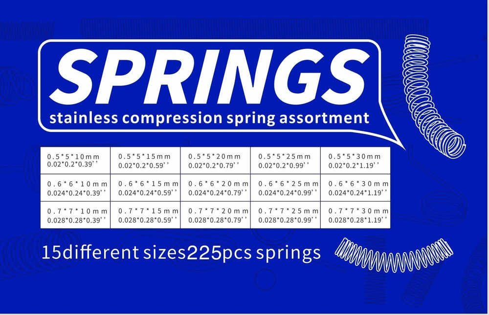 Small Compression Springs Assortment Kit, 225 Pcs 15 Different Sizes Stainless Easy to store: The springs are neatly packaged in a clean and transparent box. Each spring in the grid has corresponding size markings for easy selection and placement. Stainless steel material production: It will not rust in humid environments and has strong oxidation resistance, acid resistance, and corrosion resistance. We always pay attention to the size you truly need. We select 15 different sizes you may need from thousands of sizes. Plastic box packaging: 15 different sizes, 225 spring combination sets for easy access 225 pieces compression spring combination kit includes 15 sizes0.02*0.2*0.39'',0.02*0.2*0.59'',0.02*0.2*0.79'',0.02*0.2*0.99'',0.02*0.2*1.19'',0.024*0.24*0.39'',0.024*0.24*0.59'',0.024*0.24*0.79'',0.024*0.24*1.19'',0.024*0.24*0.99'',0.028*0.028*0.39'',0.028*0.028*0.59'',0.028*0.028*0.79'',0.028*0.028*0.99'',0.028*0.028*1.19''. stainless steel springs : It will not rust in humid environments and has strong oxidation resistance, acid resistance, and corrosion resistance. Shipping We offer FREE shipping on all orders! We ship within Three business days of payment, usually sooner. We use a selection of shipping services such as UPS, FedEx, USPS etc. We only ship to the lower 48 states, no APO/FPO addresses or PO Boxes allowed. Local pickups and combined shipping options are not provided at this time. Return You can return a product for up to 30 days from the date you purchased it. Any product you return must be in the same condition you received it and in the original packaging. Please keep the receipt. Payment We accept payment by any of the following methods: PayPal Please pay as soon as possible after winning an auction, as that will allow us to post your item to you sooner! Feedback Customer satisfaction is very important to us. If you have any problem with your order, please contact us and we will do our best to make you satisfied. Contact Us If you have any queries, please contact us via ebay. We usually respond within 24 hours on weekdays. Please visit our eBay store to check out other items for sale! Thank you for shopping at our store.