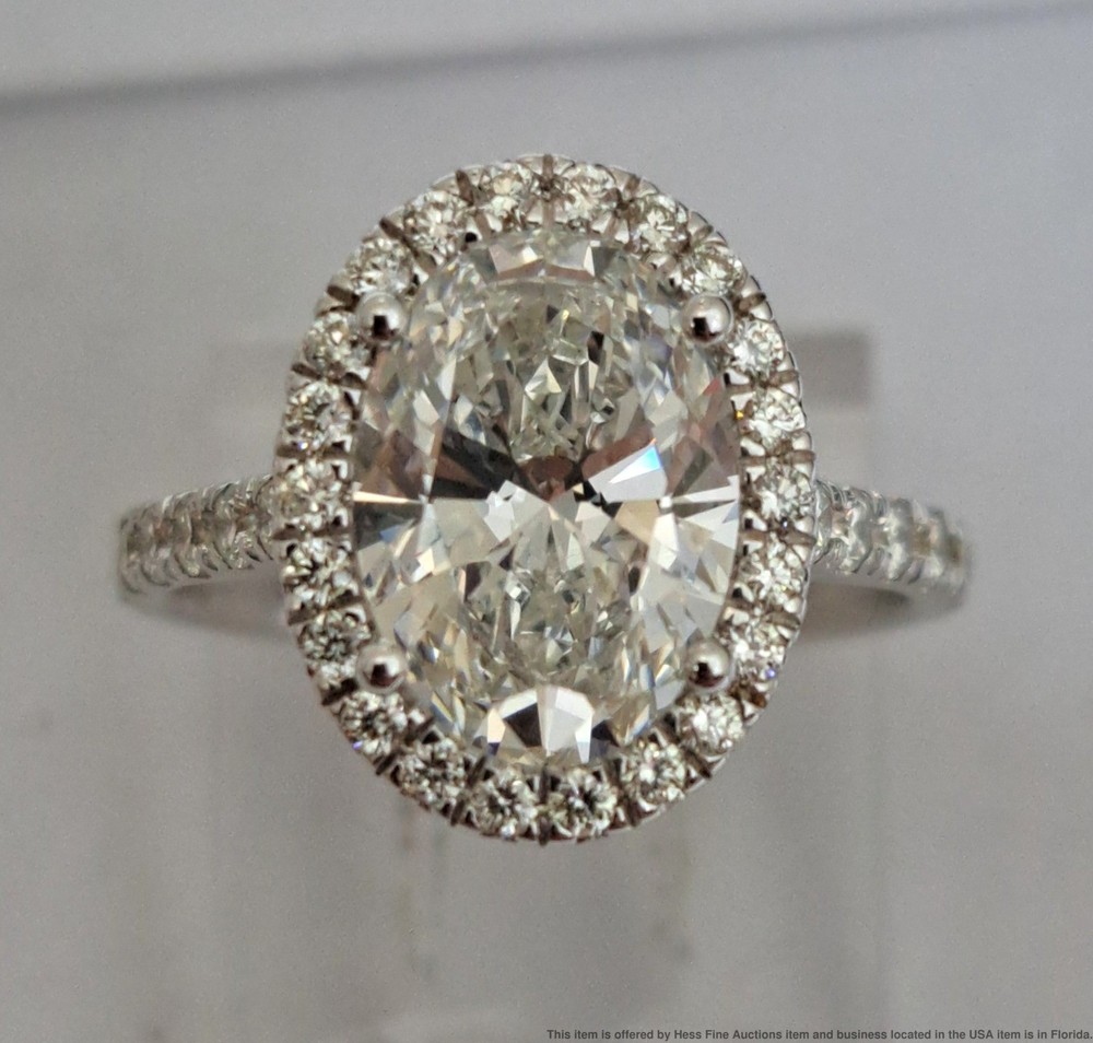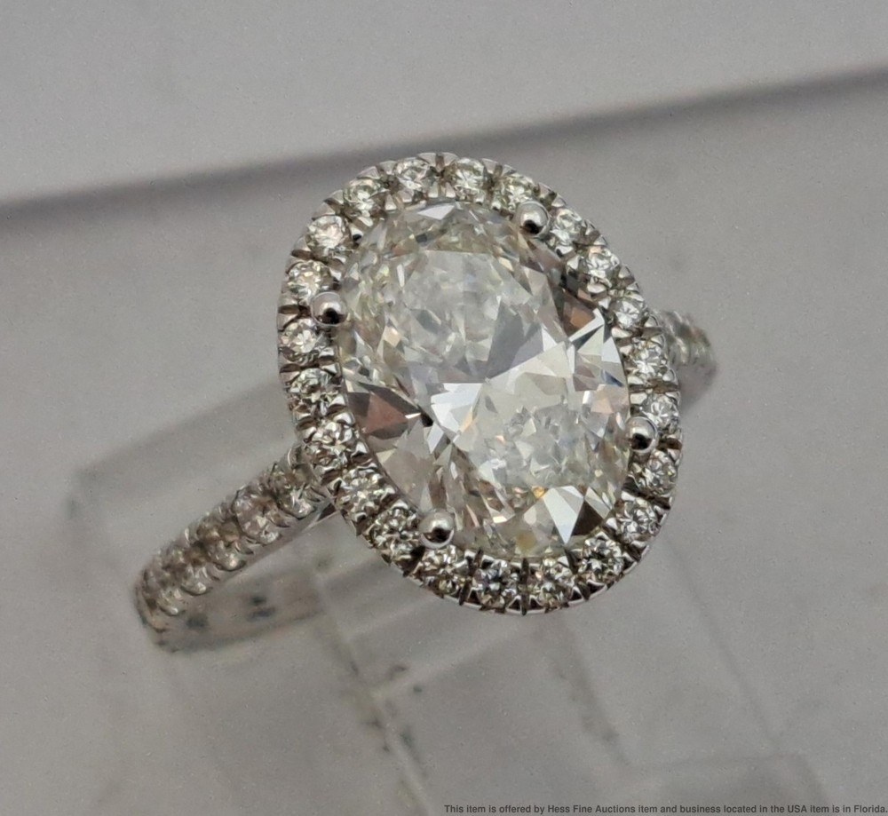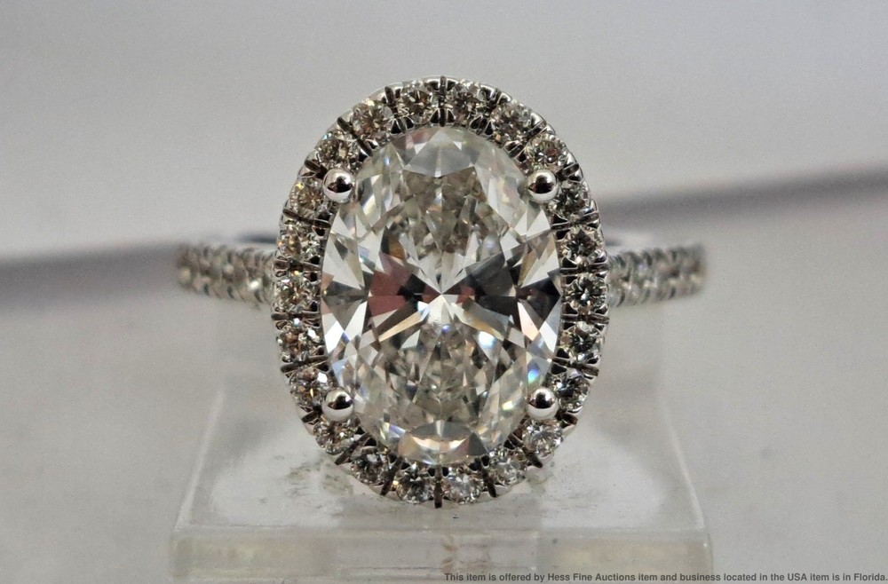 2.25ct Lab Grown Oval Center .56ct Diamond Mount 14k Gold Engagement Ring 2.25ct Lab Grown Oval Center .56ct Diamond Mount 14k Gold Engagement Ring Click images to enlarge Description Described & Photographed By: Mike NGDD 70959 Title: 2.25ct Lab Grown Oval Center .56ct Diamond Mount 14k Gold Engagement Ring Description: Stunning! Make it yours today. Happy bidding! Here are the specifications Please note; all stones graded, measured & calculated while mounted Type of Jewelry: Ring Gemstones: Diamond Approx. Measurement or Weight of Stones: One oval cut 10x7mm Diamond totaling approx. 2.25cts Twenty Two round cut 1mm Diamonds totaling approx. .11cts Thirty round cut 1.5mm Diamonds totaling approx. .45cts Total Diamond weight approx. 2.81ctw Clarity: VS2-SI1 Color: E-G Mounting Metal: 14k White Gold Approx. Size or Length: 5.25 Stamps or Factory Markings: 14k Total Weight of Item: 2.7 grams Condition: Gold shows very minor toning or wear. All stones are well secure and intact. Estimated size of package: 7.5in X 5.5in X 3.5in Estimated total weight of package: 8 oz Please Note: If the winning bidder would like to arrange to pick up their item at our store then please notify us by email & we will make the appropriate shipping adjustments. Condition: Pre-owned - Excellent Condition Notes: Described & Photographed By: Mike NGDD 70959 Title: 2.25ct Lab Grown Oval Center .56ct Diamond Mount 14k Gold Engagement Ring Description: Stunning! Make it yours today. Happy bidding! Here are the specifications Please note; all stones graded, measured & calculated while mounted Type of Jewelry: Ring Gemstones: Diamond Approx. Measurement or Weight of Stones: One oval cut 10x7mm Diamond totaling approx. 2.25cts Twenty Two round cut 1mm Diamonds totaling approx. .11cts Thirty round cut 1.5mm Diamonds totaling approx. .45cts Total Diamond weight approx. 2.81ctw Clarity: VS2-SI1 Color: E-G Mounting Metal: 14k White Gold Approx. Size or Length: 5.25 Stamps or Factory Markings: 14k Total Weight of Item: 2.7 grams Condition: Gold shows very minor toning or wear. All stones are well secure and intact. Estimated size of package: 7.5in X 5.5in X 3.5in Estimated total weight of package: 8 oz Please Note: If the winning bidder would like to arrange to pick up their item at our store then please notify us by email & we will make the appropriate shipping adjustments. Payment Paypal Shipping Shipping Options: Domestic shipping: Weight based Shipping Charges. Domestic Carriers are: Usps Ground Advantage, Usps Priority I will ship to: United States Weight: 8 oz. Shipping and Handling: Please check eBay's Shipping & Payment tab Customer Service Policy: Please note in bidding or buying this auction you are entering into a binding contract. In bidding or buying you are agreeing to all policies stated below and comply with Florida State laws. Sales Tax applies to all Florida sales unless you have a valid dealers license. Legal Shipping High value items require restricted delivery with only the addressee being able to sign for it. * Shipping is calculated by eBay and shown in the auction. Legal Jurisdiction. HessFineAuctions is a division of Hess Fine Art, and is registered in Pinellas County, FL, USA. It is agreed that all parties will abide by the laws of the State of Florida in all matters relating to this agreement. And that in the case of any dispute, the legal jurisdiction of resolution shall be Pinellas County, Florida. The buyer acknowledges that any items not returned within 30 days of receipt of the refund will be deemed appropriated by the buyer and buyer also acknowledges their intent to deprive from seller, either temporarily or permanently, the right to the property or the benefit from the property. Resale certificates must match buyer name or company and address * The auctions contain only what is described. Do not assume something comes with a used item if it is not stated in the auction verbiage. Many items will be marked with serial numbers or identifying numbers items may not be accepted for return if these numbers are not present. * Photographs often disclose condition far better than verbiage as many people have different ideas on what terms may mean. * If an identifying mark, inclusion or defect is visible in the images it is considered DISCLOSED to the buyer. * Gold items have been tested with a Kee gold tester M-509GM and tested as stated in the auction. * All Items are shipped insured. If an item has arrived damaged we will require images and a damage affidavit. CUSTOMS AND INTERNATIONAL BIDDER POLICIES International bidders - you are agreeing to the following when you place a bid with us: * If your total purchase including shipping exceeds $200.00 US and you pay with a credit card then your only delivery option is UPS signature delivery. This is because credit cards require both a signature and tracking. * If you pay with PayPal and the total price including shipping is less than $750.00 US then we can ship USPS to most countries. Please contact us with eBay?s message system before you pay for an amended invoice. * The following applies if you are shipping to or from these countries. CANADA, Australia, Belgium, Brazil, Croatia, Denmark, France Germany, Great Britain and Northern Ireland, Israel, Netherlands New Zealand Spain and Switzerland, Estonia, Finland, Gibraltar, Hungary, Italy, Latvia, Lithuania, Luxembourg, Malaysia, Malta, Portugal, and Singapore. We will be able to offer you USPS International shipping if you are paying with PayPal and the item and shipping are less than $750.00 US. We may be able to ship 1st Class USPS International if you are shipping to or from the countries listed above. * If you wish your item sent to a colleague with a US address we are of course willing to do so but the address must be verified with PayPal Credit card company and in the eBay invoice. * We declare all items for the winning bid amount. * It is common for countries to charge some form of customs duties,