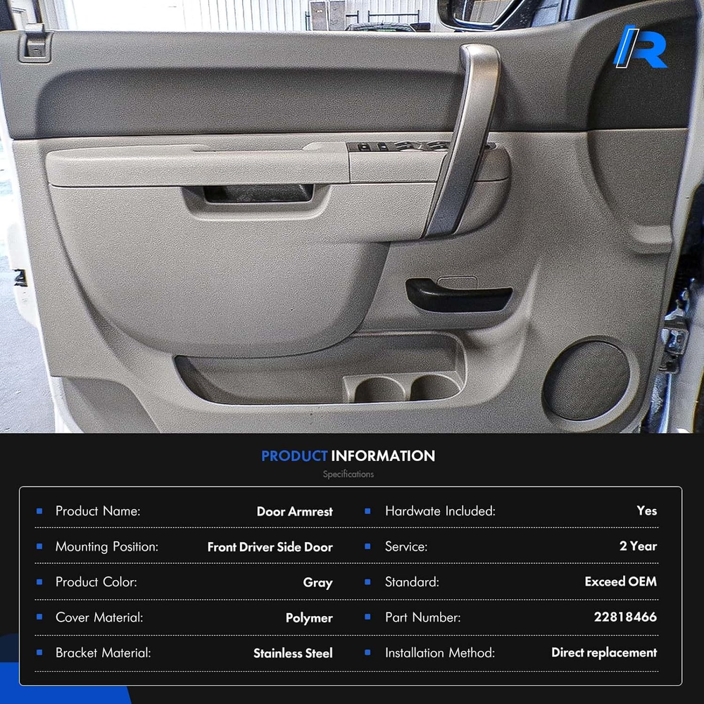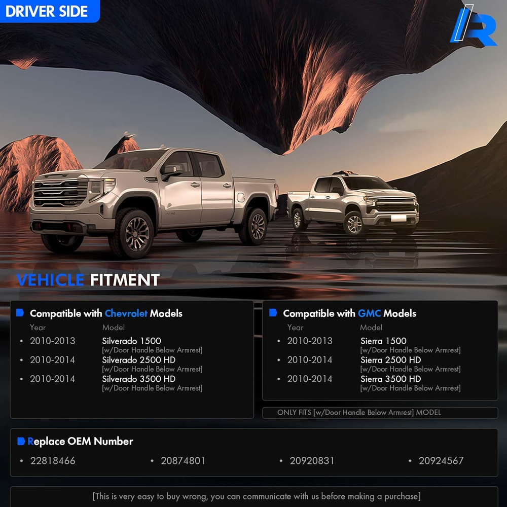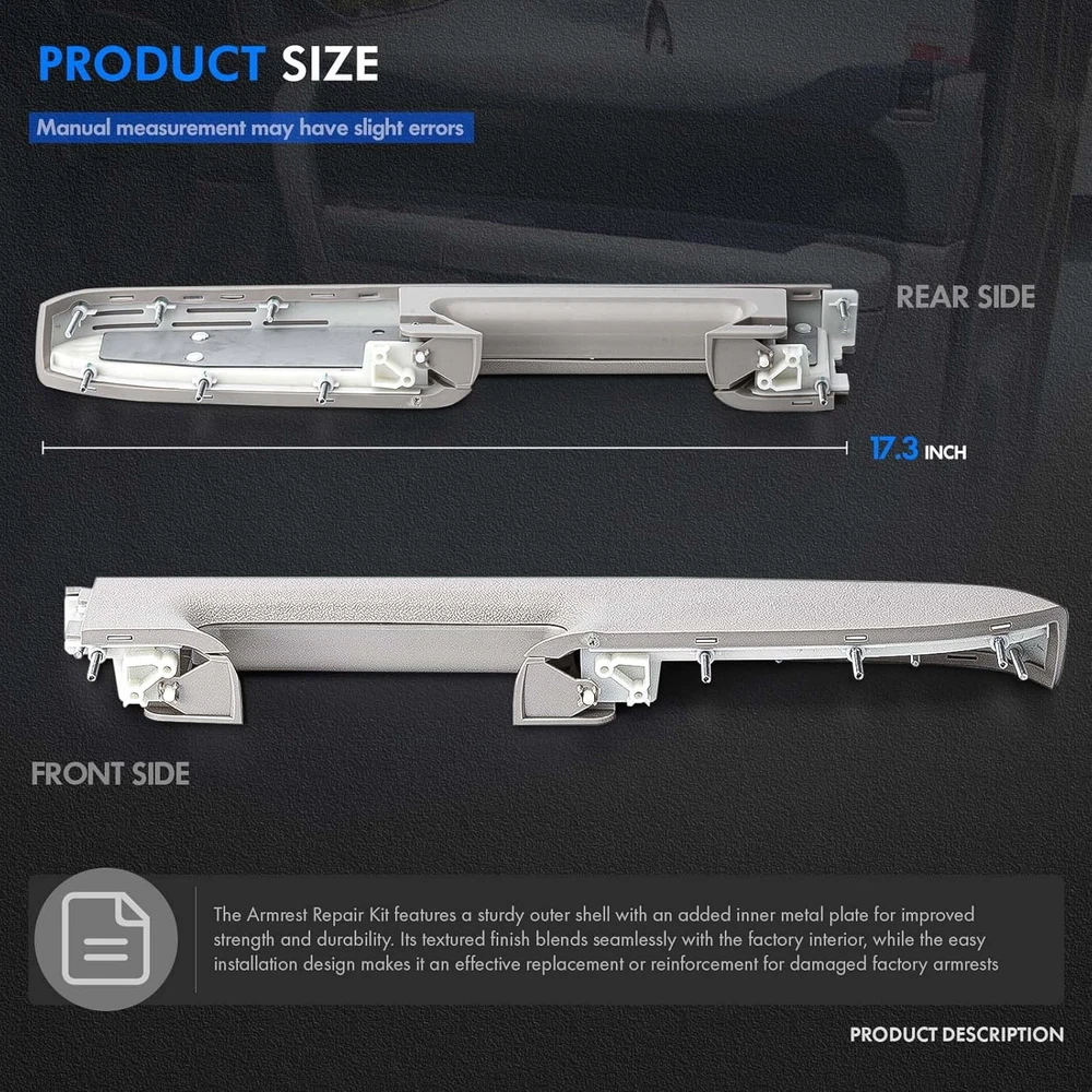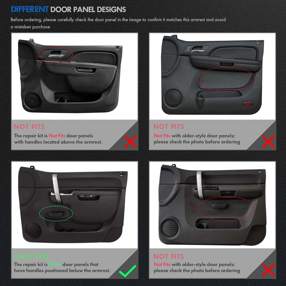 [Vehicle Models]: Compatible with Chevrolet Silverado 1500 2010-2013, Silverado 2500 HD 2010-2014, Silverado 3500 HD 2010-2014; Compatible with GMC Sierra 1500 2010-2013, Sierra 2500 HD 2010-2014, Sierra 3500 HD 2010-2014 / 2010 2011 2012 2013 2014 [Replace Part Number]: Front Driver Side Interior Door Trim Panel Replace for GM# 22818466, 20874801, 20920831, 20924567, 23402965, 22818468, 20874803, 20920833, 20924569 [Adding Metal Brackets]: Since the OEM inner door panel armrests are prone to breaking in the middle, we use an upgraded ABS plastic skeleton and add a metal bracket in the middle of the armrest. This ensures a longer lasting repair compared to the original plastic design [Enhanced Comfort and Aesthetics]: The front driver-side inside door panel pull handles is specifically designed for vehicles door panels with a door release handle below the armrest, enhancing driver comfort while improving the overall aesthetics of the interior. You can choose accessories that match the color of your door or experiment with a unique mix-and-match look, different from the original setup [Ease of Maintenance]: You can replace just the door armrest instead of the entire door panel. Note: ONLY fit for door panels with a door release handle below the armrest [Buy with Confidence]: We sincerely appreciate the purchase of our Front Left Driver Side Armrest Repair. If product has any quality issues, you can request to send a new product, we value your shopping experience Product description