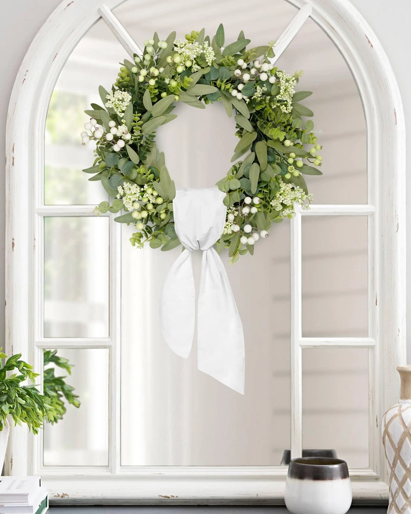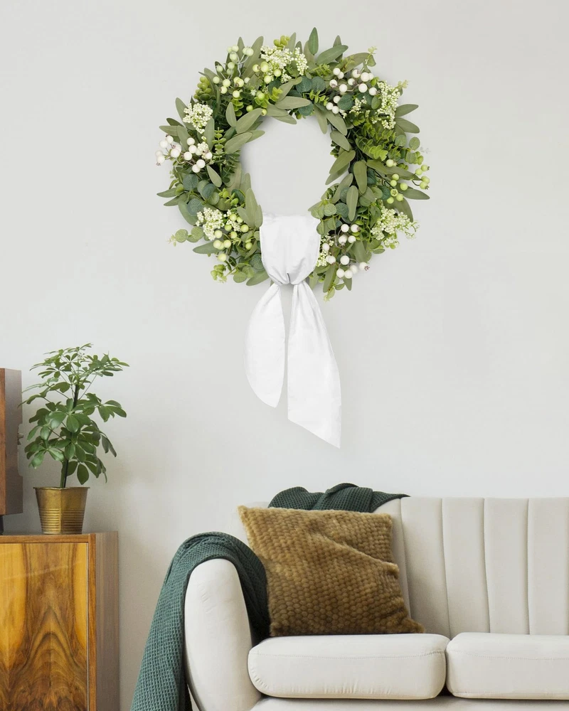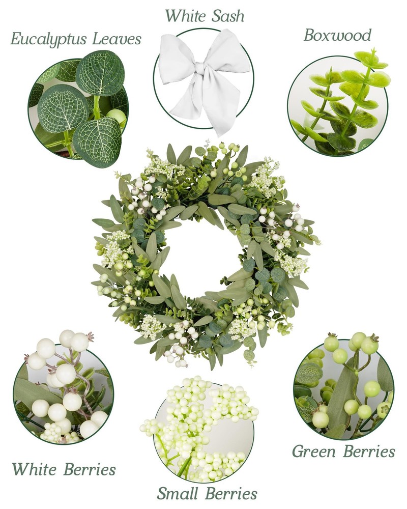 Artificial Eucalyptus Wreath 【All year round wreath】Available all year round:spring, summer, fall, and winter. Add themed decorations according to the festival, this is a flexible and versatile wreath. 【Full and realistic】 's handmade green eucalyptus wreath features eucalyptus leaves, boxwood, white/green berries, andmany small berries embellishedon it, making the wreath full, natural and realistic. Its elegance add a vibrant and pleasant vibe to your home. 【Perfect Size】 This spring wreath is 22 inches in diameter. Each rustic farmhouse eucalyptus wreath is packed in a sturdy and exquisite box, suitable as a gift for friends. Note that because the wreath is compressed by the box to avoid being damaged during delivery, please fully stretch it to reach its maximum size. 【Versatile】This gorgeous wreath is a versatile decoration. It is suitable for all seasons of the year, spring, summer, fall and winter. You can add elements from each season, such as bells and pinecones, to turn it into a Christmas wreath. When you design it yourself, you will find that your wreath is the most unique scenery. It can be hung on the wall, front door, porch, bedroom, living room, etc. It is perfect for indoor and outdoor, weddings and parties. It's elegance is sure to impress your family and friends. 【Durable】Made of high-quality materials. Colors will never fade; leaves will never fall; berries will never rot. No watering and special cleaning required. Can be used for years to come. 【Christmas Wreaths】This eucalyptus wreath with berries can be turned into a Christmas wreath by tying a red bow, pairing it with pinecones, bells, and some red berries. It will stay with you all winter long. 【TIPS】 If you have any problem with our products, please contact us immediately,we will reply you ASAP.