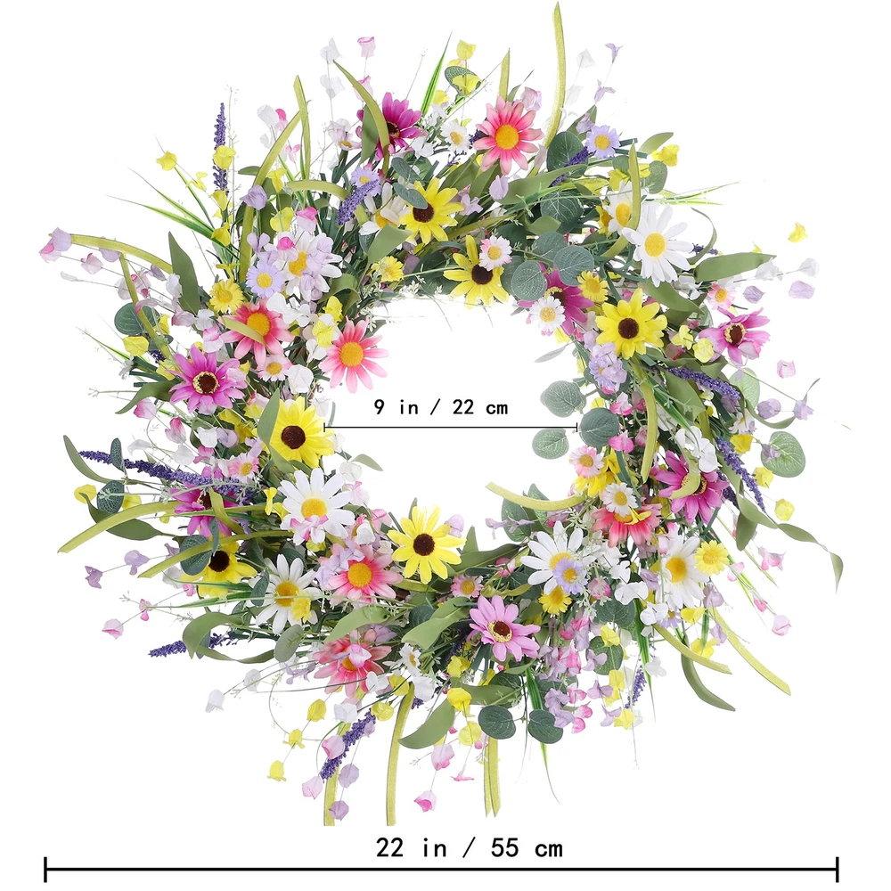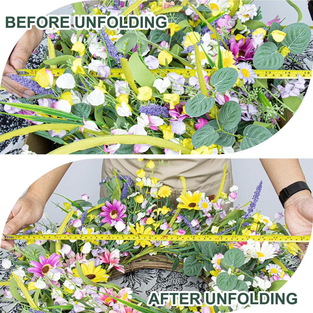 All our products have quality ,if you have any questions or problems with our products,please feel free to ,we will help you to solve the issues as soon as possible. Information: Our rustic wildflower wreath has an inner diameter of 10 inches and an outer diameter of 22 inches. In order to obtain a good display effect, please fully expand the branches of the spring wreath for front door after receiving it Handmade: The floral branches on our spring flower wreaths are fixed by hand, so they are very firm. Even if you shake them after receiving, the branches on the summer door wreath will not fall off, so you can hang our wildflower wreath for a long time Attractive: Spring door wreath as the first impression for guests. Our spring wreath for front door features colorful daisy flowers, Hanging our spring flower wreaths not only attracts the attention of visitors, but also sets good expectations for our home Convenient: As an important part of spring decoration, our colorful spring flower wreaths are very convenient and quick to use. You only need to hang our spring flower wreaths on the front door to enjoy the rich spring atmosphere Note on spring wreath for front door : When using the wildflower wreath, please try to use our colorful spring flower wreaths indoors and avoid prolonged with water. When using it outdoors, please pay attention to rain and wind protection