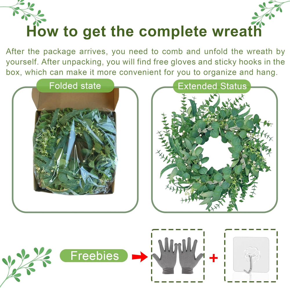 Store New Arrivals Add to Favorite View Feedback Contact Fast deliveries to the customer's home Quality customer service John Make the customers happy! Spring Wreath 22 Inch Spring Summer Wreaths with Eucalyptus Leaves and Berries Seasons Green Eucalyptus Wreath for Farmhouse Porch Front Door Wall Decor and Year round Use Description Durable and Long-lasting: The green eucalyptus wreath is made of a sturdy grape vine base, eucalyptus leaves made of silk material, and high-quality plastic berries. It is lifelike, durable, and will never rot or wither, making it an ideal spring wreath for the front door Full and Realistic: The natural vine base of the spring wreath is covered with emerald green eucalyptus leaves, plump white berries and small pine cones, full of spring vitality and vigor. It is the best choice for spring and will add vitality and life to your home Widely Used: Handmade four seasons wreath with a size of 22 inches are not only suitable for year-round use, but also an excellent gift for indoor and outdoor holiday celebrations, housewarming, harvest, Thanksgiving, and Christmas. They are eye-catching decorations in any season Easy to Hang: Our 22-inch spring and summer wreaths have a simple bendable hanging ring on the back and thoughtfully provide a self-adhesive hook and gloves to organize and hang the wreaths, so you can hang them directly where you want when you receive them, which is very convenient Worry Free After - Sales Service: As our summer wreaths are handmade, there may be some fallen leaves when unfolded, which is a normal phenomenon. If you encounter any problems, please let us know as soon as possible, and we will definitely help you solve them within 24 hours Product Description How to Get an Ideal Four Season Front Door Wreath The wreath measures 22 inches after fluffing. Since the wreath is packed in a relatively small box to meet transportation requirements, you need to expand the branches and adjust the flowers into the best shape, and then you'll get a 22-inch full-sized wreath Full of vitality all year round This product is made of high - quality materials. Its colors will never fade, its leaves will never fall and its berries will never rot. No watering or special cleaning is required. It can be used for years to come Can be well integrated into home decoration in various scenes The MAINGKAUNG handmade green eucalyptus wreath features eucalyptus leaves, white berries, and many small berries that embellish it, making the wreath full, natural, and realistic. Its elegance adds a vibrant and pleasant vibe to your home Integrate with the scenery of spring This gorgeous wreath is a versatile decoration. It is suitable for all seasons of the year, spring, summer, fall and winter. You can add elements of each season to it, such as maple leaves, bells, etc. When you design it yourself, you will find that your wreath is the most unique scenery. It can be hung on the wall, front door, porch, bedroom, living room, etc. It is perfect for both indoor and outdoor use, as well as for weddings and parties. Its elegance is sure to impress your family and friends Customer need to know ! What is the size of this spring wreath? This spring wreath of ours measures 22 inches, and for easy storage, we've placed it in a delicate 14-inch diameter box, so all you have to do is unfold this spring wreath according to the included instructions, and you'll have an ideal 22-inch diameter spring front door wreath! What to hang this summer wreath with? Our summer wreath not only comes with sticky hooks, but also comes with a pair of gloves, making it easier for you to hang the wreath and prevent scratches. What is the base of this wreath made of? Our Four Seasons Eucalyptus Wreath Base is made of natural vines that are more than two years old. It is sturdy and durable, and you can buy it with confidence! Is this an outdoor wreath? This beautiful summer wreath is suitable for indoor and outdoor, wall, window and front door decoration. It should be noted that if used outdoors, it must be hung under a cover to avoid rain and snow erosion. Item model number YMX0010 Indoor/Outdoor Usage Outdoor, Indoor Mounting Type Door Mount Color Green Material Silk, Plastic Country of Origin China Item Weight 13.76 ounces Shape Round Seasons Winter, Summer, Fall, Spring Occasion Easter, Valentine's Day Special Feature Second generation high quality foam material, Silk material production, Natural grapevine base Product Dimensions 22"D x 22"W x 5"H ABOUT US We offer the best prices around on high quality products. Our E-store includes media such as books, movies, music and games while offering electronics, toys, sporting apparel, clothing, tools, general home, garden items and more. SHIPPING We are always working hard to ensure your package arrives as soon as possible. Please understand that some factors like weather, high postal traffic, and the performance of shipping companies are outside of our control. We offer free shipping to the lower 48 states and ship within 2 business days of payment, usually sooner. We do not accept P.O. Boxes. Please provide a physical address. For shipping outside of the continental USA, we only use eBay's Global Shipping Program. The item is shipped to KY and then sent to the rest of the world. International customers are responsible for all duties and taxes. Continue to 'check out' to calculate costs for shipping the item to your country. Messages regarding eBay's Global Shipping Program MUST be directed at eBay EXCLUSIVELY. RETURNS We offer a 30-Day Return Policy on items in which you are not completely satisfied with. You have the option of a full-refund or an exchange of the item. No returns are available on items shipped outside of the USA PAYMENT We accept PayPal. CONTACT US This page content is yet to come Please ad us to your favorite seller and visit again later Thank You CUSTOMER SATISFACTION We try our very best to make sure every customer is completely satisfie