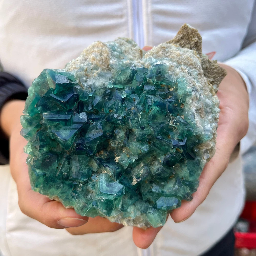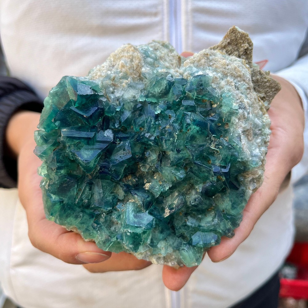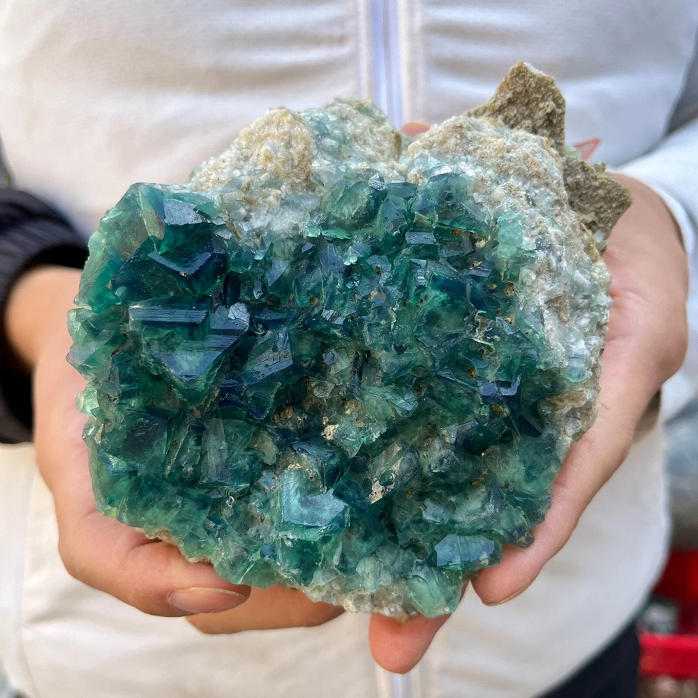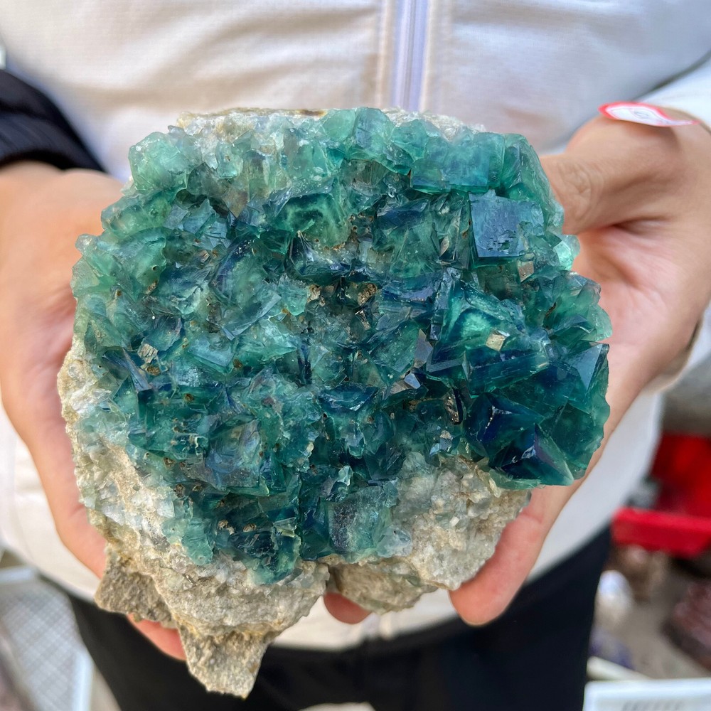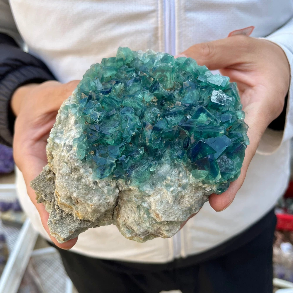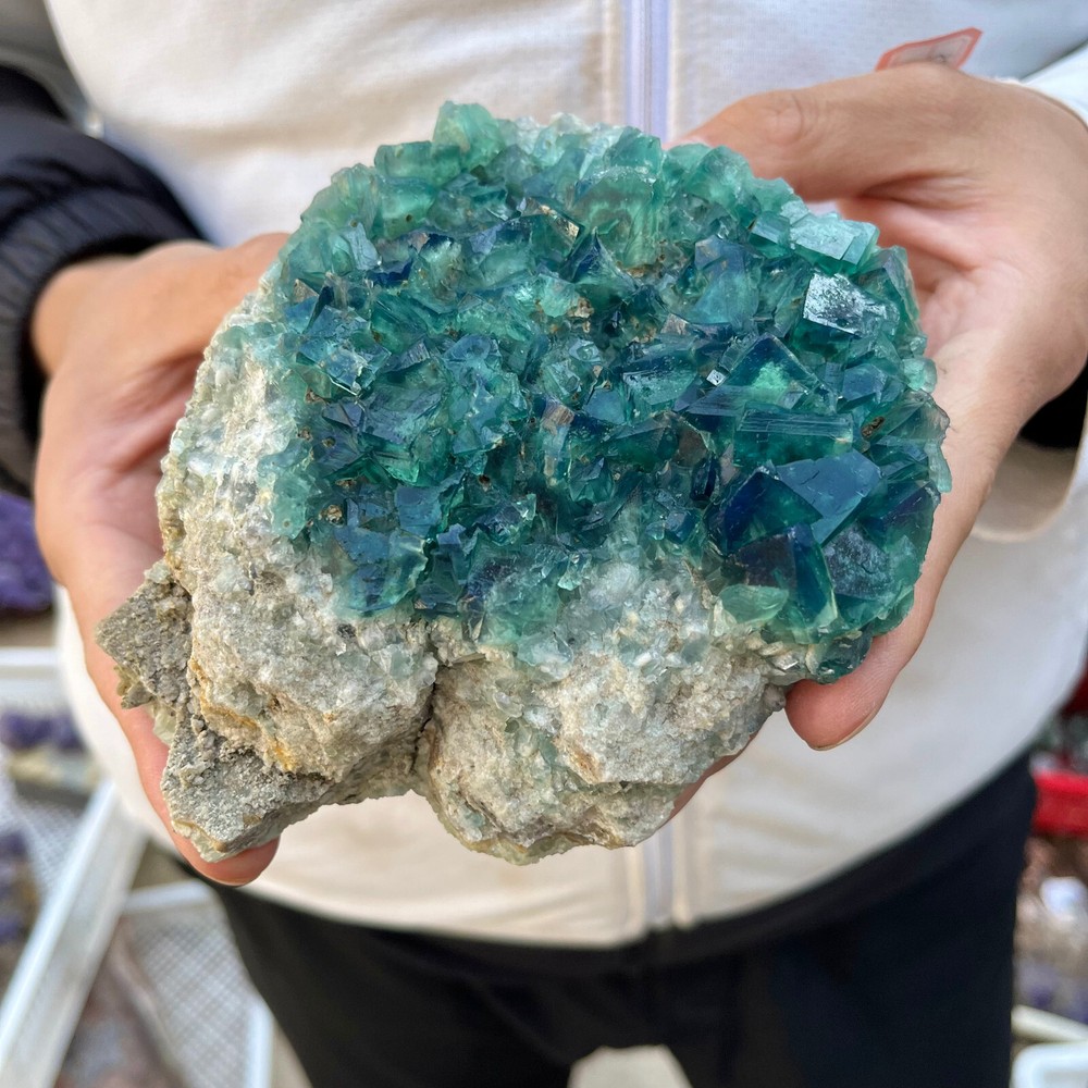 Amazing blue green hues in the fluorite. Item got here super quickly and it was wrapped completely in bubble wrap and tape. It looks exactly like the picture. It’s a solid chonk of a rock with interesting white flecks of crystal on the bottom. A+ transaction!!!