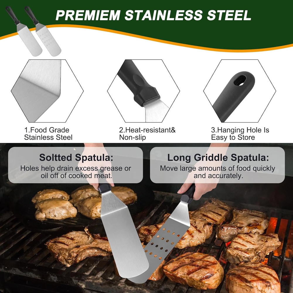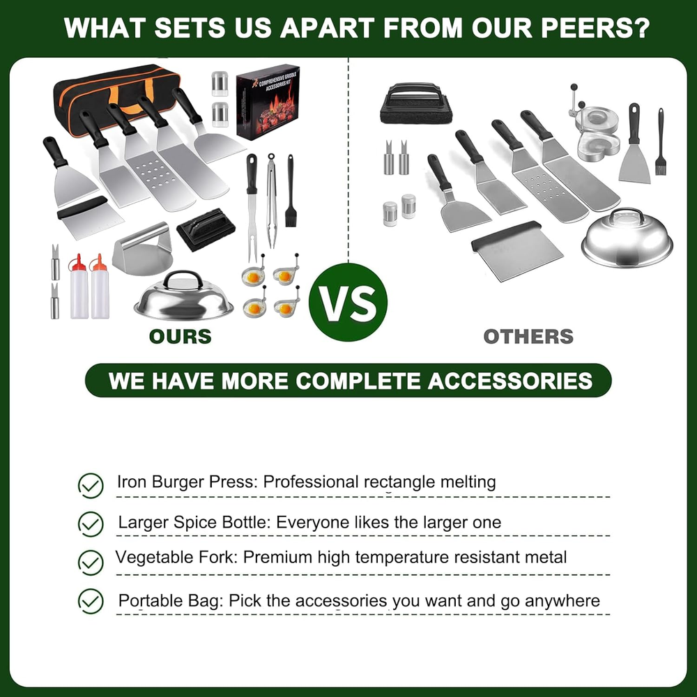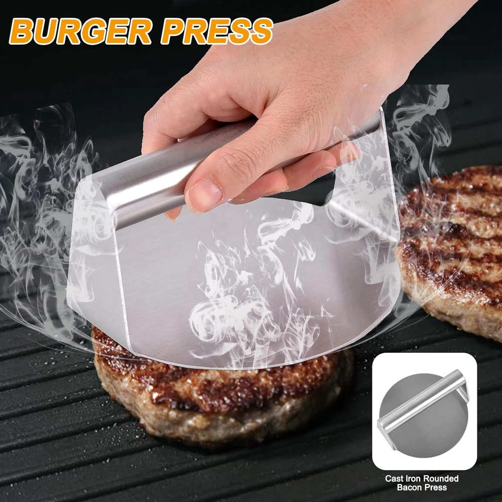 This set has everything I need for my Blackstone! The spatulas feel sturdy, the burger press makes perfect patties, and having the spice bottles right on the griddle is a game-changer. Total must-have for any griddle enthusiast.