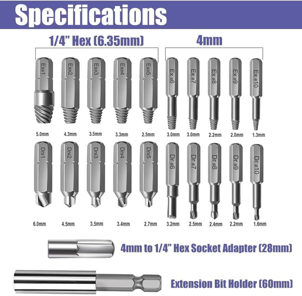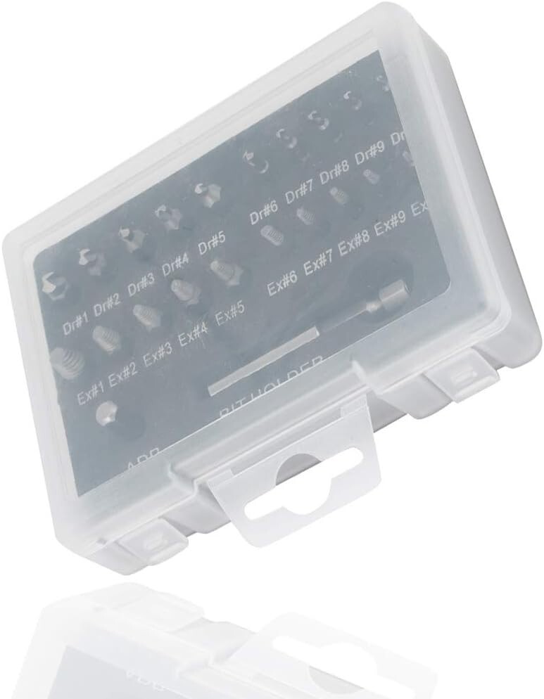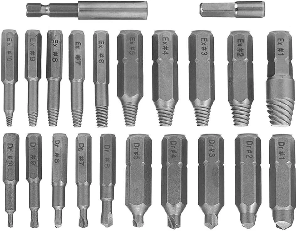 Yakamoz 22Pcs Mini Damaged Screw Extractor Kit Small Stripped Screws Remover Easy Out Broken Bolt Extractor Rusty Screw Removal Tool with Magnetic Extension Bit Holder & Socket Adapter Description Multiple Sizes - Includes 22pcs and composed of 10 different sizes of drills and extractors which makes it compatible with all kinds of drills and remove any type of screws and bolts. Effortless Screw Extraction: - Stripped screw extractor with spiral design enhances grip and minimizes slipping can remove damaged, stripped, or rusted screws and bolts effortlessly. Easy to Use - Choose a drill bit smaller than the damaged screw to drill a hole first. Then attach the extractor to your drill, apply moderate pressure, and watch as the damaged screw loosens and comes out. High Quality - These damaged screw extractor made of High-Speed Steel 4241 for maximum strength and high hardness, remove the broken or rusting screws easily. Must-Have Tool - Ideal for handyman, woodworker or fitment worker, provides an extractor bit to remove all common sizes of damaged, stripped or broken screws.