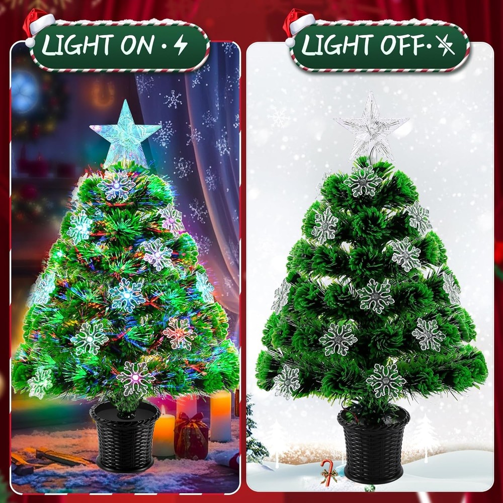 🎄 Package includes: Fiber optic little tree*1, snowflake ornaments*15,base*1 and star tree topper*1.Standing 22in tall,measures from top to bottom including the base and tree toper. The fiber optic color can exchange between red, green, blue and mixed colors, it will be your holiday tree for years to come. 🎄Durable PVC Construction:Crafted with 52 tips of high-quality PVC needles, this mini Christmas tree offers a lush, lifelike appearance. The material is anti-aging and flexible, ensuring it stays beautiful year after year. 🎄 Dual Power Options: USB or Battery.Enjoy versatile placement with two power choices: use the included USB cable or 3 AA batteries (not included). 🎄 Stable Base for Secure Display:Includes a strong plastic base that keeps the small xmas tree upright and steady. Designed for high stability, it prevents tipping and ensures your decorative setup stays safe and picture-perfect all season long. 🎄 Indoor & Outdoor Holiday Table Decor:Ideal for adding Christmas charm to apartments, offices, dorm rooms, tabletops, mantels, windowsills, or even covered outdoor spaces. A compact yet eye-catching mini xmas tree that brings magical color to any setting.