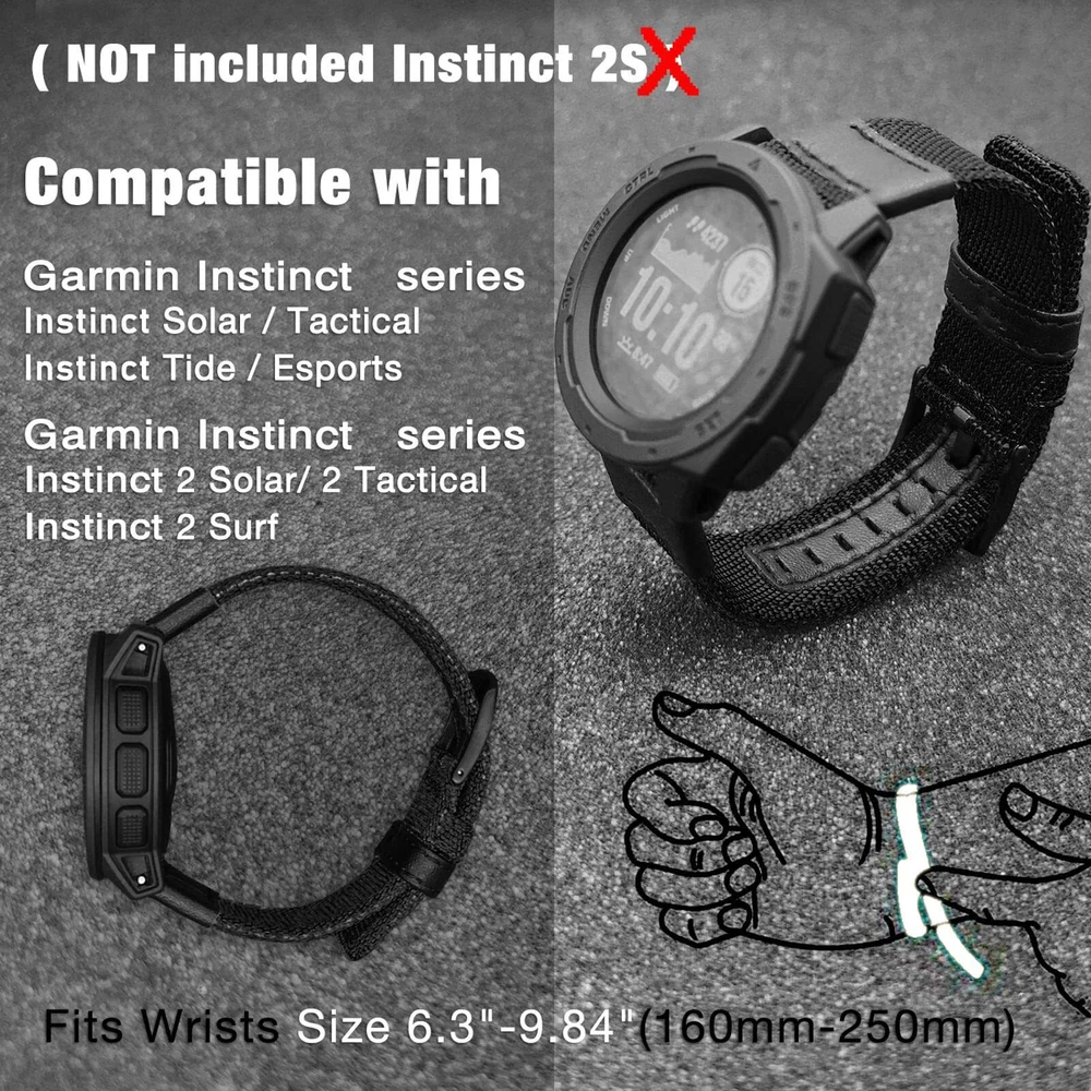 Notice: -- Watch Band only, Smart Watch not included. From , Smart Watch Accessories Brand -- 22mm Band Width -- Made of woven nylon, absorbent and fine craftwork make it comfortable to wear -- Military Sports Style design, give your smartwatch a new whole look and experience,, -- Easy and simple installation or removal. -- Fit wrist size 6.12"-9.4"(150mm-240mm) Compatible with Garmin Smartwatch Version: -- Instinct 2 / Instinct 2 Solar / Instinct 2 Surf / Instinct 2 Tactical (Not included Instinct 2S) -- Instinct -- Instinct Tactical -- Instinct Tide -- Instinct Esports -- Instinct Solar What's in Package: 1 x 22mm Nylon watch band 1 x Removal pin 2 x Connector pins ▶ Compatible with Garmin instinct / instinct 2 series, 22mm watch band Compatible with Garmin Instinct Tactical / Instinct Tide / Instinct Esports/ Instinct Solar, Instinct 2 / Instinct 2 Solar / Instinct 2 Surf / Instinct 2 Tactical (NOT included Instinct 2S) . ONLY Watch Band, NOT inclued smart watch. ▶ Made of durable and sweatproof nylon fabric,be shock-absorbent and non-slip, comfortable and breathable feeling. Military Sports Style design, give a whole new look of your Instinct watch. ▶ Stainless Steel Adjustable Buckle, According to the circumstance of individual wrist, fit wrist size 6.12"-9.4"(150mm-240mm) . ▶ Easy Installation / Remove: The nylon band can be installed onto Instinct Watch Lugs (Come with package) on both ends precisely and securely. Easy and simple installation or removal. ▶ We are strict in product quality control, but please feel free to contact us if there are any scratches or defects by any chance.We will correspond promptly to change or refund.
