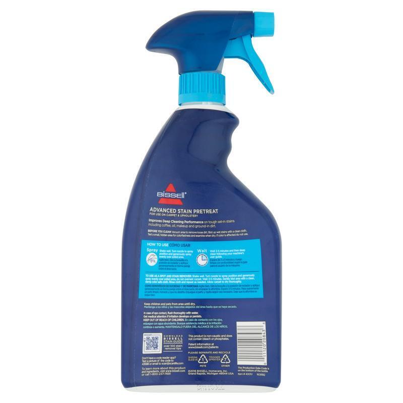 The BISSELL Stain Pretreat for Carpet & Upholstery, 22 oz, 4001V is a stain pretreat, for carpet and upholstery. It is specially formulated to safely penetrate deep into carpet fibers and loosen and remove tough carpet stains and embedded dirt. It safely cleans and deodorizes carpet, upholstery, mattresses, and car interiors. It is a powerful everyday cleaner that helps remove many spots and stains including gravy, coffee, and ground in dirt. The makes deep cleaning your carpets easier and leaves your carpet fresh with no sticky residue. The BISSELL Stain Pretreat for Carpet & Upholstery is safe for stain resistant carpet. It is specially formulated for cleaning stains and heavy traffic areas such as your living room, bedroom, car, and other areas of your home prone to stains. It is a powerful everyday cleaner that helps remove many spots and stains, should be your first step in spot and carpet cleaning, and makes carpet cleaning more effective. BISSELL Stain Pretreat for Carpet & Upholstery, 22 oz, 4001V Powerful everyday cleaner that helps remove spots and stains including gravy, coffee, make-up and ground-in dirt First step in spot and carpet cleaning Makes carpet cleaning more effective For use on carpet and upholstery Every Purchase Saves Pets! BISSELL proudly supports BISSELL Pet Foundation and its mission to help save homeless pets. Features: Pet Stain & Odor Remover Brand: Bissell Scent: Unscented Stain Remover Type: Laundry Stain Remover Recommended Surface: Carpet Applicator Type: NOT STATED Cleanser Form: Sprays Assembled Product Weight: 1. 56 lb Manufacturer Part Number: 4001V Manufacturer: Bissell Assembled Product Dimensions (L x W x H): 2. 32 x 4. 50 x 10. 62 Inches