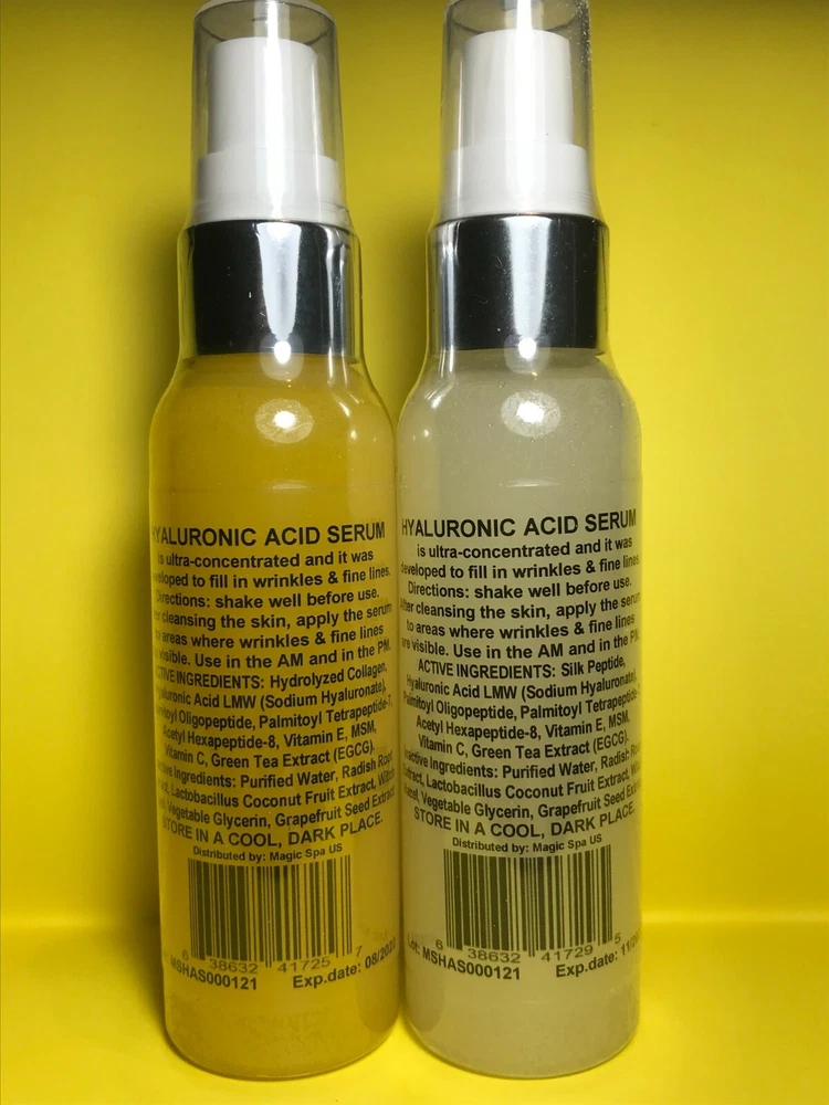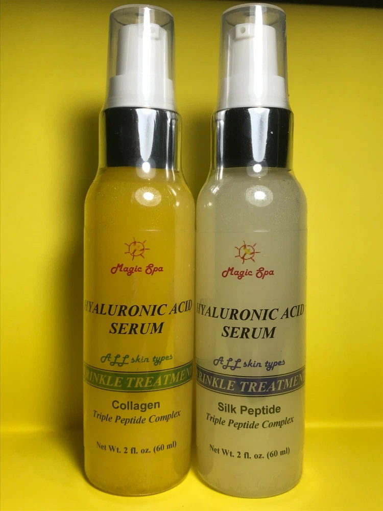 HYALURONIC ACID SERUM (SEALED by the manufacturer) with Collagen and Triple Peptide Complex 2 fl. oz. (60 ml) Expiration date: 09/2026 Active Ingredients : Hydrolyzed Collagen, Hyaluronic Acid LMW (Sodium Hyaluronate), Palmitoyl Oligopeptide, Palmitoyl Tetrapeptide-7, Acetyl Hexapeptide-8, Vitamin E, MSM, Vitamin C, Green Tea Extract (EGCG). AND HYALURONIC ACID SERUM (SEALED by the manufacturer) with Silk Peptide and Triple Peptide Complex 2 fl. oz. (60 ml) Expiration date: 06/2026 Active Ingredients : Silk Peptide, Hyaluronic Acid LMW (Sodium Hyaluronate), Palmitoyl Oligopeptide, Palmitoyl Tetrapeptide-7, Acetyl Hexapeptide-8, Vitamin E, MSM, Vitamin C, Green Tea Extract (EGCG). HYALURONIC ACID SERUM is ultra-concentrated & it was developed to fill in wrinkles & fine lines. Direction: shake well before use. After cleansing the skin, apply the serum to areas where wrinkles & fine lines are visible. Use in the AM and in the PM. Inactive Ingredients: Purified Water, Radish Rood Extract, Lactobacillus Coconut Fruit Extract, Witch Hazel, Vegetable Glycerin, Grapefruit Seed Extract. STORE IN A COOL, DARK PLACE. Hyaluronic Acid is Low Molecular Weight (LMW) Low-weight hyaluronic molecules penetrate DEEPER into the skin’s structure, providing maximum BELOW-THE-SURFACE HYDRATION and in turn rehydrating skin cells over time. Low molecular weight (LMW) hyaluronic acid has been bioengineered into smallest pieces. These tiny molecules penetrate deeper in the epidermal layers, giving hyaluronic acid LMW a kind of plumping effect that gives the skin a full and youthful appearance. HA can hold up 1,000 times its weight in water and is responsible for giving skin its plumpness and volume. The Serum: v Fills in wrinkles & fine lines v Boosts your skin’s moisture v Keeps your skin hydrated v Provides Structure & Texture v Reverse Environmental Damage v Acts as an Anti-Oxidant v Made in the USA The Serum formulated WITHOUT : v Parabens v Sulfates v Synthetic Fragrances v Synthetic Dyes v Petro-Chemicals v Phthalates v GMOs