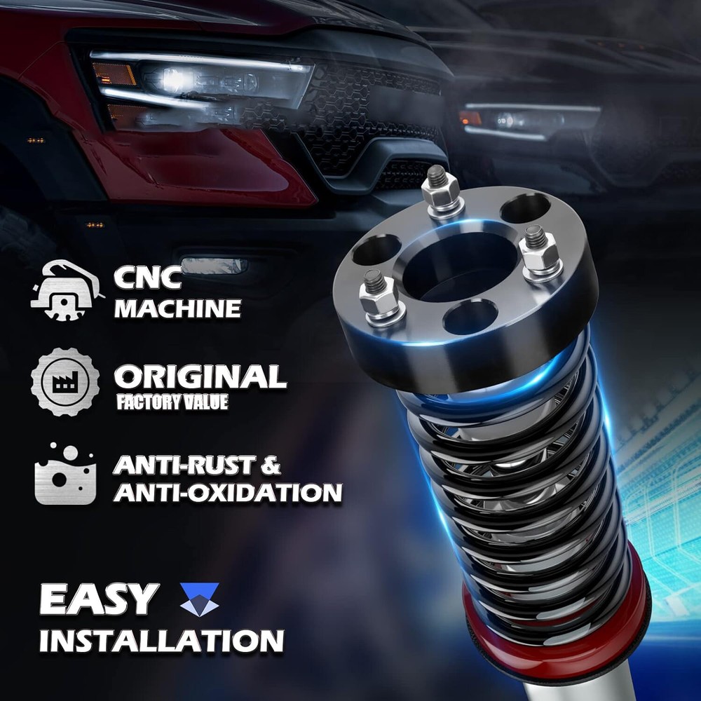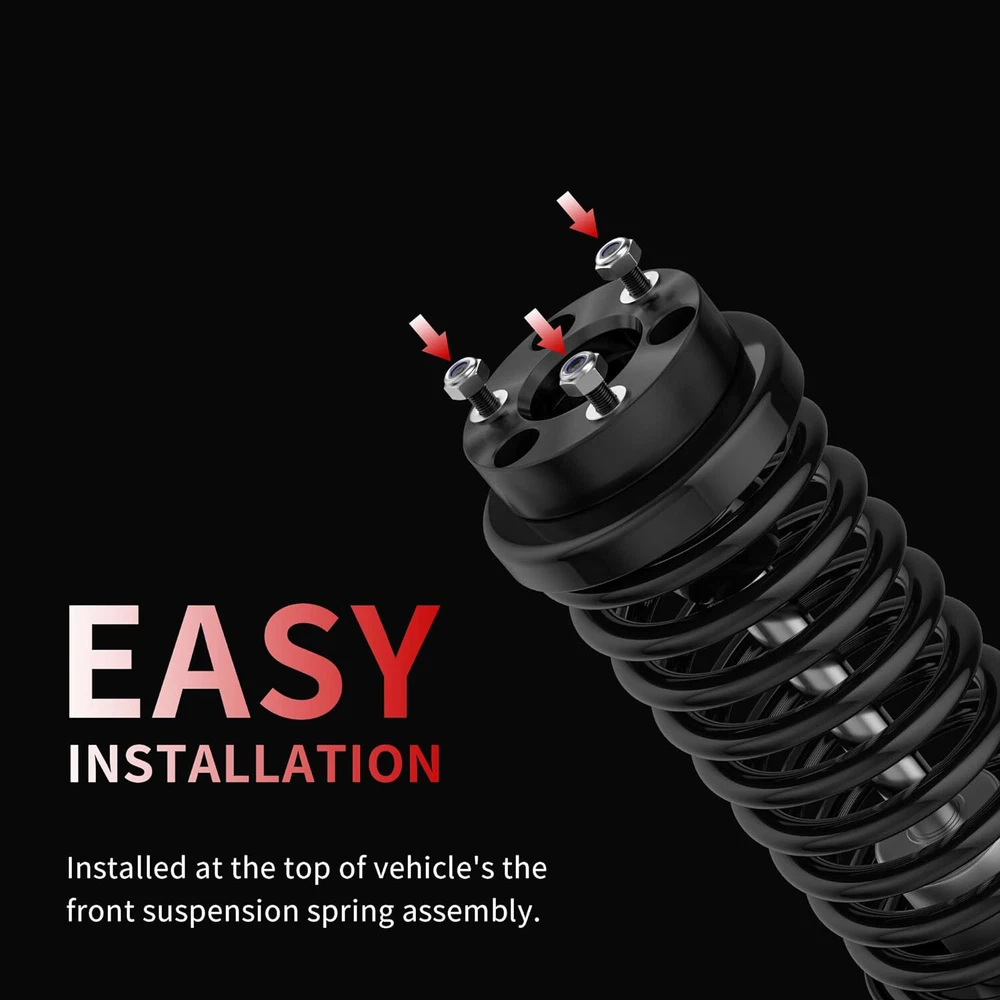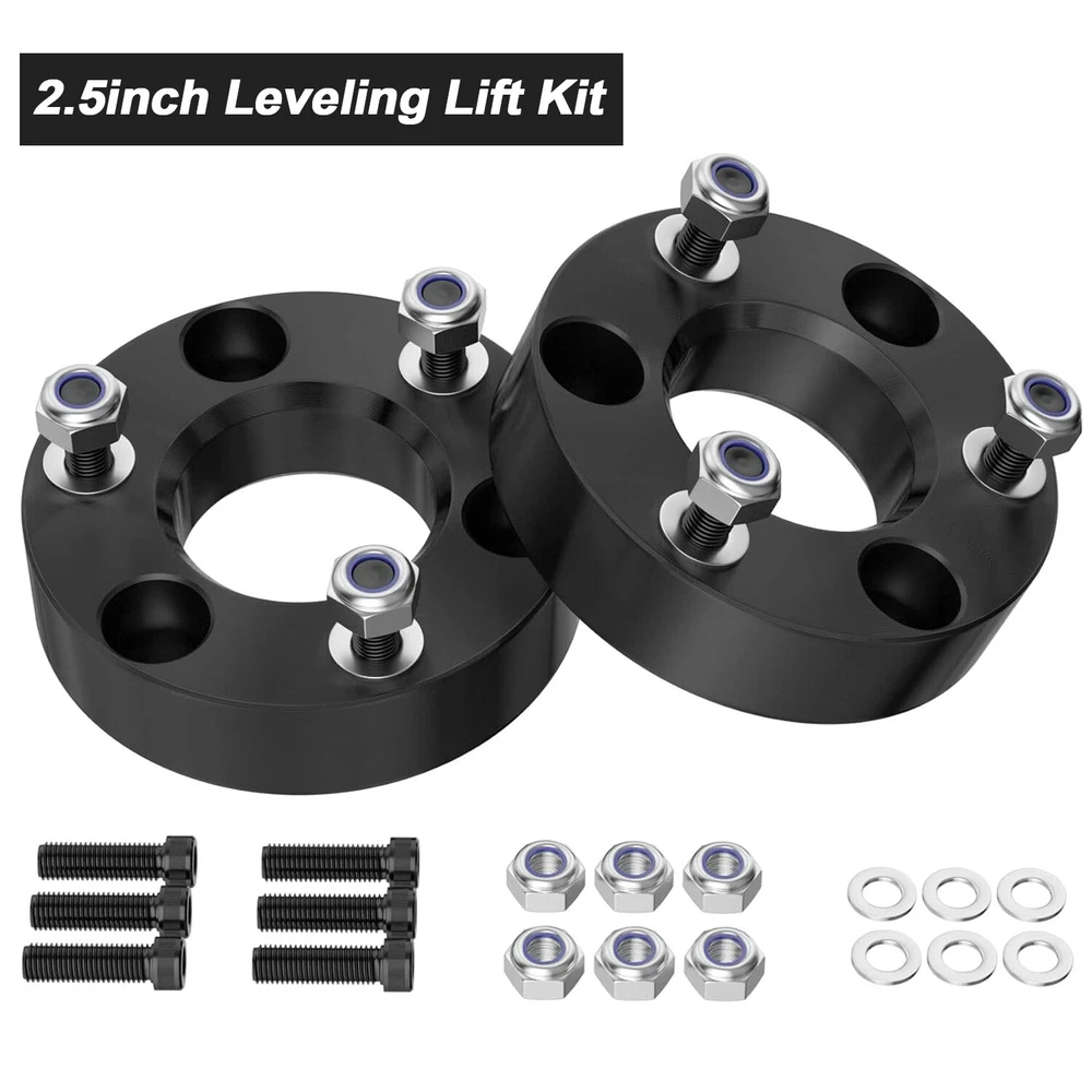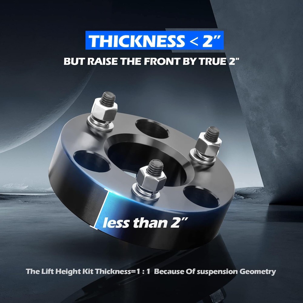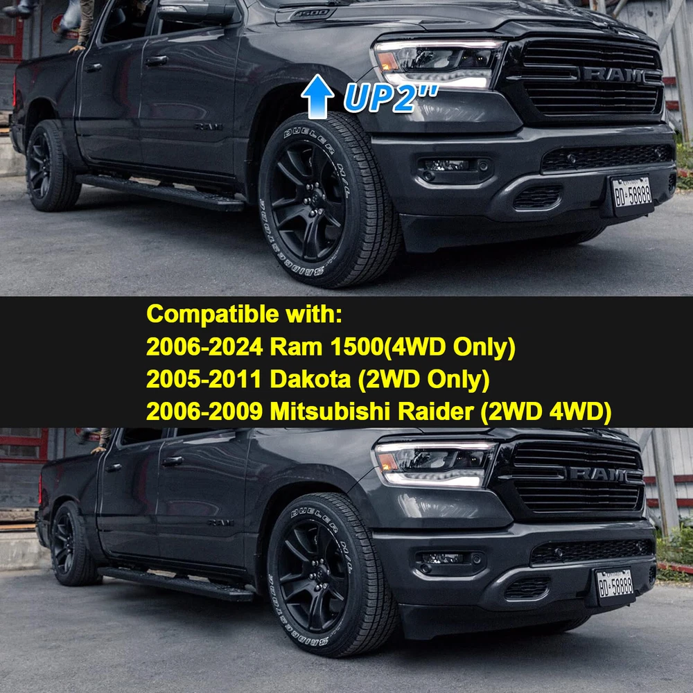【Compatible】2006-2024 Ram 1500(4WD Only), 2005-2011 Dakota (2WD Only), 2006-2009 Mitsubishi Raider (2WD 4WD) - Not fit Mega Cab Models or Ram Rebel Models.Not compatible with trucks equipped with the Active-Level Four-Corner Air Suspension. 【Benefits】(1)CNC automatic processing ensure high accuracy and stability(0.02mm), Provide accurate hole position for easy installation (2)6061-T6 aluminum forged alloymaterial sturdy and durable (3)High quality pre-installed heat treated 12.9 grade studs 【Function】The kit provides unparalleled ground clearance, Used to conquer off-road obstacles,And allow the installation of larger rims and tires. Make your truck look more aggressive 【Easy Install】Installation can be completed within 1-2 hours, No cutting and drilling required and does not require strut/coil disassembly like other kits 【Note】Improve the front of your truck by 2/2.5/3 inches, bringing a perfect change in the appearance, performance and style of your truck. Because of suspension geometry,the ratio between lift height and kit thickness is not 1:1 Compatible with: 2006-2024 Ram 1500(4WD Only) 2005-2011 Dakota (2WD Only) 2006-2009 Mitsubishi Raider (2WD 4WD) Not fit Mega Cab Models or Ram Rebel Models. Not compatible with trucks equipped with the Active-Level Four-Corner Air Suspension. 2inch Leveling Lift Kit Specifications: Quantity: Two (2) Real thickness: 1.25" Raise height: 2" Material: 6061-T6 Aerospace Grade Aluminum with 12.9 grade studs 2.5inch Leveling Lift Kit Specifications: Quantity: Two (2) Real thickness: 1.6" Raise height: 2.5" Material: 6061-T6 Aerospace Grade Aluminum with 12.9 grade studs 3inch Leveling Lift Kit Specifications: Quantity: TWO (2) Real thickness: 2" Raise height: 3" Material: 6061-T6 Aerospace Grade Aluminum with 12.9 grade studs Important Note: Due to suspension geometry, the ratio of the lifting height to the thickness of the lift kit is not 1:1. Package: 2 x Front Leveling Lift Kit 1 Set Nut.