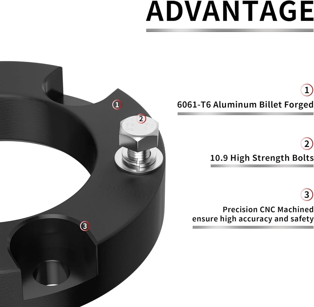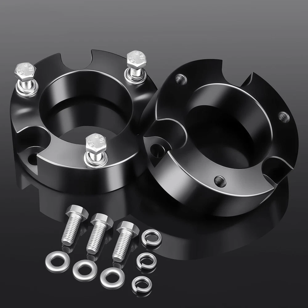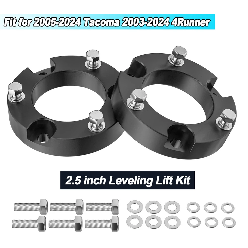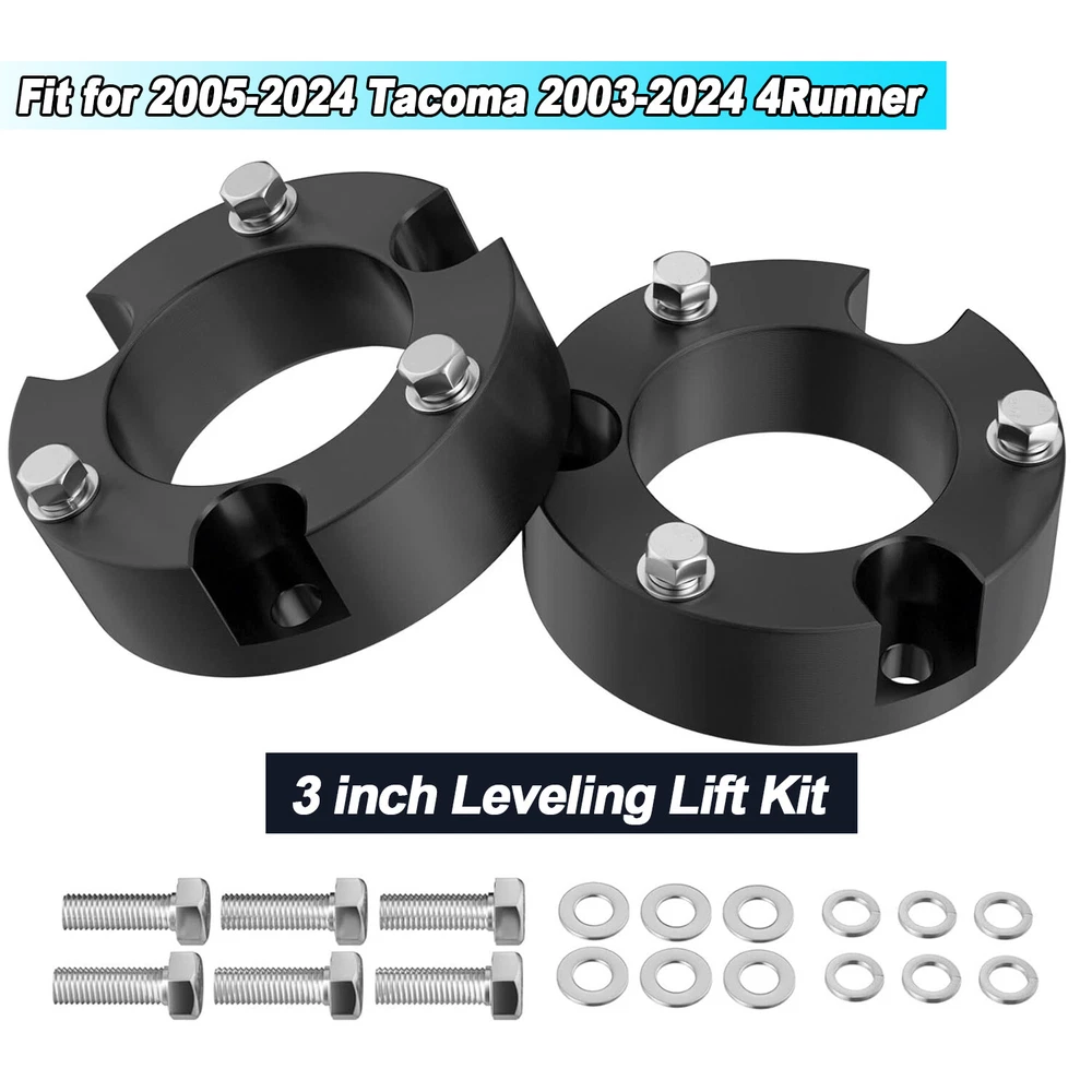 【Compatible】2005-2024 Tacoma 2WD 4WD (6 lugs only), 2003-2024 4Runner 2WD 4WD, 2007-2015 FJ Cruiser 2WD 4WD - Does not fit Tacoma 5-Lug Models, 2017 TRD Off-Road Model OR 2018+ TRD PRO Models. Does NOT Fit 4Runner Limited Models w/ X-REAS Hydraulic Struts OR 2018+ TRD PRO Models 【Benefits】(1)CNC automatic processing ensure high accuracy and stability(0.02mm), Provide accurate hole position for easy installation (2)6061-T6 aluminum forged alloymaterial sturdy and durable (3)High quality pre-installed heat treated 12.9 grade studs 【Function】The kit provides unparalleled ground clearance, Used to conquer off-road obstacles, And allow the installation of larger rims and tires. Make your truck look more aggressive 【Easy Install】Installation can be completed within 1-2 hours, No cutting and drilling required and does not require strut/coil disassembly like other kits 【Note】Improve the front of your truck by 3/2.5/2 inches, bringing a perfect change in the appearance, performance and style of your truck. Because of suspension geometry,the ratio between lift height and kit thickness is not 1:1 【Product Warranty】All products are covered by two years warranty to be free of defects in material and workmanship for two years from date purchased. If you have any questions or you are not satisfied with the product, welcome to contact us Compatible with: 2005-2024 Tacoma 2WD 4WD (6 lugs only) 2003-2024 4Runner 2WD 4WD 2007-2015 FJ Cruiser 2WD 4WD Does not fit Tacoma 5-Lug Models, 2017 TRD Off-Road Model OR 2018+ TRD PRO Models. Does NOT Fit 4Runner Limited Models w/ X-REAS Hydraulic Struts OR 2018+ TRD PRO Models. 3 inch Front Leveling Lift Kit Specifications: Quantity: Two (2) Real thickness: 1.5" Raise height: 3" Material: 6061-T6 Aerospace Grade Aluminum with 12.9 grade studs 2.5 inch Front Leveling Lift Kit Specifications: Quantity: Two (2) Real thickness: 1.25" Raise height: 2.5" Material: 6061-T6 Aerospace Grade Aluminum with 12.9 grade studs 2 inch Front Leveling Lift Kit Specifications: Quantity: Two (2) Real thickness: 1" Raise height: 2" Material: 6061-T6 Aerospace Grade Aluminum with 12.9 grade studs Package: 2 x Front Leveling Lift Kit 1 Set Nut.