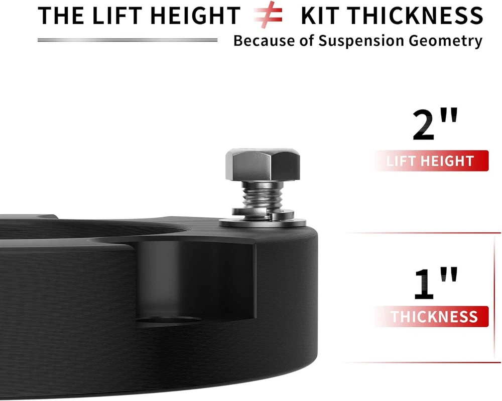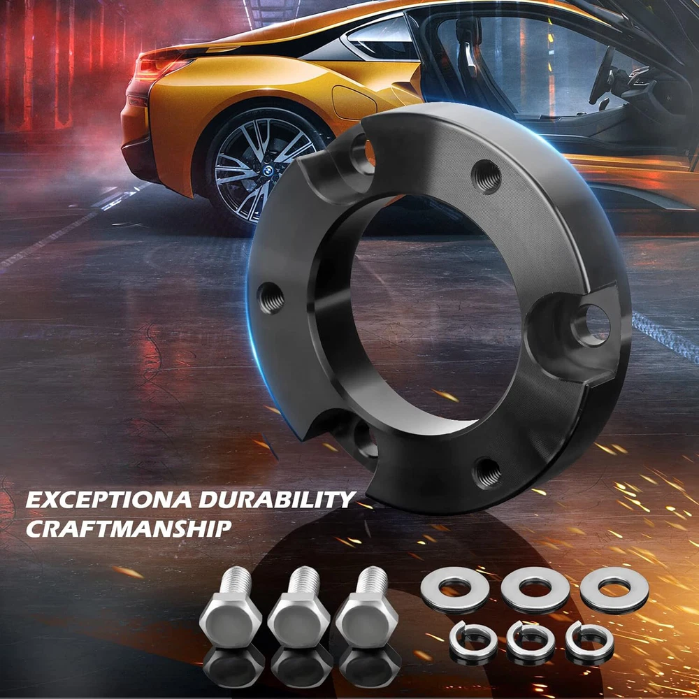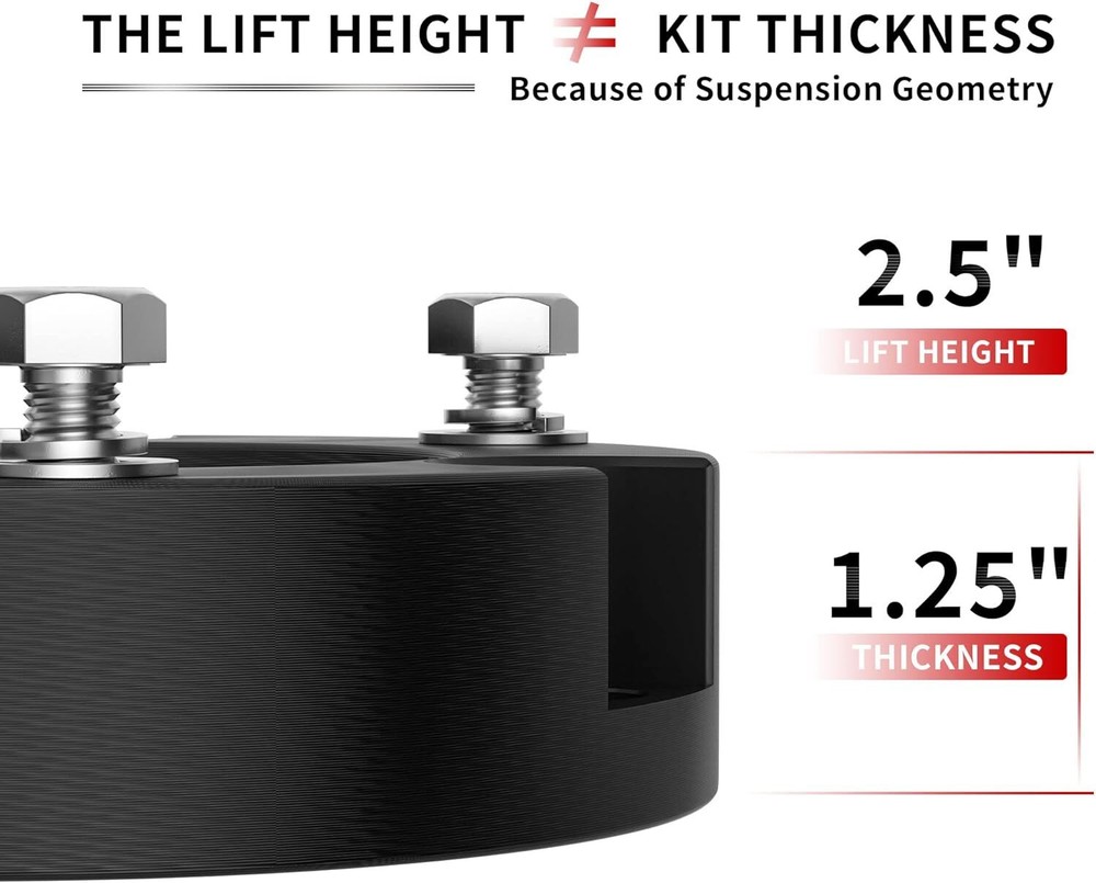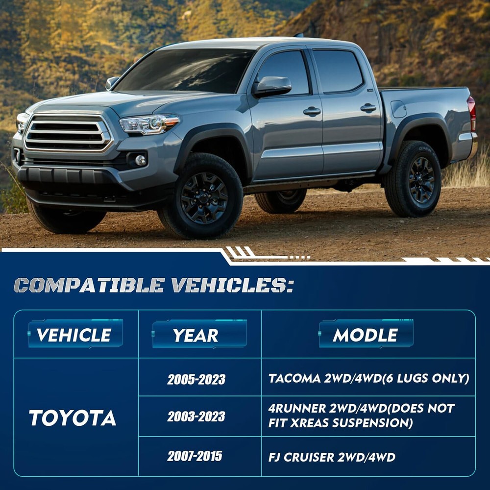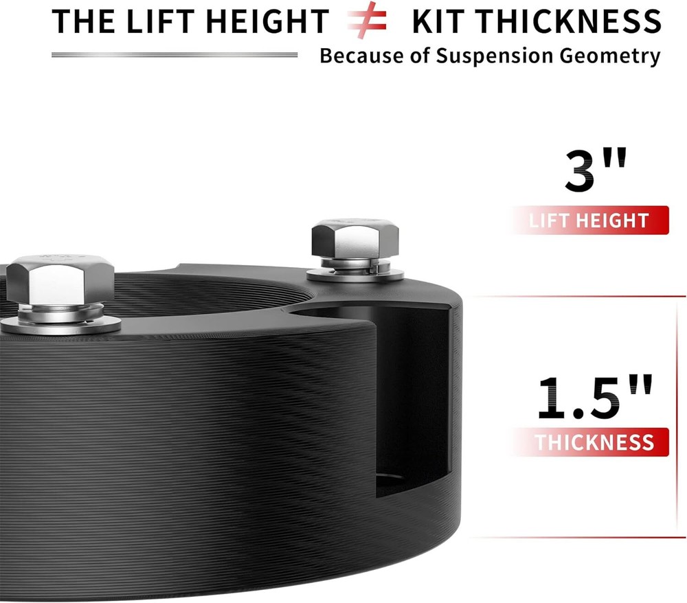 【Compatible】2005-2024 Tacoma 2WD 4WD (6 lugs only), 2003-2024 4Runner 2WD 4WD, 2007-2015 FJ Cruiser 2WD 4WD - Does not fit Tacoma 5-Lug Models, 2017 TRD Off-Road Model OR 2018+ TRD PRO Models. Does NOT Fit 4Runner Limited Models w/ X-REAS Hydraulic Struts OR 2018+ TRD PRO Models 【Benefits】(1)CNC automatic processing ensure high accuracy and stability(0.02mm), Provide accurate hole position for easy installation (2)6061-T6 aluminum forged alloymaterial sturdy and durable (3)High quality pre-installed heat treated 12.9 grade studs 【Function】The kit provides unparalleled ground clearance, Used to conquer off-road obstacles, And allow the installation of larger rims and tires. Make your truck look more aggressive 【Easy Install】Installation can be completed within 1-2 hours, No cutting and drilling required and does not require strut/coil disassembly like other kits 【Note】Improve the front of your truck by 3/2.5/2 inches, bringing a perfect change in the appearance, performance and style of your truck. Because of suspension geometry,the ratio between lift height and kit thickness is not 1:1 【Product Warranty】All products are covered by two years warranty to be free of defects in material and workmanship for two years from date purchased. If you have any questions or you are not satisfied with the product, welcome to contact us Compatible with: 2005-2024 Tacoma 2WD 4WD (6 lugs only) 2003-2024 4Runner 2WD 4WD 2007-2015 FJ Cruiser 2WD 4WD Does not fit Tacoma 5-Lug Models, 2017 TRD Off-Road Model OR 2018+ TRD PRO Models. Does NOT Fit 4Runner Limited Models w/ X-REAS Hydraulic Struts OR 2018+ TRD PRO Models. 3 inch Front Leveling Lift Kit Specifications: Quantity: Two (2) Real thickness: 1.5" Raise height: 3" Material: 6061-T6 Aerospace Grade Aluminum with 12.9 grade studs 2.5 inch Front Leveling Lift Kit Specifications: Quantity: Two (2) Real thickness: 1.25" Raise height: 2.5" Material: 6061-T6 Aerospace Grade Aluminum with 12.9 grade studs 2 inch Front Leveling Lift Kit Specifications: Quantity: Two (2) Real thickness: 1" Raise height: 2" Material: 6061-T6 Aerospace Grade Aluminum with 12.9 grade studs Package: 2 x Front Leveling Lift Kit 1 Set Nut.
