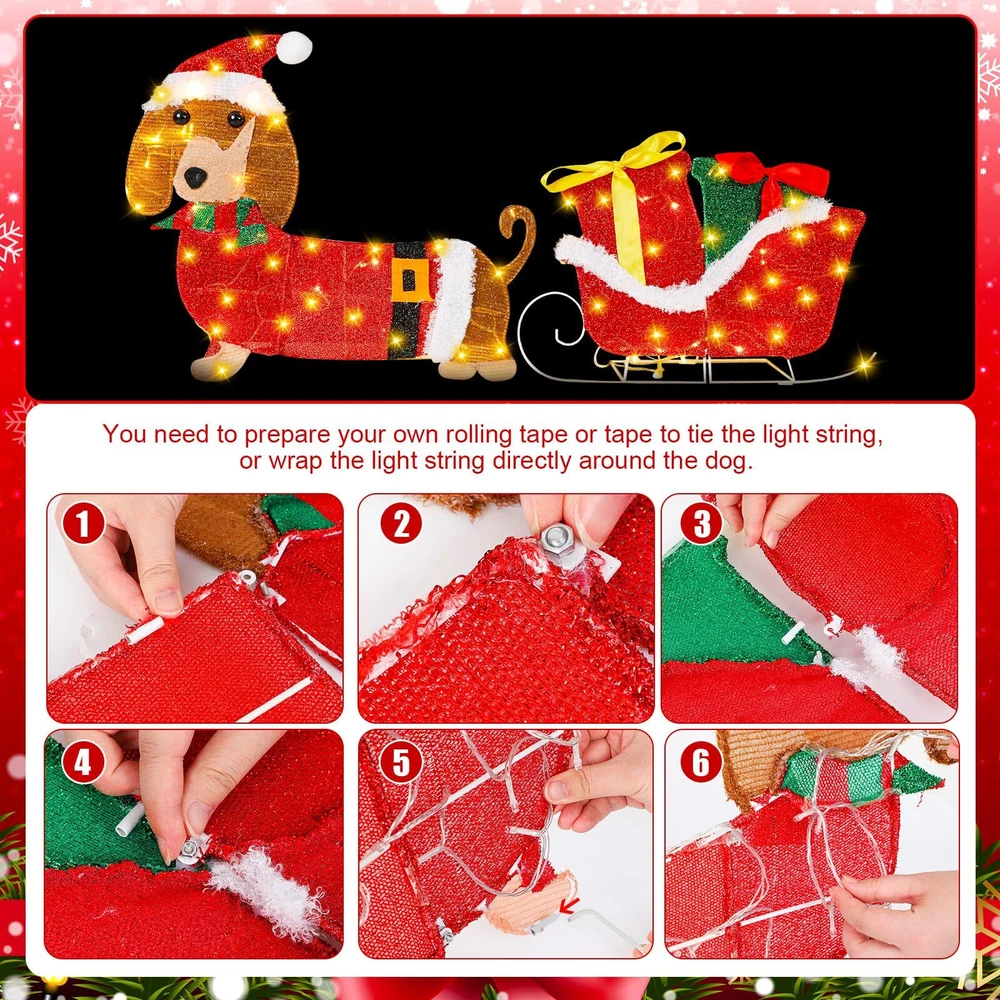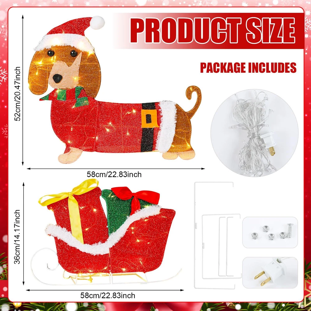 Features: Cute Christmas decorations: Christmas Dachshund decorations wearing green scarves, dragging sleds with gift boxes to welcome your guests, classic appearance effects and cute puppies add Christmas colors to your yard decoration, creating a joyful festive sense. Easy to install: The detachable design allows this outdoor Christmas decoration to be quickly installed in just three steps. But please be careful not to scratch the wire. Specifications: Material: metal Color: red, green, white Size: 23 inches (58 cm) Package includes: 1 x Lighted Christmas outdoor decoration set Notes: Manual measurement, please allow slight errors on size. The color may exist a slight difference due to different screen displays Lighted Christmas Outdoor Decoration Set: transform your holiday display with this lighted Christmas dog decoration set featuring a delightful 23 inches dachshund dog pulling a sleigh; This cheerful Christmas dachshund decoration adds a whimsical touch to your outdoor Christmas decor, welcoming guests with its festive charm. Note: The light string can be directly wrapped around the product, you can also prepare tape or adhesive tape to reinforce Ideal Size for Eye Catching Appeal: standing at an impressive 23 inches, this lighted Christmas dachshund sleigh decoration is designed to stand out in any yard or garden; The size makes it an ideal focal point for outdoor Christmas decorations, ensuring it captures attention and spreads holiday cheer to all who pass by Weather Resistant and Stability: constructed with sturdy metal brackets and lamp tube, this dog Christmas outdoor decoration is built to withstand winter weather; The durable materials ensure that your lighted Christmas yard decorations will remain vibrant and charming throughout the holiday season and beyond Glow Christmas Lawn Display: featuring glowing white lighting effects, this metal Christmas outdoor decoration brings warmth and joy to your festive displays; The illuminated Christmas yard decoration creates a magical sense, perfect for Christmas themed parties, winter holiday parties, nighttime festivities, family gatherings, indoor and outdoor decorations, or terrace decorations Multiple Scenes: classic appearance effects and cute puppy add Christmas colors to your yard decoration, creating a joyful festive sense; This dachshund Christmas outdoor decoration is perfect for a variety of outdoor settings, including yards, gardens, and porches; Ideal for holiday parties, family gatherings, or simply brightening up your neighborhood, this Christmas sleigh outdoor decoration adds a playful and festive touch to any outdoor space