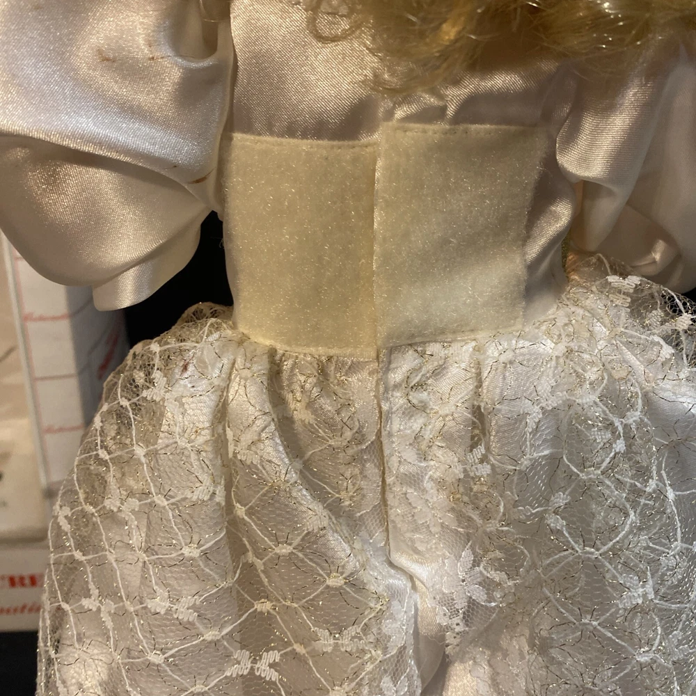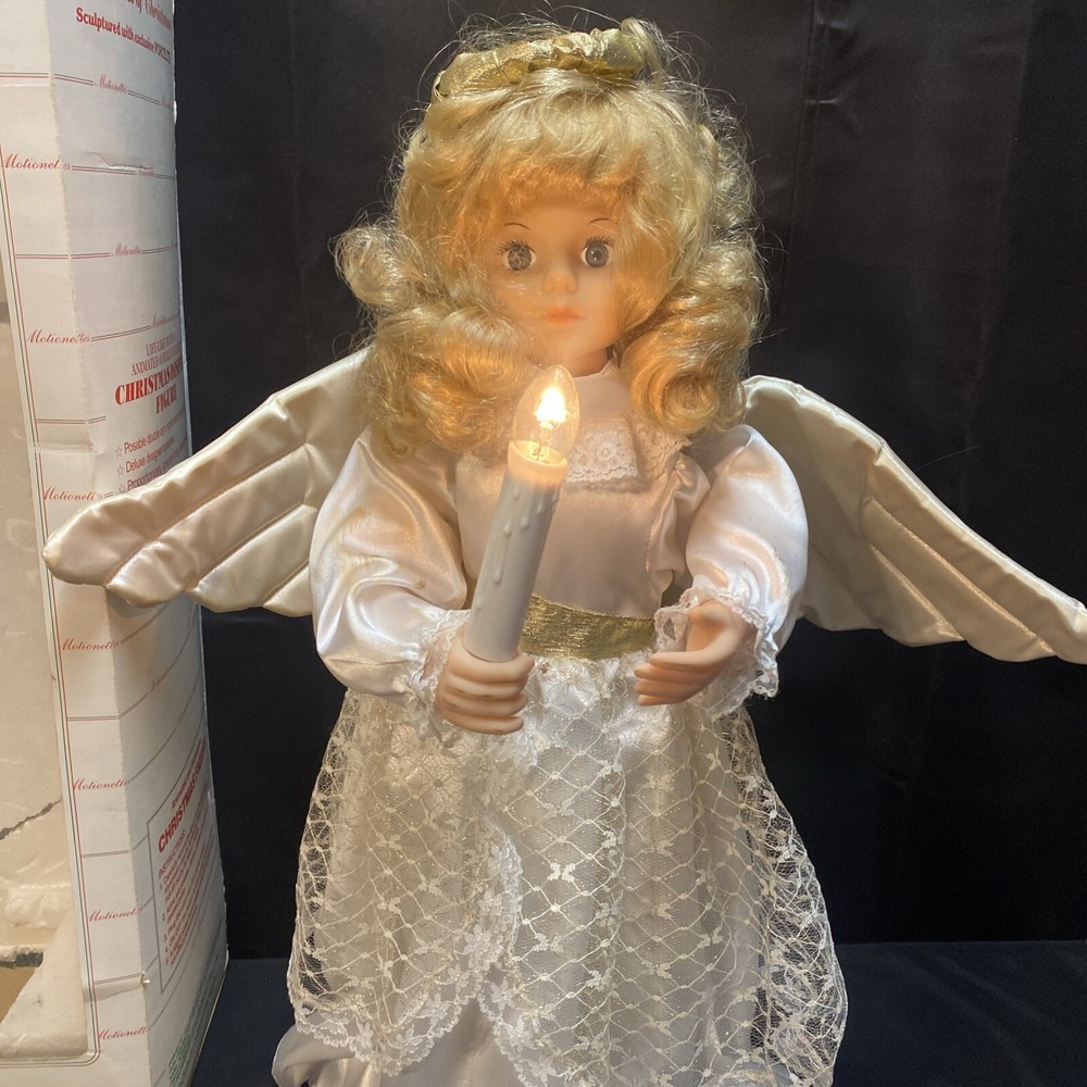This Animated Angel figurine is the perfect addition to your Christmas decor. Measuring 23 inches tall, it features a cute and cuddly design that will bring joy to both children and adults alike. The figurine is made by Telco and is part of their Motion-ettes collection, which is perfect for those who love animation. The Christmas Angel figurine is designed with intricate details and comes with original packaging, making it a great gift for collectors and fans of all ages. Its light and motion features add an extra touch of magic to your holiday display. Celebrate the season with this adorable Animated Angel figurine, perfect for bringing a touch of animation to your Christmas decor. Box is damaged worn. Angel has some staining on wings and some on arms and bottom of dress. Angel works great !