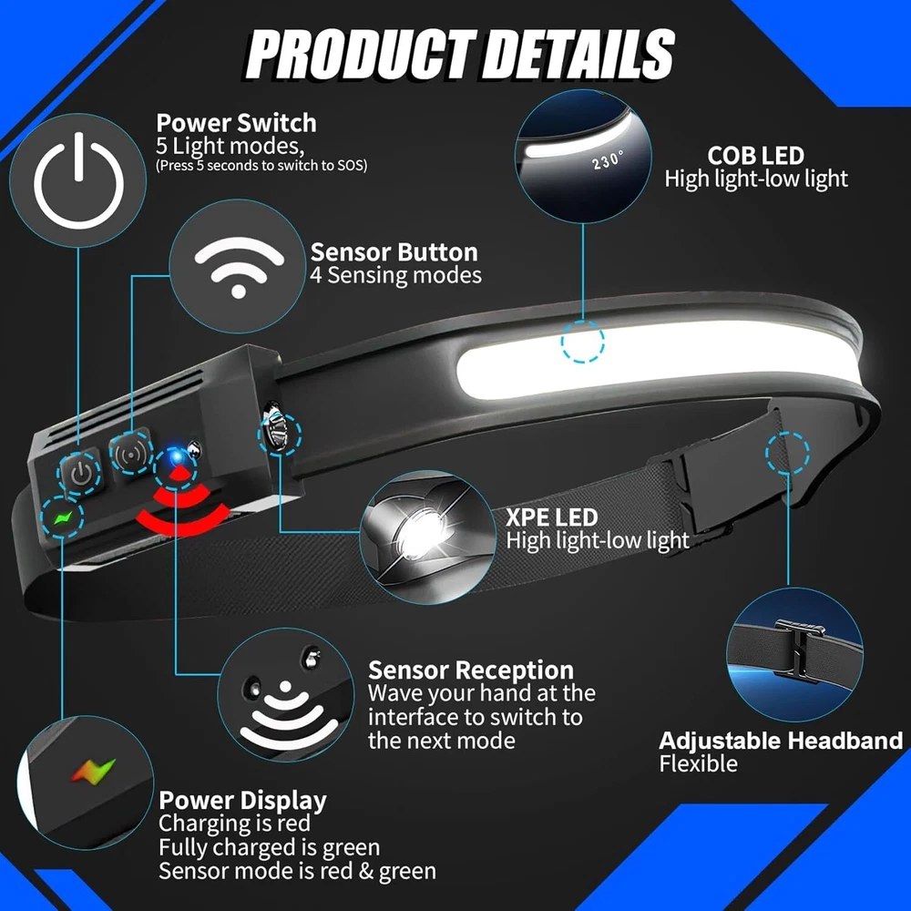 WARNING : California’s Proposition 65 Product Description 6PCS - 230° Wide Range LED Headlamp LED headlamp camping accessories is equipped with the latest intelligent sensors. Features a 230° wide beam and a super bright XPE light on the side, headlight can illuminate the viewing area without moving your head, and you can also use its spotlight to focus on specific areas. Previous page Next page 1 6 Light Modes 2 Product Details 3 USB Rechargeable 4 IPX4 Waterproof 230° Wide Beam & Long-Distance The new 230° wide beam headlight allows you to illuminate the viewing area without moving your head. It has a better area illumination, which can ensure your safety in the dark. Helmet light equipped with two micro-sensing devices, it is more convenient to use and frees your hands. Bright rechargeable headlamps flashlights light up our life! 230° Wide Illumination Lightweight & Comfortable gift for workers Rechargeable Headlamp Headlamp provides excellent 230° wide angle illumination and 1200 lumens. Lightweight Head Light Only 3.5 ounces, you will not feel tired even if you wear it for a long time. Head Lights for Forehead head lights for forehead suitable for almost all types of helmets. Best Headlamp headlamps for adults rechargeable are built to last. LED Headlight Small size design can be folded and removable to easily fit into your pocket. COB Strip Headlamp You can adjust the 4 clips for hardhat to make it perfectly fixed on the helmet. The Best Partner for Hard Hat Previous page Next page
