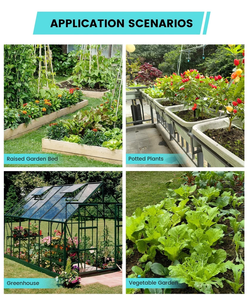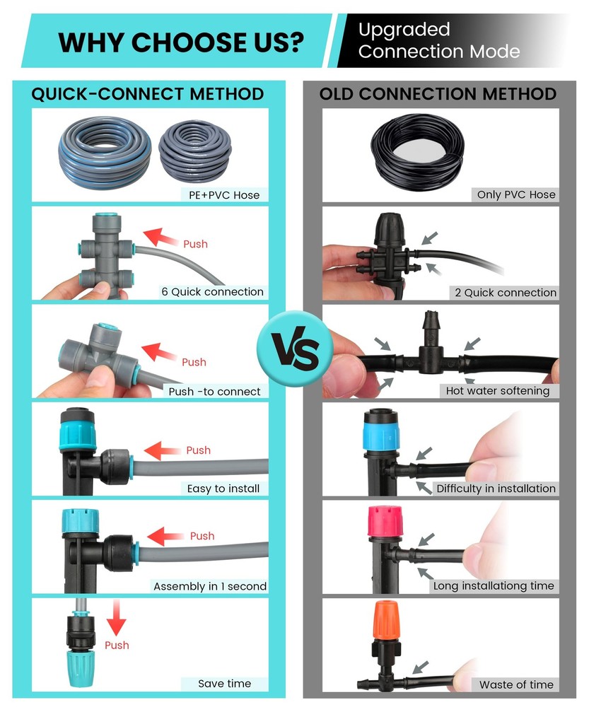 A kit to easily irrigate your garden: The drip irrigation system includes 33 feet of 1/2-inch PE and 197 feet of 1/4-inch PVC irrigation hoses. All interfaces are quick-connect interfaces, making it the most novel and simple irrigation system at present. Quick connection, easy installation: This plant drip irrigation kit is designed with a Y-type diverter main valve and fully quick-connect components, which can be easily installed in minutes. Assembly does not require complex tools or expertise. Multiple watering methods can be achieved: This garden watering system has three adjustable nozzles: Stream Emitter, Vortex Emitter, and Misting Nozzle. It provides precise watering for various plant types to meet diverse needs. Quick Connection Drip Irrigation System: All interfaces are quick-connect. The drip irrigation kit includes 33 feet of 1/2-inch PE and 197 feet of 1/4-inch PVC irrigation hose. Easy installation makes it the most novel and simple irrigation system available. Quick connection, easy installation: This plant drip irrigation kit is designed with a Y-type water distributor and fully quick-connect components, which can be easily installed in minutes. Assembly sprinkler system does not require complex tools or expertise. Multiple watering emitters can be achieved: This garden watering system has three adjustable nozzles: Stream Emitter, Vortex Emitter, and Misting Nozzle. It provides precise watering for various plant types to meet diverse needs. Durable and high-quality materials: This automatic irrigation system is made of sturdy PE and PVC hoses, which are weather-resistant and durable. The detachable emitters and safety connector can be disassembled and used repeatedly, ensuring smooth operation and easy maintenance. DIY multi-scene application: This garden watering system can be flexibly DIY assembled, making it very suitable for gardens, greenhouses, raised bed, flower bed, courtyards, allowing you to water multiple plants with different needs at the same time.