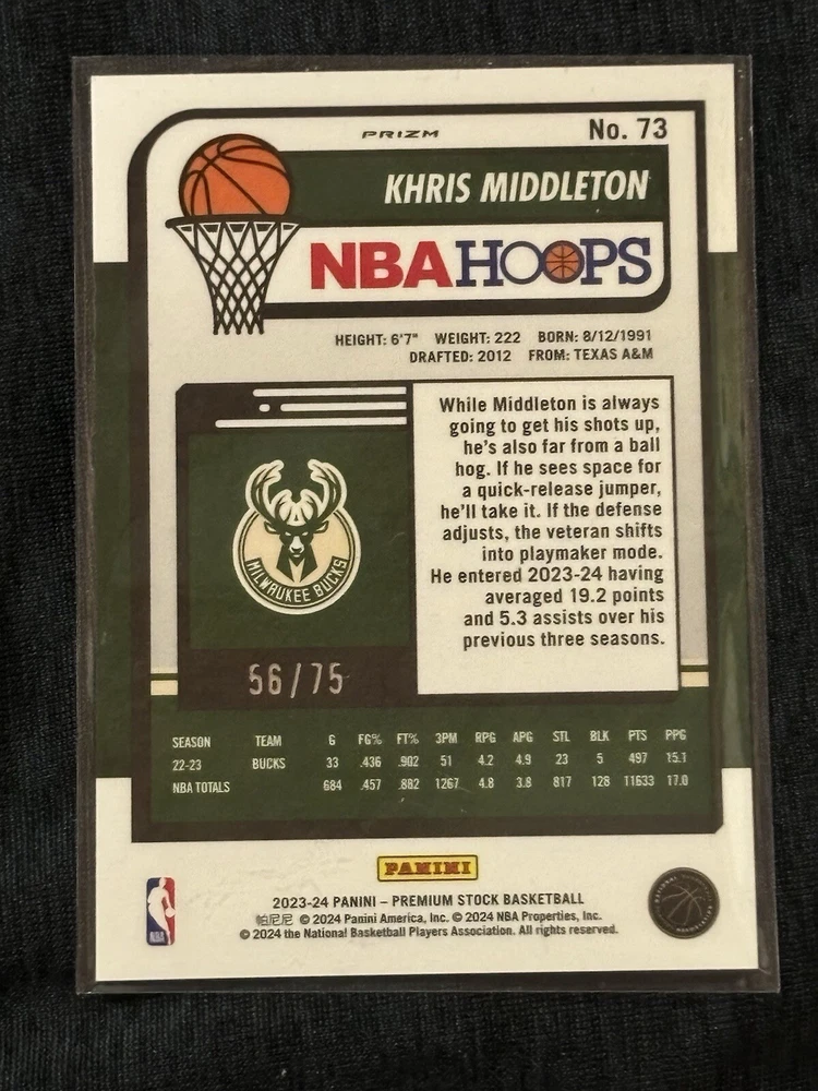 Elevate your basketball card collection with the 2023-24 NBA Hoops Premium Stock Khris Middleton Green Prizm card. This eye-catching variety features a short print run, making it a rare find for enthusiasts and fans of the Milwaukee Bucks star. The card, numbered 73, showcases Middleton in action, capturing the intensity and passion he brings to the court. This collectible is part of the 23-24 NBA Hoops set and is produced by renowned manufacturer Panini, ensuring a high-quality addition to your sports memorabilia. The Green Prizm parallel adds an extra layer of appeal, standing out with its vibrant color and premium finish. Whether you're a seasoned collector or just starting out, this card is a must-have for any NBA fan.