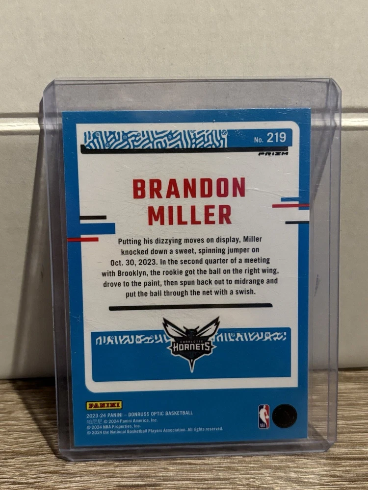 Sport: Basketball Season: 2023-24 Set: 2023-24 Panini Donruss Optic Features: Short Print, Rookie League: National Basketball Association (NBA) Card Number: 219 Type: Sports Trading Card Manufacturer: Panini Team: Charlotte Hornets Parallel/Variety: Optic Player/Athlete: Brandon Miller Autograph Authentication: Donruss