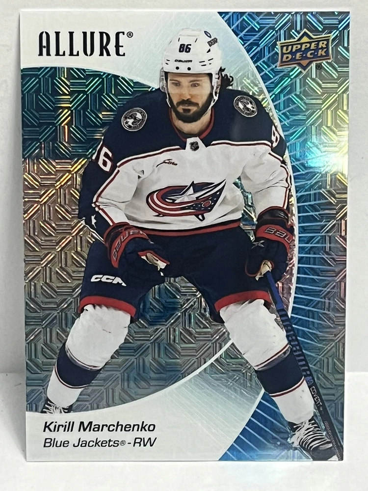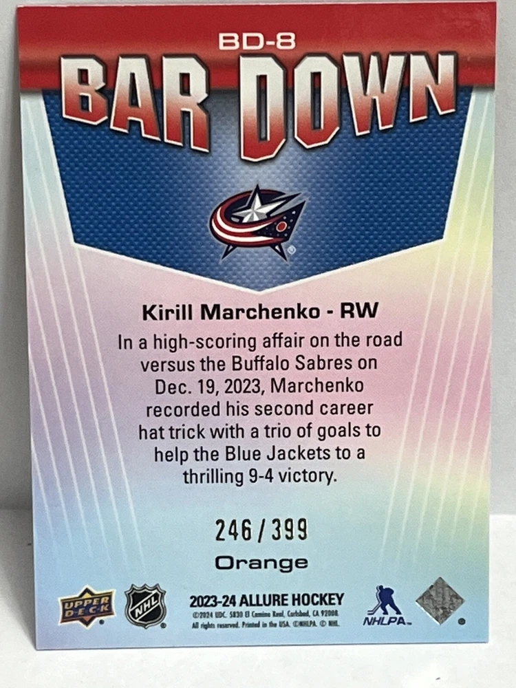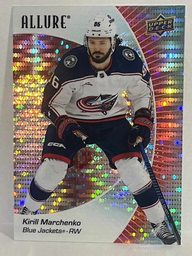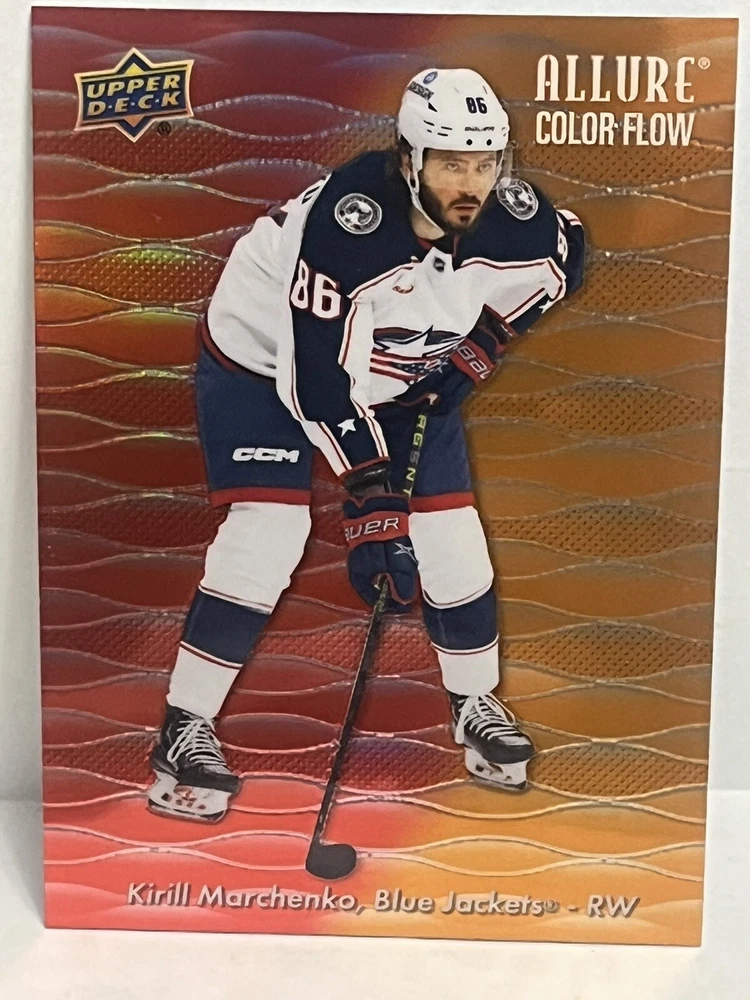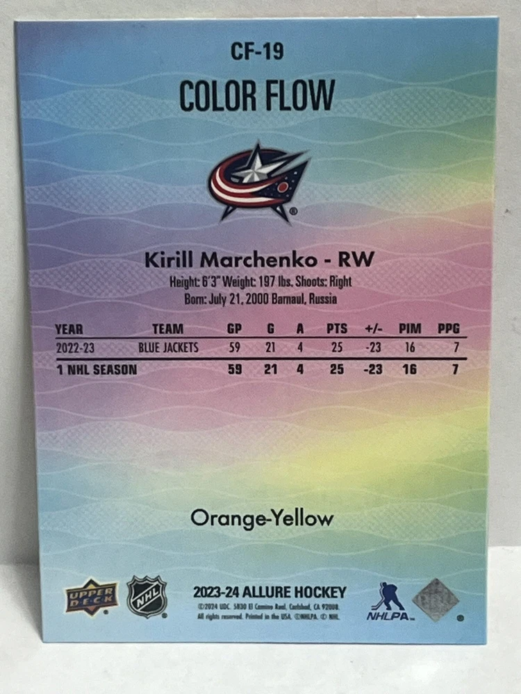 23/24-Allure Kirill Marchenko- Blue Line #27/35 & Orange Bar Down#246/399-Red Rainbow and 2 Color Flow Cards and Black Rainbow,4 Card Lot is a must-have for any Columbus Blue Jackets fan or hockey card collector. This rare set includes a limited print run of 35 cards featuring the talented player. The striking blue parallel and two-color flow cards add a unique touch to this Upper Deck Allure collection, making it a standout addition to any sports trading card collection. Selling 6 cards as is. Seller takes no responsibility for lost or damaged cards on route to buyers destination and any delays in shipping.