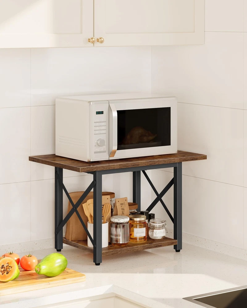 Printer Stand with Wheels/Adjustable Feet The printer stand features premium particleboard with a sturdy metal frame and X -crosses for durability. It has 4 casters and 4 adjustable feet, offering two installation options for flexibility. The larger top meets diverse placement needs, and its rustic brown or solid black finish adds elegance. It's functional and stylish, suitable for home and office use, creating an efficient and comfortable workspace. Spacious Panels for Easy Storage: The wide top, sized 23.6"L x 15"W, easily fits most home printers. The lower shelf offers space for small printers or paper storage. The tiered design maximizes space and versatility for diverse office needs 2 Options for Flexible Use: The printer stand is equipped with 4 casters and 4 adjustable feet for flexible use. The casters, two of which have brakes, allow for easy mobility, while the adjustable feet ensure stable desk placement Versatile Use: The printer table is ideal for storing office supplies like scanners, copiers, and printers. It also doubles as a storage shelf for books, plants, and more, fitting seamlessly into kitchens, living rooms, offices, and other spaces Premium Build for Durability: The printer stand features quality particleboard and a metal frame for durability. The side X-crosses offer excellent stability and support. The top shelf can bear 88 lb Effortless Assembly: With a straightforward structure, clearly numbered parts, easy-to-follow instructions and all necessary tools, you can quickly assemble the print stand and put it into use in no time