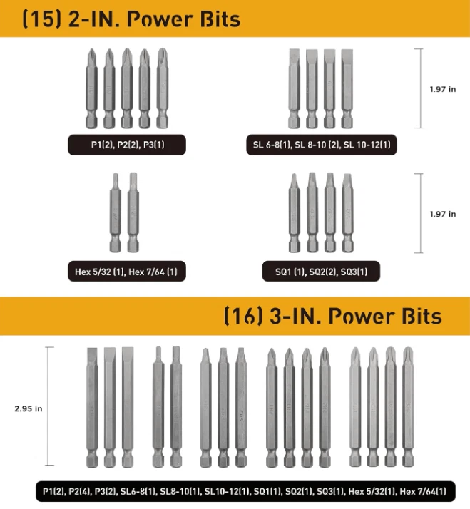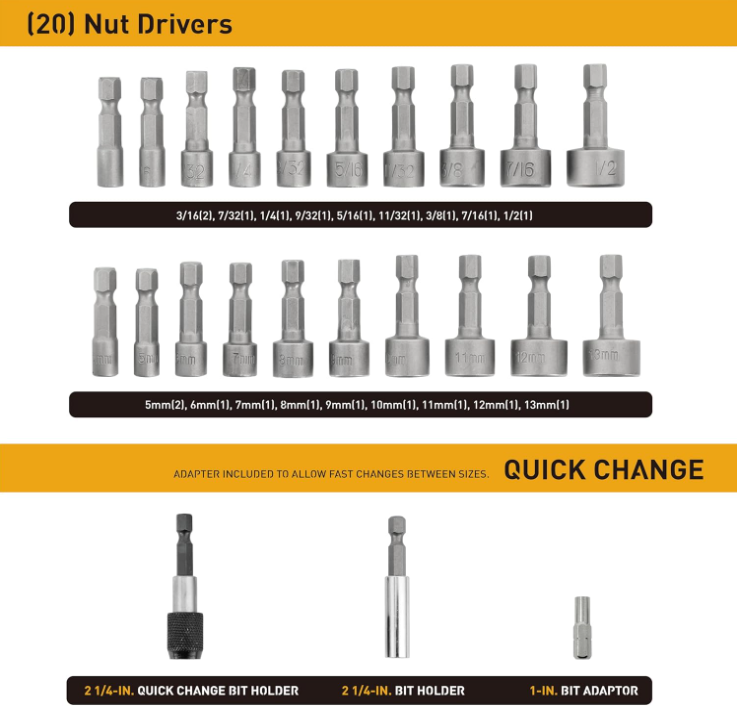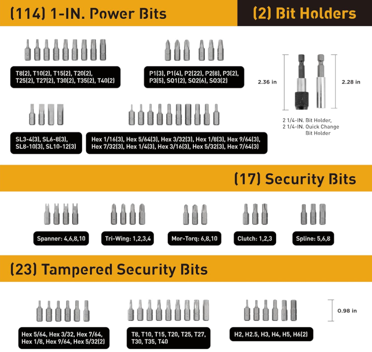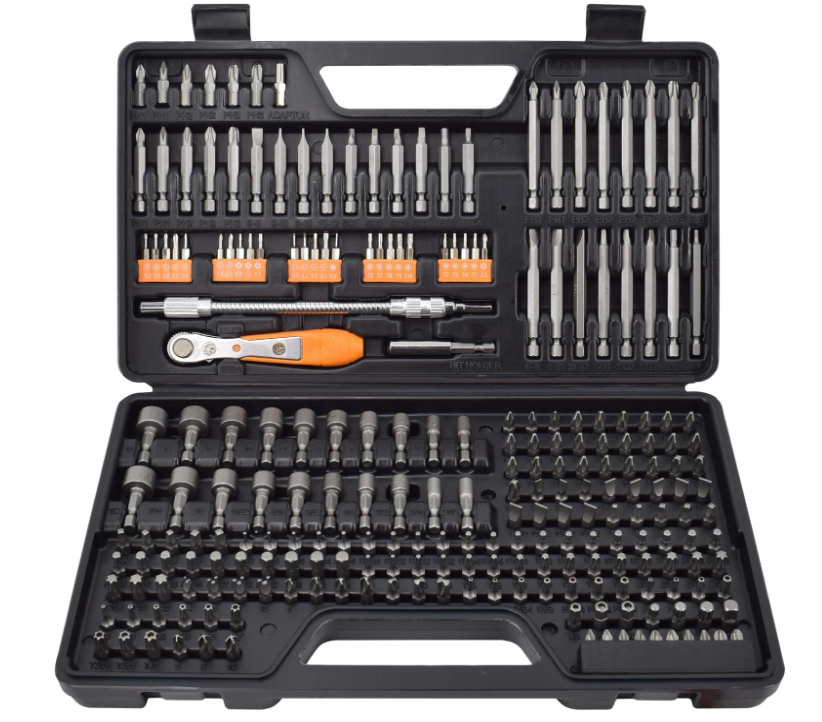 236 Piece Ultimate Screwdriver Bit Set, High Grade Carbon Steel, Includes Hard-to-Find Security Bits & Micro Bits About The Item: The Ultimate Set: 236 pieces including Nut Drivers, Security Bits, Torx, Slotted, Phillips, Square, Pozi, Hex, Socket, microbits, and other specialty bits in commonly used sizes. Also includes Magnetic Bit Holder, Quick-Change Adapter for fast and easy switching between sizes, a ratchet wrench, and a flexible shaft bit holder for working in hand to reach spaces! Exceptional Quality: Bits are made of high-grade carbon steel (50BV30 & 6150 Grade) and sand-blasted for optimum strength and longevity. Built For Work: Comes in a sturdy, hard-shell case with labeled slots to keep bits organized. Includes multiples of the most common sizes so you can keep working. Practical and Versatile: Use with your drill or impact driver - perfect for DIY projects, with professional results. Use for household maintenance and repair, and so much more. Including hard-to-find sizes and driver configurations, this bit set contains every tool necessary to tighten and loosen every fastener in and around the home.