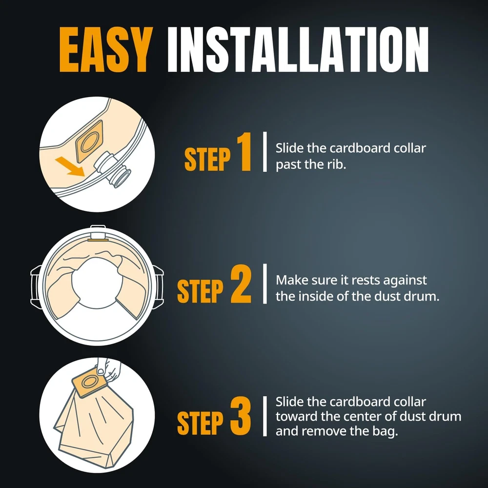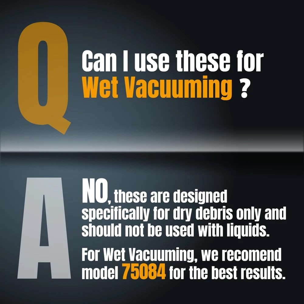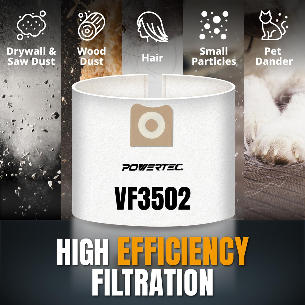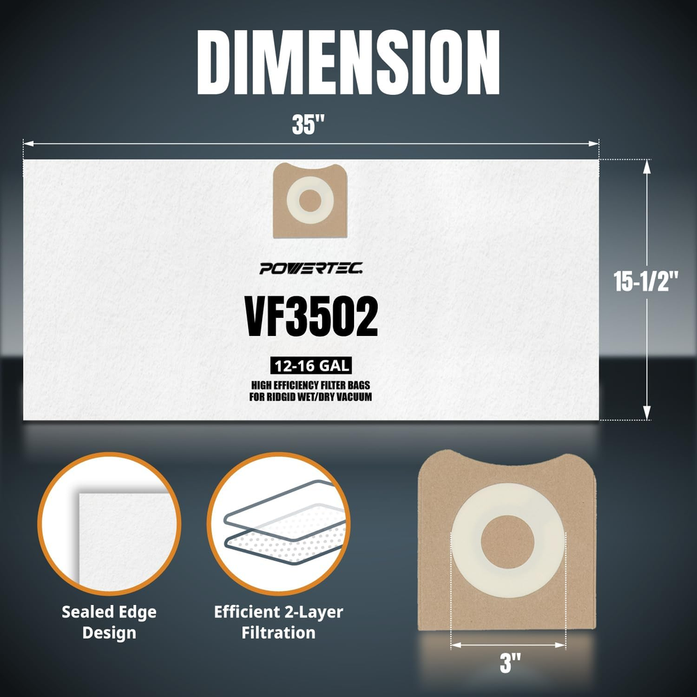 Store New Arrivals Add to Favorite View Feedback 23743 VF3502 Size a Shop Vacuum Bags for Ridgid 4 Pack, 12-16 Gal. Vacuum Bags for Ridgid HD1200, HD1400 Wet Dry Vac (75002P2) Description Item model number 75002P2 Part Number 75002P2 Style 4 Pack Size VF3502 (Size A) Capacity 16 Gallons Number of Items 4 Item Package Quantity 1 Product Dimensions 16.1 x 1.6 x 9 inches Material Paper Batteries Required? No Compatible Devices function(f) {var _np=(window.P._namespace("DetailPageProductOverviewTemplatesJava"));if(_np.guardFatal){_np.guardFatal(f)(_np);}else{f(_np);}}(function(P) { P.when('A').execute(function(A){ A.on('a:truncate:po-attribute-truncate-0:updated', function(data) { var isTruncated = !data.truncateInstance.getIfTextFits(); var seeMoreElement = document.getElementById('po-attribute-see-more-id-0'); if(seeMoreElement) { seeMoreElement.style.display = isTruncated ? '' : 'none'; } }) }); })); 12 Gallon Vacuums: HD1200 | HD1280 | MOB1200 | MOB12000 | 50333 (1250RV) | 62703 (RT1200) | 929866 (WD1270) | WD12450 // 14 Gallon Vacuums: HD1400 | HD1401 | 50368 (RV2400HF) | 50348 (1400RV) | WD1450 // 16 Gallon Vacuums: WD1640 | HD1800 | HD1600 | HD16000 | HD1640 | HD16400 | WD1956 | 50363 (RV2600B) | MOB1600 | MOB16000 | 29803 (WD1850M) | 50338 (1650RV) | 62723 (RT1600) | HD16100 | WD1680 | WD1850 | WD1851 | WD1950 See more Item Weight 15.5 ounces Batteries Included? No Special Features 2-Ply, Durable Number Of Pieces 4 Included Components High Efficiency Replacement Filter Bag 【INCLUDES/SPECS】: 4 Ridgid Vac Bags 12-16 gallon replacement filters; 2-ply Material, 35” (890 mm) Long x 15-3/4” (400 mm) High, 3” (76.5 mm) Fitting Diameter. 【COMPATIBILITY FOR RIDGID】: 12 Gallon Vacuums: HD1200 | HD1280 | MOB1200 | MOB12000 | 50333 (1250RV) | 62703 (RT1200) | 929866 (WD1270) | WD12450 // 14 Gallon Vacuums: HD1400 | HD1401 | 50368 (RV2400HF) | 50348 (1400RV) | WD1450 // 16 Gallon Vacuums: WD1640 | HD1800 | HD1600 | HD16000 | HD1640 | HD16400 | WD1956 | 50363 (RV2600B) | MOB1600 | MOB16000 | 29803 (WD1850M) | 50338 (1650RV) | 62723 (RT1600) | HD16100 | WD1680 | WD1850 | WD1851 | WD1950 【PREMIUM QUALITY】: Made with a high efficiency, 2-ply material designed for optimized durability, while able to capture fine dust particles for larger wet/ dry vacuums 【EASY DISPOSAL】: These disposable bags allow you to easily discard and replace your existing Ridgid vacuum filter bags with a 100% hassle-free option – eliminating build up or a messy tank that may cost you in the long term 【PERFORMANCE】: These bags work exceptionally well for capturing debris such as drywall dust, sawdust, dirt, and other non-hazardous materials - making them ideal for most homes, garages, and worksites Introducing the Replacement wet and dry vac filter bags intended for RIDGID vacuum by POWERTEC. These high efficiency vacuum filters present a premium and reliable alternative intended for Ridgid wet/ dry vacuum cleaners. Perfectly suited to collect an assortment of dry debris, these dust collecting bags are heavy duty and work flawlessly in accommodating 12-16 gallon models. They feature a unique design that eliminates clogging or blockage, preventing your vacuum from overfilling. They are easy to install and replace. Simply toss and discard for a quick and easy clean-up. In the garage, at a worksite or on the go – you’ll find these perfect for capturing all types of fine dust particles such as drywall dust, sawdust or cement dust. Replacement for RIDGID VF3502 (23743) Compatible With RIDGID 12 - 16 Gallon Wet /Dry Vacuum models : 12 Gallon Vacuums : HD1200 | HD1280 | MOB1200 | MOB12000 | 50333 (1250RV) | 62703 (RT1200) | 929866 (WD1270) | WD12450 14 Gallon Vacuums : HD1400 | HD1401 | 50368 (RV2400HF) | 50348 (1400RV) | WD1450 16 Gallon Vacuums : WD1640 | HD1800 | HD1600 | HD16000 | HD1640 | HD16400 | WD1956 | 50363 (RV2600B) | MOB1600 | MOB16000 | 29803 (WD1850M) | 50338 (1650RV) | 62723 (RT1600) | HD16100 | WD1680 | WD1850 | WD1851 | WD1950 POWERTEC is a leading manufacturer of high quality wood work accessories, sanding discs and an assortment of OEM replacement parts. We are committed to exceeding expectations, while bringing the latest innovations, technology, and product development to the industry. ABOUT US We offer the best prices around on high quality products. Our E-store includes media such as books, movies, music and games while offering electronics, toys, sporting apparel, clothing, tools, general home, garden items and more. SHIPPING We are always working hard to ensure your package arrives as soon as possible. Please understand that some factors like weather, high postal traffic, and the performance of shipping companies are outside of our control. We offer free shipping to the lower 48 states and ship within 2 business days of payment, usually sooner. We do not accept P.O. Boxes. Please provide a physical address. RETURNS We offer a 30-Day Return Policy on items which you are not completely satisfied with. You have the option for a full-refund or an exchange of the item. No returns are available on items shipped outside of the USA. PAYMENT We accept PayPal. CONTACT US This page content is yet to come Please ad us to your favorite seller and visit again later Thank You