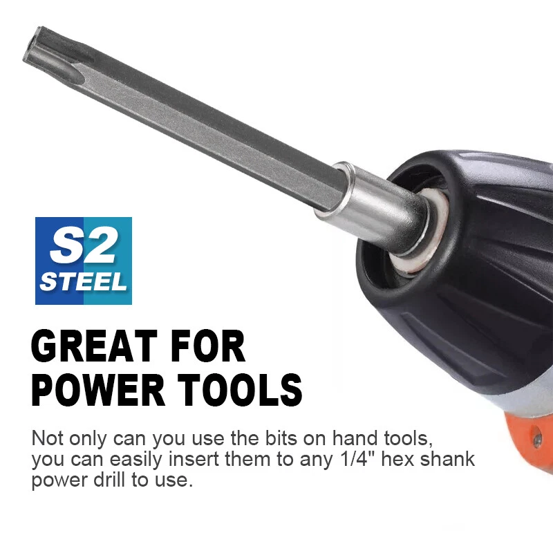 Product Characteristics High Q uality I ndustrial G rade M aterials: The Torx screwdriver bit set is made of high-quality S2 alloy steel with a special heat treatment process to increase the torque and full hardness of the bit, and it has good wear resistance and is more durable than regular Torx screwdriver bits. High P recision M achining T echnology: The product adopts CNC precision machining technology to ensure the accuracy of the product, so that the drill can withstand the instantaneous impact of large torque pneumatic tools, which greatly improves the service life of the product itself. Magnetic: The magnetic Torx screwdriver drill set can quickly and easily adsorb screws, greatly improving your work efficiency. Repeated use does not diminish the magnetic force. Suitable F or A V ariety O f P ower T ools: The 1/4" hexagon handle allows it to accommodate a wide range of power tools, allowing you to quickly change chucks. Suitable for electric drill, air drill, electric screwdriver, manual screwdriver and so on. A W ide R ange O f U se S cenarios: It can be widely used in automobile, home, industrial and other maintenance, and can also be used in other screw drives. Mechanical P rinciple D esign: Strong torque, high torque, after contact with the screw head, the impact reaction force generated by the impact screwdriver is absorbed by the torque part, effectively preventing the damage of the tool head. Straight and concentric, tight bite. Product Specification Status: 100% Brand New Material: S2 A lloy S teel Shank T ype: 6.35mm/ 1/4" H ex S hank 12PCS: Length: 1.97"/50mm Cutter H ead S pecifications: T5, T6, T7, T8, T9, T10, T15, T20, T25, T27, T30, T40 11PCS: Length: 3.94"/100mm Cutter H ead S pecifications: T6, T7, T8, T9, T10, T15, T20, T25, T27, T30, T40 Package Included 12PCS × 50mm Torx Screwdriver B it 11PCS × 100mm Torx Screwdriver B it Attention P lease 1. Please allow manual measurement error of 1-3mm. Make sure you don't mind before you buy. 2. Due to lighting effects, brightness contrast Settings of the display, etc., there may be some slight differences in the hue of the picture and the actual item, please make sure you don't mind.