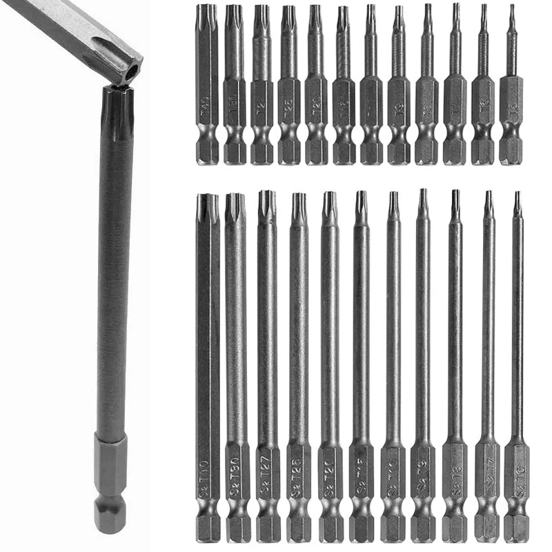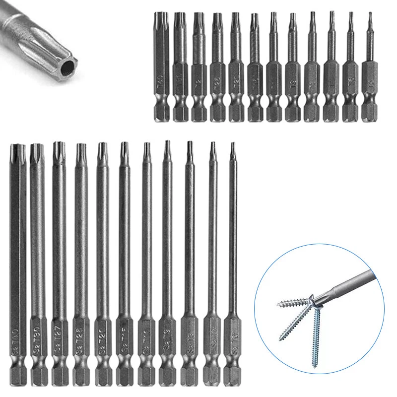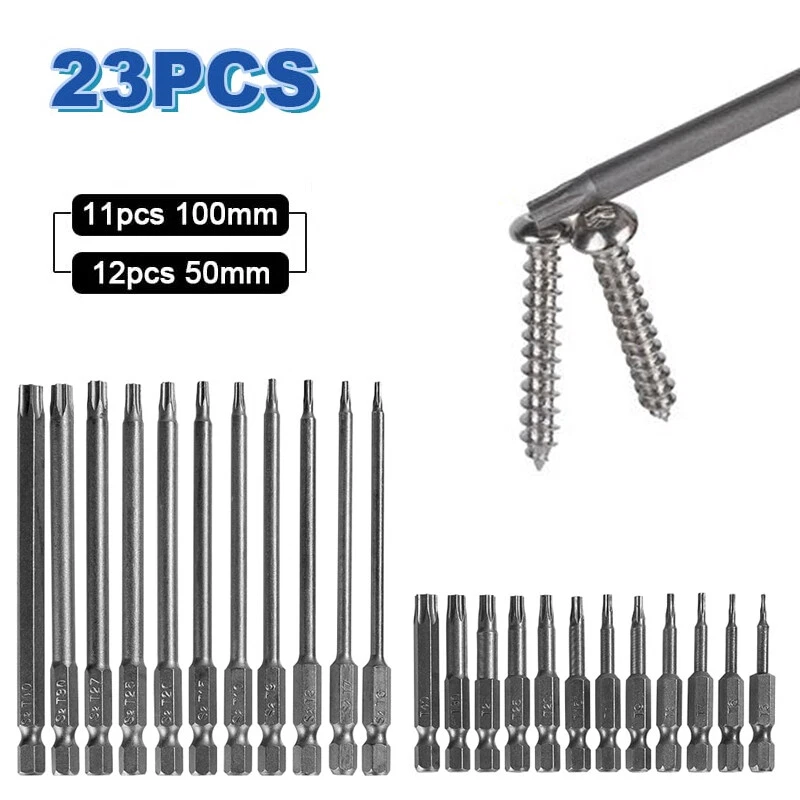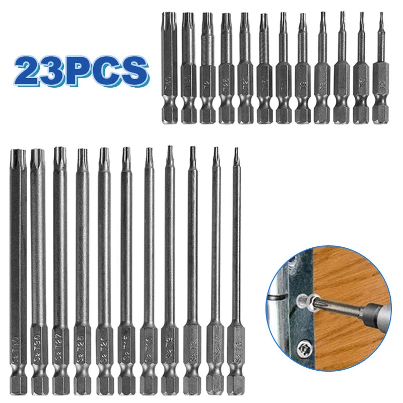 Product D escription 23PCS Torx S crewdriver Drill S et 1/4" H ex S hank 50mm 100mm Product Characteristics High Q uality I ndustrial G rade M aterials: The Torx screwdriver bit set is made of high-quality S2 alloy steel with a special heat treatment process to increase the torque and full hardness of the bit, and it has good wear resistance and is more durable than regular Torx screwdriver bits. High P recision M achining T echnology: The product adopts CNC precision machining technology to ensure the accuracy of the product, so that the drill can withstand the instantaneous impact of large torque pneumatic tools, which greatly improves the service life of the product itself. Magnetic: The magnetic Torx screwdriver drill set can quickly and easily adsorb screws, greatly improving your work efficiency. Repeated use does not diminish the magnetic force. Suitable F or A V ariety O f P ower T ools: The 1/4" hexagon handle allows it to accommodate a wide range of power tools, allowing you to quickly change chucks. Suitable for electric drill, air drill, electric screwdriver, manual screwdriver and so on. A W ide R ange O f U se S cenarios: It can be widely used in automobile, home, industrial and other maintenance, and can also be used in other screw drives. Mechanical P rinciple D esign: Strong torque, high torque, after contact with the screw head, the impact reaction force generated by the impact screwdriver is absorbed by the torque part, effectively preventing the damage of the tool head. Straight and concentric, tight bite. Product Specification Status: 100% Brand New Material: S2 A lloy S teel Shank T ype: 6.35mm/ 1/4" H ex S hank 12PCS: Length: 1.97"/50mm Cutter H ead S pecifications: T5, T6, T7, T8, T9, T10, T15, T20, T25, T27, T30, T40 11PCS: Length: 3.94"/100mm Cutter H ead S pecifications: T6, T7, T8, T9, T10, T15, T20, T25, T27, T30, T40 Package Included 12PCS × 50mm Torx Screwdriver B it 11PCS × 100mm Torx Screwdriver B it Attention P lease 1. Please allow manual measurement error of 1-3mm. Make sure you don't mind before you buy. 2. Due to lighting effects, brightness contrast Settings of the display, etc., there may be some slight differences in the hue of the picture and the actual item, please make sure you don't mind.