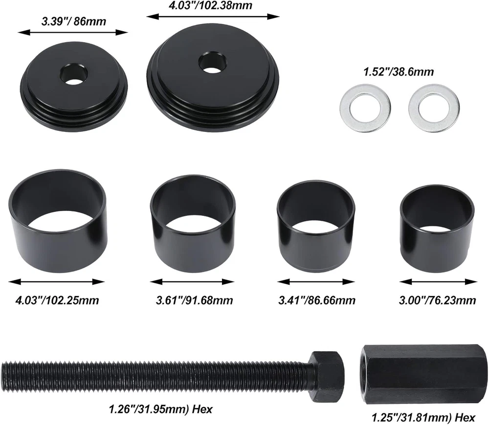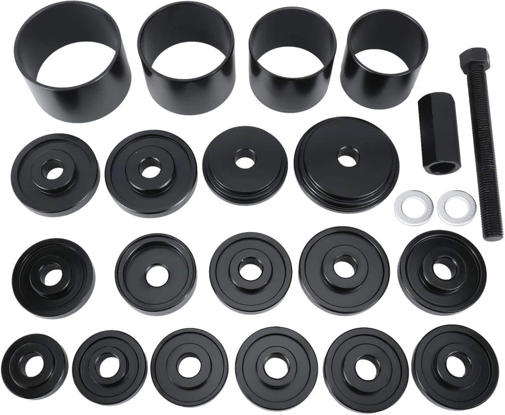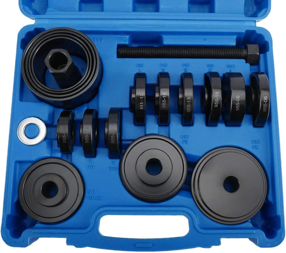 Store New Arrivals Add to Favorite View Feedback Contact 23Pcs FWD Front Wheel Drive Bearing Adapters Puller Press Installer Removal Tool Kit Description Country of Origin China Manufacturer Part Number KC-0131 Item Weight 21.8 pounds Product Dimensions 5.91 x 3.94 x 4.72 inches Wheel bearing press kit is for fast & effective front-wheel drive bearing removal and installation. Easily replaces wheel bearings while keeping the steering knuckle and strut assembled on the vehicle. Wheel bearing removal tool is designed to work with the steering knuckle and strut assembly still on the vehicle, eliminating the need for front end alignment after service while reducing damage to the hub and bearings. This set includes 12 bushing adapters, 4 sleeves with sleeve plates, a wheel hub installer and more. Different sizes and specifications meet your diversified needs Heavy-duty carbon steel construction with black anodic oxidation coating for ultimate rust-resistant performance Bearing press kit works for most front-wheel-drive American domestic and imported cars and small pickup trucks. Product Description FWD Front Wheel Drive Bearing Adapter Press Installer Removal Tool Easily replaces wheel bearings while keeping the steering knuckle and strut assembled on the vehicle. For servicing all the most common sizes, this set makes removing and installing bearings, bushes, and seals a breeze This nearly universal bearing kit is compatible with almost all front-wheel-drive cars and light trucks both import and domestic Sleeve [A-D]: A - 4.03"(102.25mm) O.D. x 2.55"(64.65mm) Length B - 3.61"(91.68mm) O.D. x 2.55"(64.65mm) Length C - 3.41"(86.66mm) O.D. x 2.55"(64.65mm) Length D - 3.00"(76.23mm) O.D. x 2.55"(64.65mm) Length Washer [E]: E - 1.52"(38.6mm) O.D. & 0.91"(23mm) I.D. Bushing [F-Q]: F - 2.16"(54.92mm) O.D. x 0.55"(14.01mm) Thickness G - 2.32"(58.93mm) O.D. x 0.55"(14.01mm) Thickness H - 2.48"(62.95mm) O.D. x 0.55"(14.01mm) Thickness I - 2.62"(66.49mm) O.D. x 0.55"(14.01mm) Thickness J - 2.75"(69.75mm) O.D. x 0.55"(14.01mm) Thickness K - 2.81"(71.41mm) O.D. x 0.55"(14.01mm) Thickness L - 2.89"(73.46mm) O.D. x 0.55"(14.01mm) Thickness M - 2.95"(75.00mm) O.D. x 0.55"(14.01mm) Thickness N - 3.05"(77.55mm) O.D. x 0.55"(14.01mm) Thickness O - 3.21"(81.46mm) O.D. x 0.55"(14.01mm) Thickness P - 3.28"(83.25mm) O.D. x 0.55"(14.01mm) Thickness Q - 3.48"(88.34mm) O.D. x 0.55"(14.01mm) Thickness Wheel Hub Installer [R]: R - 2.87"(72.93mm) O.D. x 0.79"(20.02mm) Thickness Sleeve Plate [S-T]: S - 4.03"(102.38mm) O.D. x 0.71"(18.03mm) Thickness T - 3.39"(86mm) O.D. x 0.71"(18.03mm) Thickness Sliding Forcing Screw [U]: U - 1.26"(31.95mm) Hex x 8.27"(210mm) Length Sliding Forcing Nut [V]: V - 1.25"(31.81mm) Hex x 2.36"(60mm) & 0.78"(19.75mm) I.D. ABOUT US We offer the best prices around on high quality products. Our E-store includes media such as books, movies, music and games while offering electronics, toys, sporting apparel, clothing, tools, general home, garden items and more. SHIPPING We are always working hard to ensure your package arrives as soon as possible. Please understand that some factors like weather, high postal traffic, and the performance of shipping companies are outside of our control. We offer free shipping to the lower 48 states and ship within 2 business days of payment, usually sooner. We do not accept P.O. Boxes. Please provide a physical address. For shipping outside of the continental USA, we only use eBay's Global Shipping Program.The item is shipped to KY and then sent to the rest of the world. International customers are responsible for all duties and taxes. Continue to check out in order to calculate costs for shipping the item to your country. Messages regarding eBay's Global Shipping Program MUST be directed at eBay EXCLUSIVELY. RETURNS We offer a 30-Day Return Policy on items which you are not completely satisfied with. You have the option for a full-refund or an exchange of the item. No returns are available on items shipped outside of the USA. PAYMENT We accept PayPal. CONTACT US This page content is yet to come Please ad us to your favorite seller and visit again later Thank You CUSTOMER SATISFACTION We try our very best to make sure every customer is completely satisfied. If there's a problem, message us! We're happy to help. WE ACCEPT Copyright © 2021 AutoDS. | All Rights Reserved