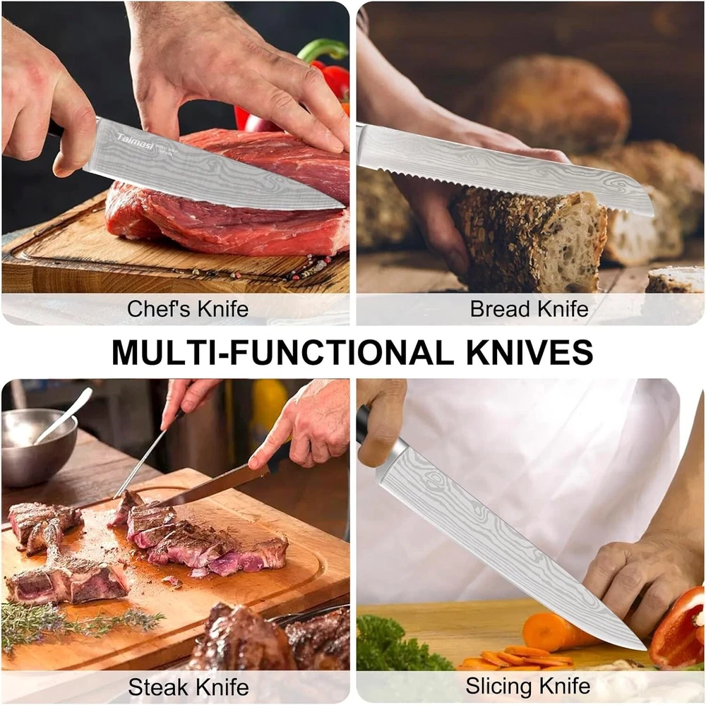 About this item [Multi-Purpose Kitchen Knife set]: Experience the ultimate in culinary precision with TAIMASI kitchen knife set. This comprehensive kit includes a chef's knife, santoku knife, bread knife, slicing knife, utility knife, paring knife, boning knife, 8 steak knives, sharpener rod, kitchen shears, finger guard, and other essential accessories. This knife set with block can be used for your daily kitchen tasks and fit all your needs. [Crafted for Endurance]: Each blade in our knife set is meticulously crafted from high-carbon X50CR15 stainless steel. This exceptional material ensures outstanding resistance to rust, corrosion, and staining. The textured handles are not only ergonomic but also incredibly sturdy, making every cooking session comfortable and fatigue-free for your fingers, hands, wrists, and forearms. [Ultra-Sharp and Unique pattern]: With carefully hand-polishing and precise tempering technology, each taper-ground edge is hand polished to 14-16°per side for long-lasting sharpness and easy honing. The blade features with unique damascus pattern, which make it has a attractive appearance. [Effortless Care and Storage]: Keeping your kitchen chef knives in pristine condition is a breeze. The entire set is beautifully organized in a natural oak wood block. This not only enhances the longevity of your blades but also adds a touch of sophistication to your countertop. It's a stylish and functional addition to your kitchen. [24/7 Customer Support]: We stand behind the quality of our products, which is why each item is thoroughly tested before it reaches your kitchen. If, for any reason, our knife set doesn't meet your expectations, don't hesitate to reach out to us. Our dedicated 24-hour customer service is here to ensure your shopping experience is nothing short of exceptional. Shipping We offer FREE shipping on all orders! We ship within Three business days of payment, usually sooner. We use a selection of shipping services such as UPS, FedEx, USPS etc. We only ship to the lower 48 states, no APO/FPO addresses or PO Boxes allowed. Local pickups and combined shipping options are not provided at this time. Return You can return a product for up to 30 days from the date you purchased it. Any product you return must be in the same condition you received it and in the original packaging. Please keep the receipt. Payment We accept payment by any of the following methods: PayPal Please pay as soon as possible after winning an auction, as that will allow us to post your item to you sooner! Feedback Customer satisfaction is very important to us. If you have any problem with your order, please contact us and we will do our best to make you satisfied. Contact Us If you have any queries, please contact us via ebay. We usually respond within 24 hours on weekdays. Please visit our eBay store to check out other items for sale! Thank you for shopping at our store. Disclaimer We are working with different suppliers in USA to deliver the item to your doorstep. If you have any issues regarding the item, Feel free to ask.