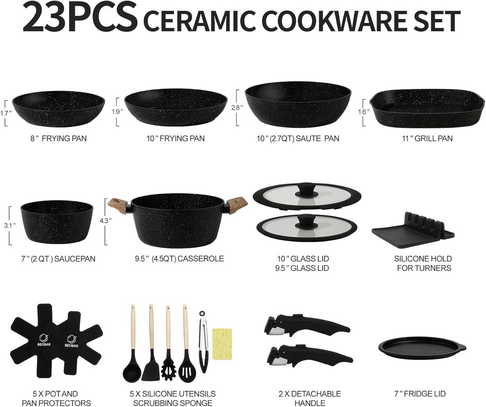 23pcs Ceramic Pots and Pans Set, Nonstick Detachable Handle Cookware, Induction Kitchen Cooking Set with Removable Handle,include Frying Pans & Saucepans Oven Safe (Black) Item Description About this item 1. High-Performance Nonstick Coating: Non-stick performance, PFOS/PFOA free, our cookware ensures your daily cooking is always safer and healthier. 2. Secure Removable Handle: Support up to 22 pounds, the handle is heavy duty tested, fit for removable handle set pots and pans, no need to worry about wobbly handles. 3. Easy Cleaning & Wide Compatibility: Just a cloth and rinse it with water, less water wasted.recommend hand wash,it is really easy to clean. with extended bottom design. Our nonstick cookware can work on all cooktops, including induction. 4. Stackable and Compact: Save up to 75% more space with stackable pots and pans set and detachable handles, allowing for storage in cabinets or RVs. 5. 23PCS Complete Set: 8 Inch 10 Inch Frying Pan , 10.5 Inch Grill Pan , 1.6” Qt 7” SaucePan with Fridge Lid, 10” Saute Pan with Lid, 4.3Qt 9.5” Casserole with Lid, 2 x Detachable Handle , 5 x Pot and Pan Protectors,4 x Silicone Turner and Soup Ladle,1x Tongs, 1 x silicone holder for turners,1 x scrubbing sponge › See more product details What Can Becigar Do for You? Cook with Confidence, Savor Every Moment with Your Lover. Payment We accept payment only through PAYPAL Shipping We ship products worldwide through standard express courier service, it will reach within 7 to 10 days to abroad buyers, we ship the product after recieved clear payment and give full information about shipment to the buyer Return We accept product return within 14 days from delivery date but product should be in original condition, and the return shipping charges will be buyer responsibility.