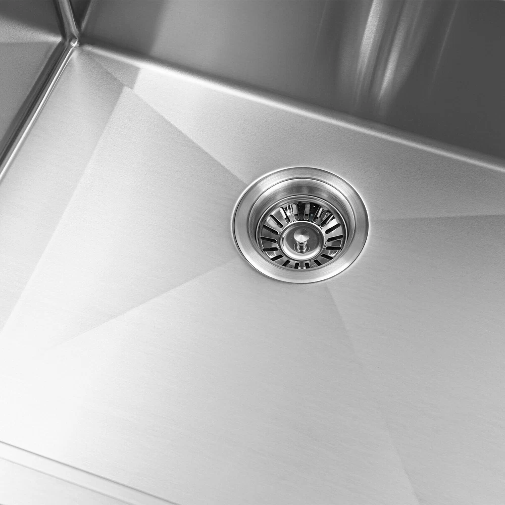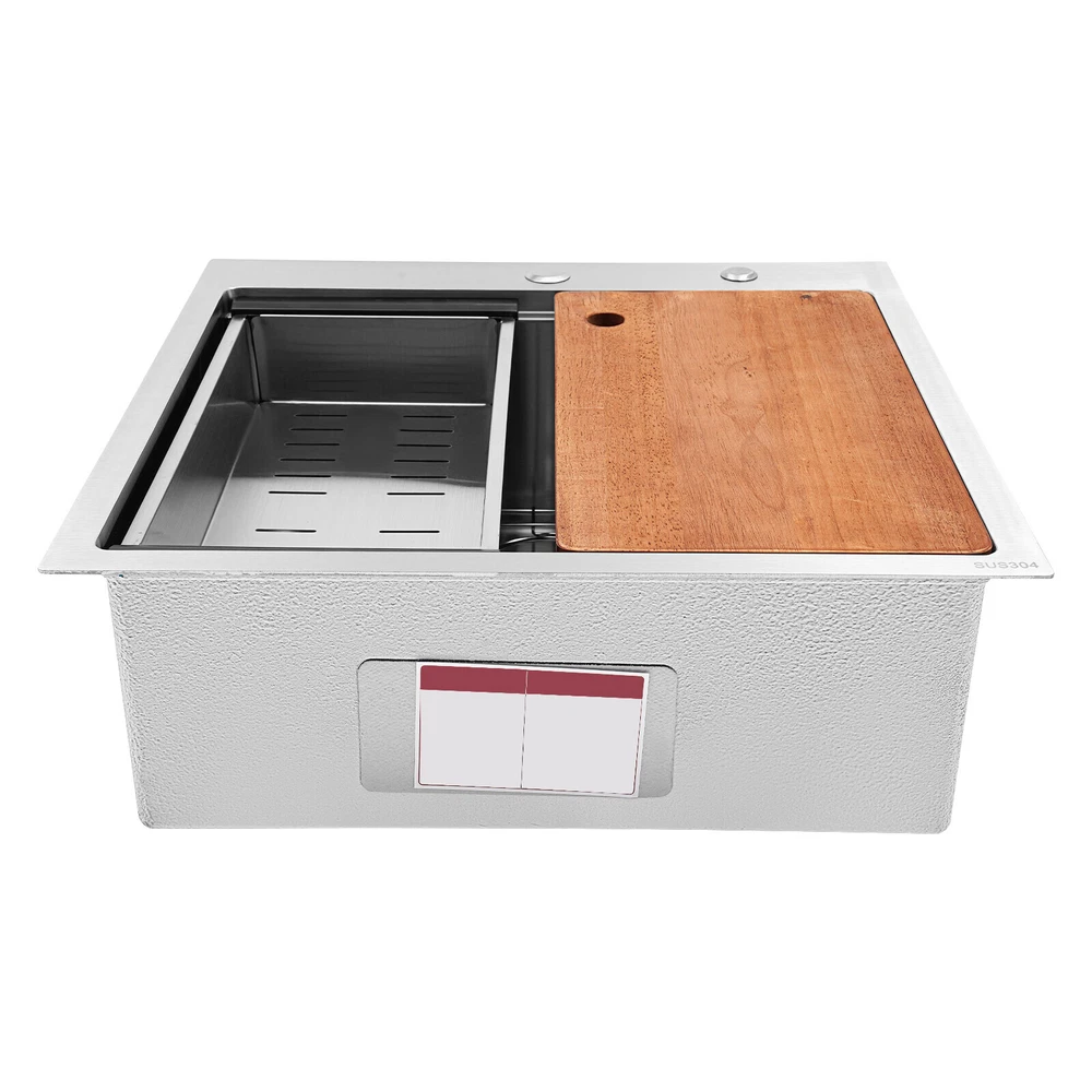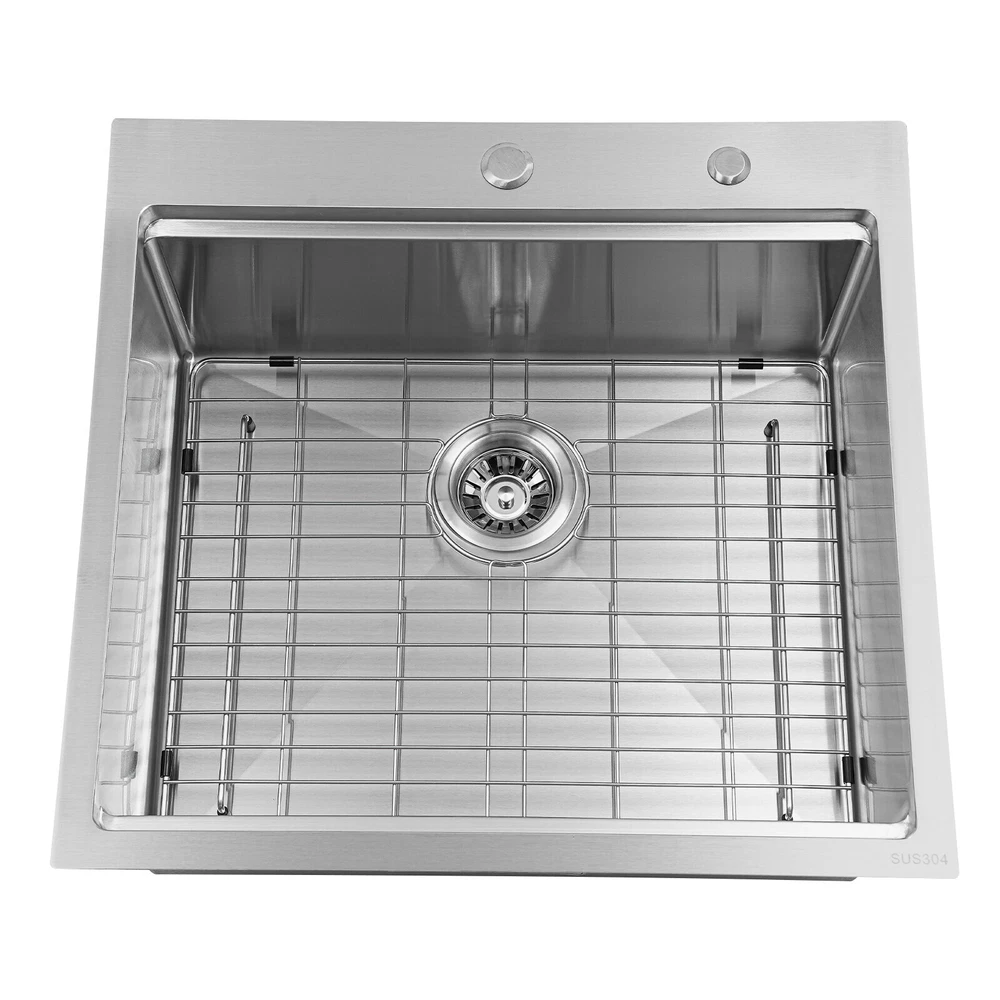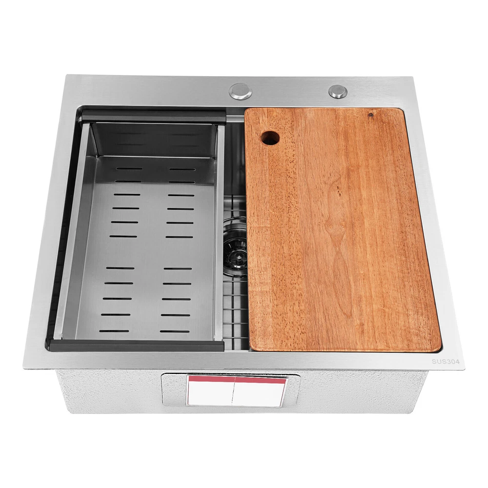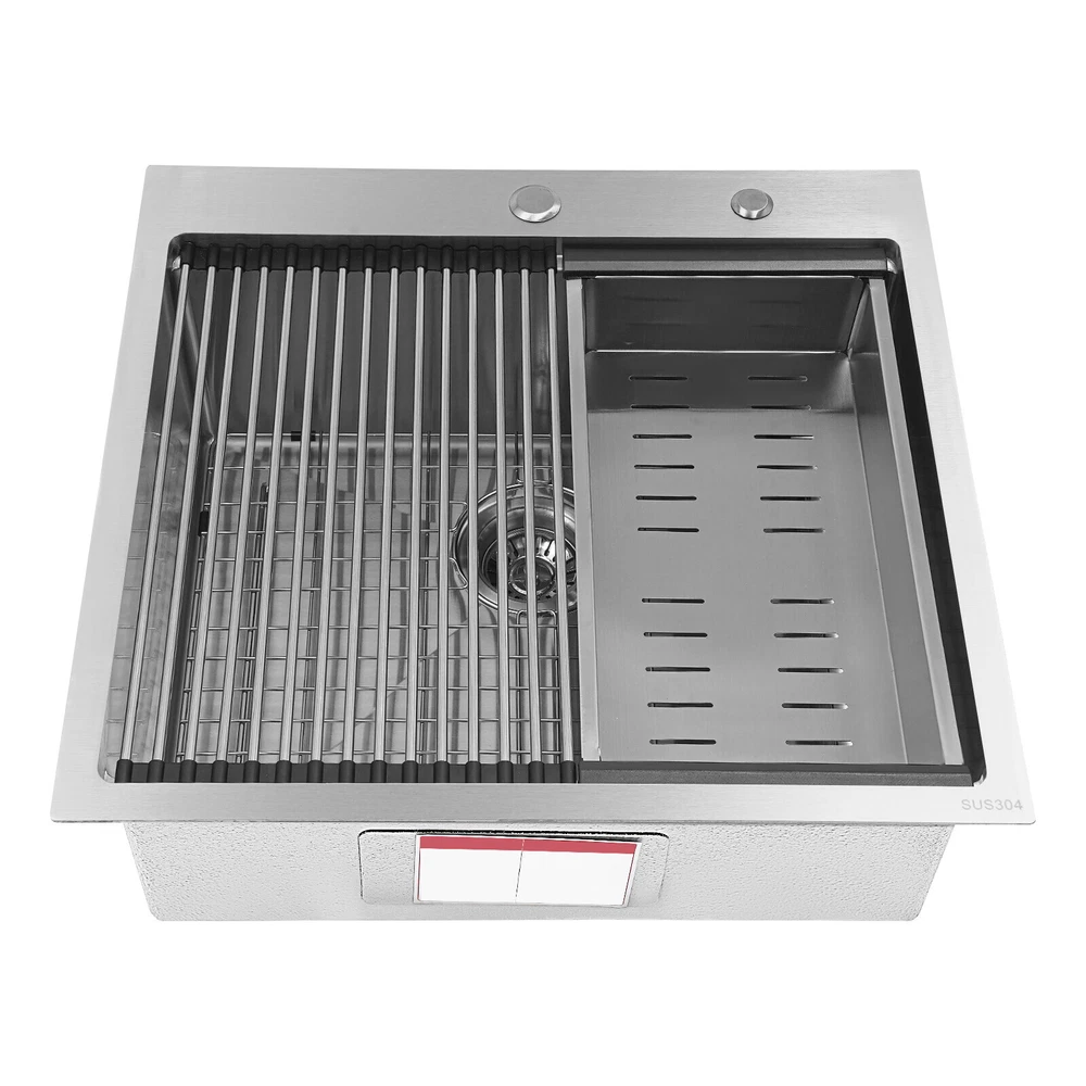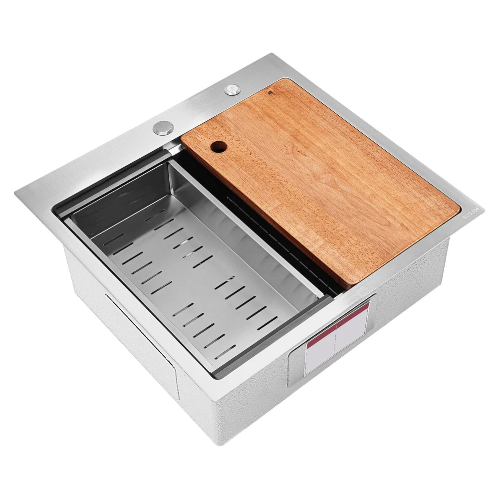 Application It can be widely used in homes, restaurants, laundries, basements, bars, kitchens, food trucks, dessert stores, coffee shops, hotels, garages, gardens, etc. for washing dishes and cutting vegetables and fruits. Specification Material: 304 Stainless Steel Color: Silver Style: Modern Process: Brushed Shape: Rectangular Mount Type: Topmount, Undermount, Flushmount Assembly Required: Yes Thickness: 100mm/0.39in Drain Hole Diameter: 8.9cm/3.5in Cutting Board Size: 45*25cm/17.7*10in Drainage Frame Size: 45*24*6cm/17.7*9.4*2.4in Product Size: 58.4*55.8*22cm/23*22*8.7in Package Size: 63*50*28cm/24.8*19.69*11.02in Gross Weight: 11kg/24.25lbs Net Weight: 10.2kg/22.49lbs Kitchen Sink 23 x 22 Inch Drop-in Bar Sink Stainless Steel Topmount Kitchen Sink welcome~ Description Made of high-quality 304 stainless steel, this kitchen sink is exquisitely crafted, wear- resistant , and corrosion- resistant . Its enlarged and deepened sink not only alleviates the splashing problem but also increases space utilization for cleaning numerous cookwares. The design with a cutting board, bottom rinse grid, roll-up dish drying rack and drainage frame allows you to wash and cut fruits and vegetables simultaneously, with which you can enjoy a more convenient life. Key Features Strong and Durable: Made of premium 304 stainless steel through the brushed process, it is corrosion and heat- resistant and will remain as good as new for a long time, even in the face of frequent daily use and all kinds of kitchen utensils collision. Space Optimization: The workstation sink is designed to hold the cutting board and drainage frame on a single track, maximizing the available space on the countertop. Large Capacity: Its large size ( 23*22in ) allows you to clean large amounts of plates, dishes, and pots, and wash fruits, and vegetables at one time without splashing, saving time. Life Assistant: This sink with a cutting board, bottom rinse grid, roll-up dish drying rack and drainage frame cleverly combines washing and meal preparation functions, allowing you to enjoy a convenient life. Invisible and Beautiful: It supports three mount types: top mount, flush mount, and under mount, which will not affect the aesthetics when the sink is flush with the countertop, and the smooth lines and low-key silver-colored appearance can also add a touch of simplicity and elegance to the kitchen. Hassle-free Cleaning: The brushed surface is not easy to leave marks, you can remove surface dust and grease by wiping with a damp cloth and detergent (not included). User Friendly: The rubber mute mat can effectively reduce the noise generated by the faucet water release and the collision of dishes, creating a quiet kitchen environment. The anti-condensation coating effectively prevents excessive temperature differences and protects the cabinet from moisture. Rapid Drainage: The X-shaped water guidelines and enlarged 3.5-inch drain hole help drain water quickly. The equipped drainage frame also ensures that the kitchen is dry and hygienic. Customer Service: We aim to provide quality products and services. If you have any problems, please feel free to contact us. We will reply to you and solve the problem for you as soon as possible. Details Rounded Corners: They are not easy to leave hygiene blind spots, making it convenient for you to clean the sink. Bottom Rinse Grid: With protective covers, it can prevent scratches on the kitchen utensils and sink. Utensils can be placed on the rinse grid for fast drainage. Roll-up Dish Drying Rack: It facilitates you to quickly clean your cookware and drain the bowl quickly to prevent bacteria growth. Hanging Hole: It is convenient for you to hang the cutting board freely in your kitchen after use to keep it dry and hygienic. Application It can be widely used in homes, restaurants, laundries, basements, bars, kitchens, food trucks, dessert stores, coffee shops, hotels, garages, gardens, etc. for washing dishes and cutting vegetables and fruits. Specification Material: 304 Stainless Steel Color: Silver Style: Modern Process: Brushed Shape: Rectangular Mount Type: Topmount, Undermount, Flushmount Assembly Required: Yes Thickness: 100mm/0.39in Drain Hole Diameter: 8.9cm/3.5in Cutting Board Size: 45*25cm/17.7*10in Drainage Frame Size: 45*24*6cm/17.7*9.4*2.4in Product Size: 58.4*55.8*22cm/23*22*8.7in Package Size: 63*50*28cm/24.8*19.69*11.02in Gross Weight: 11kg/24.25lbs Net Weight: 10.2kg/22.49lbs Package Included 1* Stainless Steel Kitchen Sink 1* Cutting Board 1* Bottom Rinse Grid 1* Strainer 1* Drainage Frame 1* Roll-up Dish Drying Rack All Accessories for Use Notes Please check the style and size before purchasing. Please do not scratch its surface with sharp objects to prolong its service life. If you want to get a better installation effect, we suggest you ask professional workers to install it. Please allow the slight color difference caused by the shooting light and 1-3cm error due to manual measurement and make sure you do not mind before ordering. Payment Delivery details Terms of sales About us Contact us Payment We accept ebay payment 。 Fees such as import duties, taxes are not included in the item price or shipping costs. These charges are the buyer's responsibility. Delivery details Shipping: 2-9 working days to: USA Terms of sales We maintain high standards of excellence and strive for hundred percent customer satisfaction. Feedback is very important to us. We hope that you contact us immediately before you give neutral or negative feedback, so that we can address your concerns. It is impossible to address issues if we do not know about them! About us Your satis faction is our ultimate goal. We work hard to earn your trust and future business. Our certified technicians have tested each item before shipping. The unit comes with 1 year limited warranty on all manufacturing defects. a) If you receive a defective item, you may return it or ask for a discount. Please contact us within 14 days afte