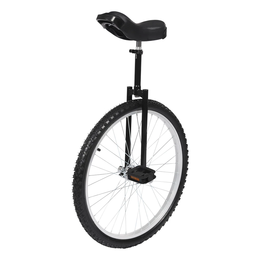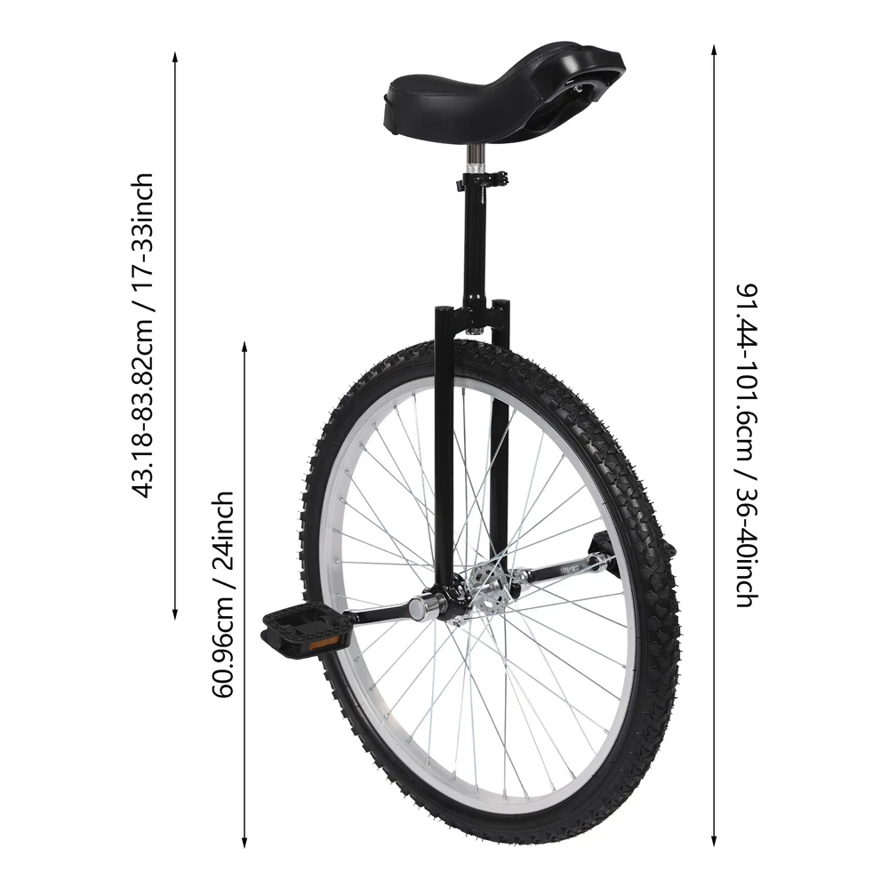 24 In Unicycle Adjustable Height Ride Bike Unisex Adult Steel Frame Bicycle Description This 24-inch unicycle will provide you with a unique fitness experience, enhancing your physical fitness while improving your riding balance. The grips on the front and back of the seat and the lightweight body make it easy to carry, allowing you to maneuver through crowded city streets or on park trails, bringing you a different travel experience. It is not only a transportation tool but also a partner to show your own style and challenging spirit. Key Features Strong and Durable: The high-quality plastic, manganese steel, and aluminum alloy are corrosion-resistant , deformation-resistant , and rust-resistant , ensuring a stable and reliable riding experience. Adjustable Design: The clamp on the seat post allows you to easily adjust the product's height from 36 to 40in, making this product suitable for people of different heights (more than 5.74ft). Stable Riding: The tire with protruding points and non-slip pedals can enhance friction, effectively increasing stability and safety while riding. Strong Load Bearing: The aluminum alloy rim and manganese steel frame provide the product with a sturdy structure to withstand 154 lbs so that you can use it with more confidence. Comfortable Riding Experience: The soft seat cushion with a curved shape adopts an ergonomic design to fit your buttocks and bring you a comfortable riding experience. Thoughtful Design: You can grab the handles at the front and rear of the seat to ensure good stability during the riding process. Clean with Ease: Its smooth surface and simple structure allow you to easily clean the product with a damp cloth (not included). Keep Health: Practicing riding the unicycle will give you a stronger workout, improve your feeling of balance, promote cerebellar development, drive brain development, enhance cardiopulmonary circulation, and keep you fit. Ideal Gift: Its stylish appearance and practical function make it an ideal birthday and Christmas gift for your friends, families, and colleagues. Guaranteed Customer Service: We aim to provide quality products and services. If you have problems, please feel free to contact us. We will reply and solve the problem for you as soon as possible. Details Knurled Seatpost: The seatpost features spiral knurling technology, which prevents the seatpost from rotating erratically and provides excellent anti-slip performance. Bur-free Edges: They are smooth to the touch and can protect your hands from getting scratched. Application It is suitable for office workers, students, cycling enthusiasts, and other people for daily fitness exercise, cycling, balance training, talent performance, etc. Specification Color: Black Material: Manganese Steel, Aluminum Alloy, Plastic, Rubber Process: Painting Saddle Length: 23cm/9.06in Wheel Diameter: 60.96cm /24in Maximum Load Bearing Capacity: 70kg/154lbs Suitable Height: > 1.75m/5.74ft Height from Saddle to Pedals: 43.18-83.82cm/17-33in Product Height: 91.44-101.6cm/36-40in Seatpost Length: About 23cm/9.06in Suitable Age: 7-60 Years Old Mount Type: Free Standing Assembly Required: Yes Package Size: 57*18*60cm/22.44*7.09*23.62in Gross Weight: 5.4kg/11.9lbs Package Included 1* Unicycle Frame 1* Unicycle Saddle 1* Wheel 2* Pedals Other Accessories for Assembly Notes Please check the size carefully before ordering. The pedal must be tightened before riding. Please note that your legs should be almost straight when you sit on the unicycle and place one foot on the lowest position of the pedals. Please insert the frame to the appropriate depth for your height and then tighten it to ensure a safe ride. It is recommended to wear a helmet, wrist guards, and elbow pads (not included) to ensure safe riding. For safety reasons, novice riders should ride under the guidance or accompaniment of an instructor. It is better to choose an open, grassy, fenced area with firm and level dirt for training. Please allow the slight color difference caused by the shooting light and 1-3cm error due to manual measurement, and make sure you do not mind before ordering. Payment Delivery details Terms of sales About us Contact us Payment We accept ebay payment 。 Fees such as import duties, taxes are not included in the item price or shipping costs. These charges are the buyer's responsibility. Delivery details Shipping: 2-9 working days to: USA Terms of sales We maintain high standards of excellence and strive for hundred percent customer satisfaction. Feedback is very important to us. We hope that you contact us immediately before you give neutral or negative feedback, so that we can address your concerns. It is impossible to address issues if we do not know about them! About us Your satis faction is our ultimate goal. We work hard to earn your trust and future business. Our certified technicians have tested each item before shipping. The unit comes with 1 year limited warranty on all manufacturing defects. a) If you receive a defective item, you may return it or ask for a discount. Please contact us within 14 days after you receive the package. b) What you returned must be intact and in its original packaging as re? u. Customer is responsible for shipping costs of the returned item. c) We will cover the cost of shipping back t with the shipping rate indicated in the registration page. We will send you a new unit or refund the full payment you paid. Thank you. Contact us Business Hour Business Hour: Monday To Friday: 8:30 AM to 5:00 PM (Beijing China time) Due to time zones, our reply to your questions may not be immediately. But within above working time, we will reply your email within 24 hours. If it's non-workdays, please kindly be patient and wait till Monday. Please contact us with ebay message. Please feel free to contact us if you have any questions. Monday To Friday: 8:30 AM to 5:00 PM (Beijing China time) Due to time zones, our reply to your questions may not be immediately. But within abo